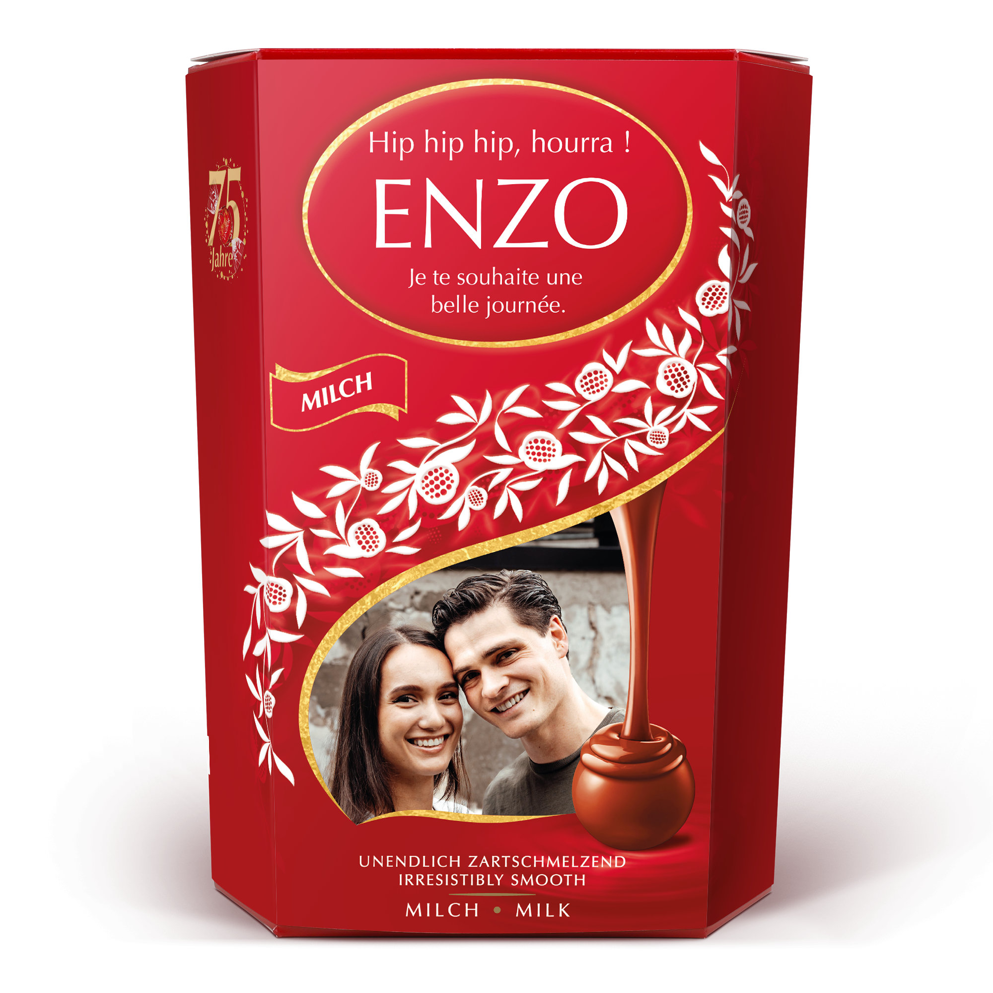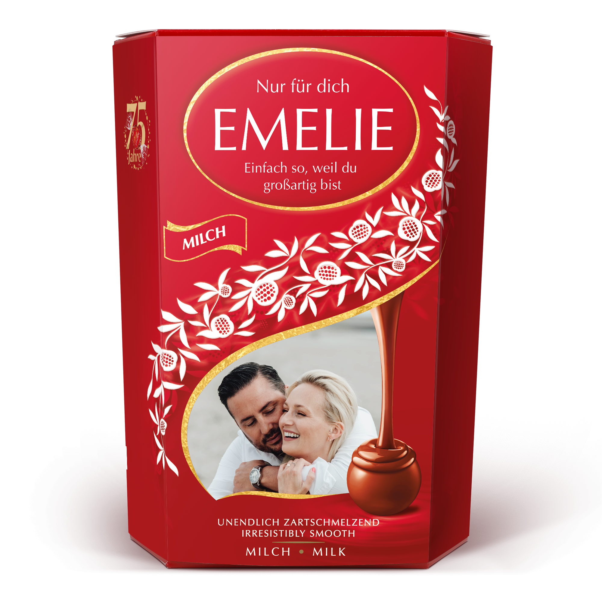 Więcej informacji o pudełku prezentowym Lindt Chocolate: Czekolada: mleczna czekolada Lindor z gładkim, rozpływającym się nadzieniem Waga: 500 gramów Wymiary: 14,4 x 8,3 x 19,5 cm Personalizacja: zdjęciem, imieniem i osobistym przesłaniem Nadruk: idealny i pełnokolorowy Ze względów technicznych niestety nie jest możliwe dodawanie znaków cyrylicy, arabskich ani specjalnych. Przy temperaturze zewnętrznej 25 stopni Celsjusza lub wyższej nie możemy zagwarantować jakości czekolady. Składniki: cukier, tłuszcze roślinne, masło kakaowe, miazga kakaowa, pełne mleko w proszku, laktoza, masło, odtłuszczone mleko w proszku, emulgator (lecytyna sojowa), ekstrakt słodowy, naturalne aromaty. Zawartość kakao: mleczna czekolada zawiera co najmniej 32% kakao. Stałe składniki mleka zawierają co najmniej 21% kakao. Alergeny: może zawierać orzechy laskowe i inne orzechy