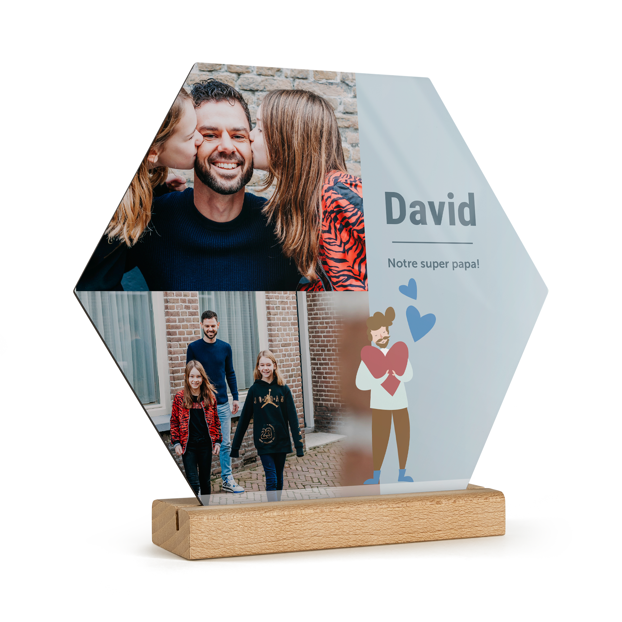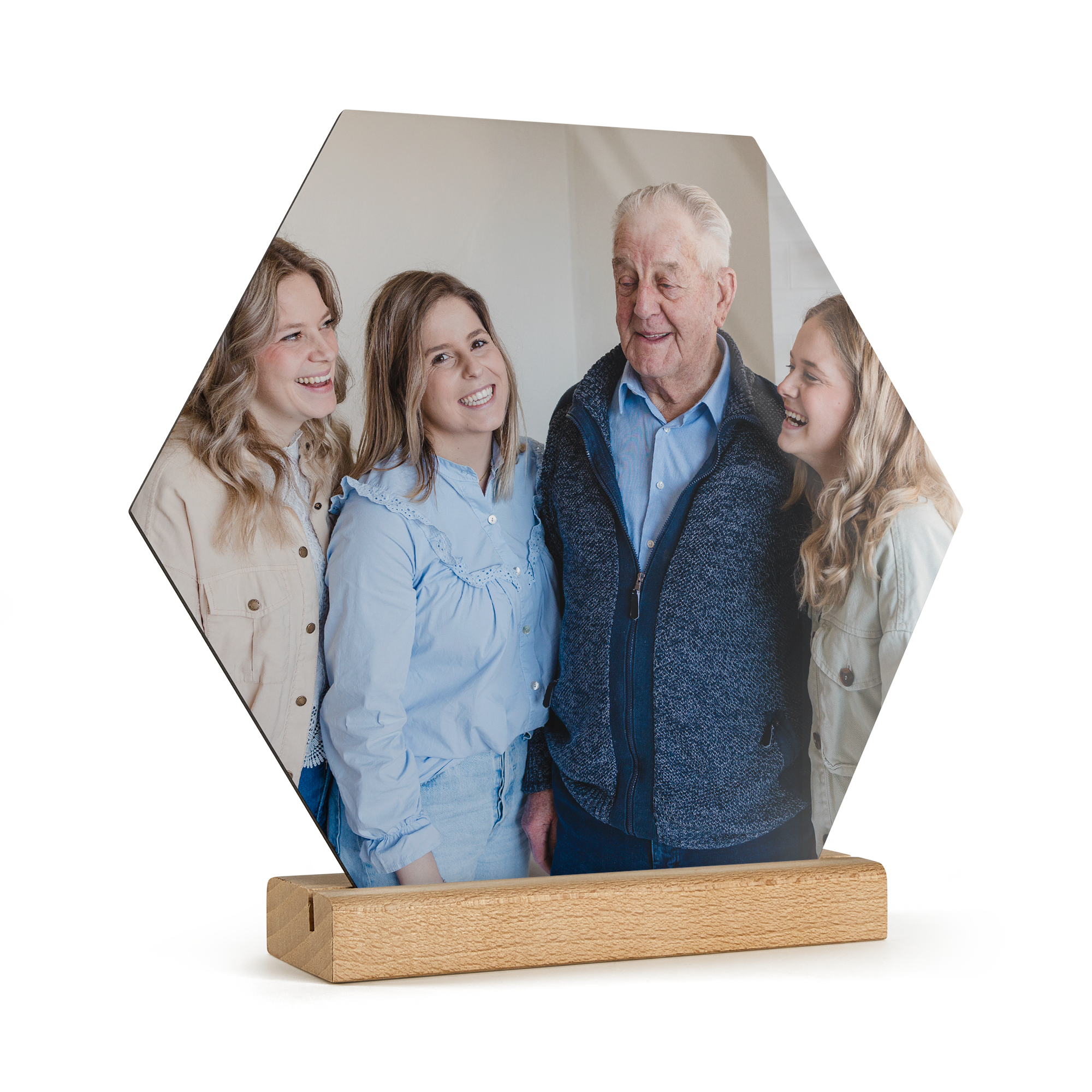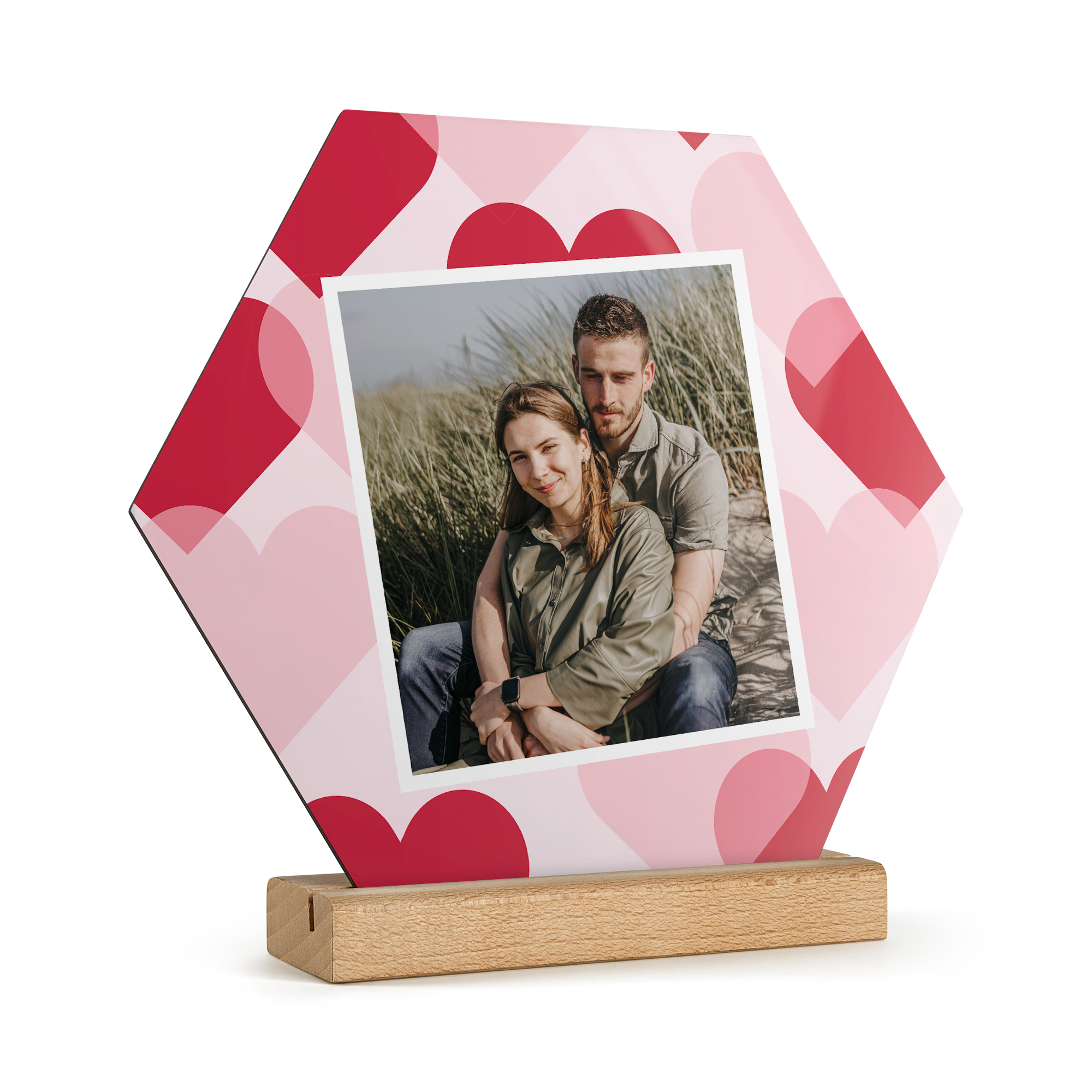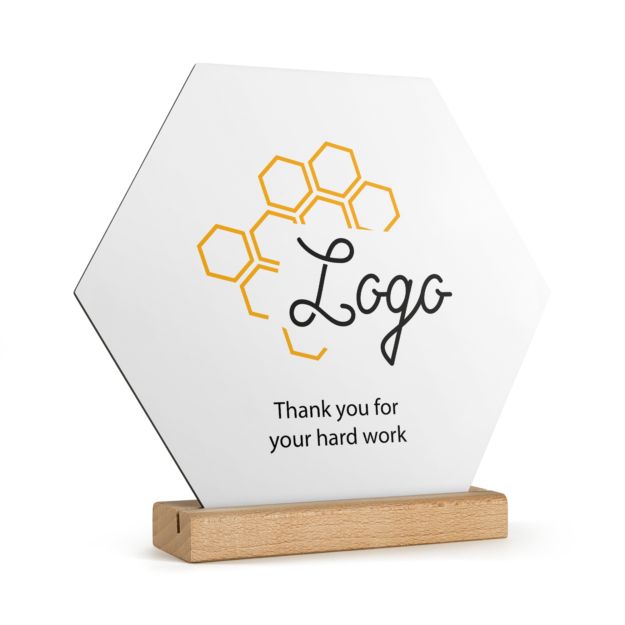 Więcej informacji o panelu drewnianym:Kształt: sześciokątMateriał: wysokiej jakości sklejkaWykończenie: błyszcząca powłokaWymiary panelu: 23 x 20 x 20 x 0,3 cmWymiary stojaka: 15 x 5 x 2 x 2 cmPersonalizacja: zdjęciem, tekstem i/lub logoNadruk: w wyraźnych, ostrych kolorach