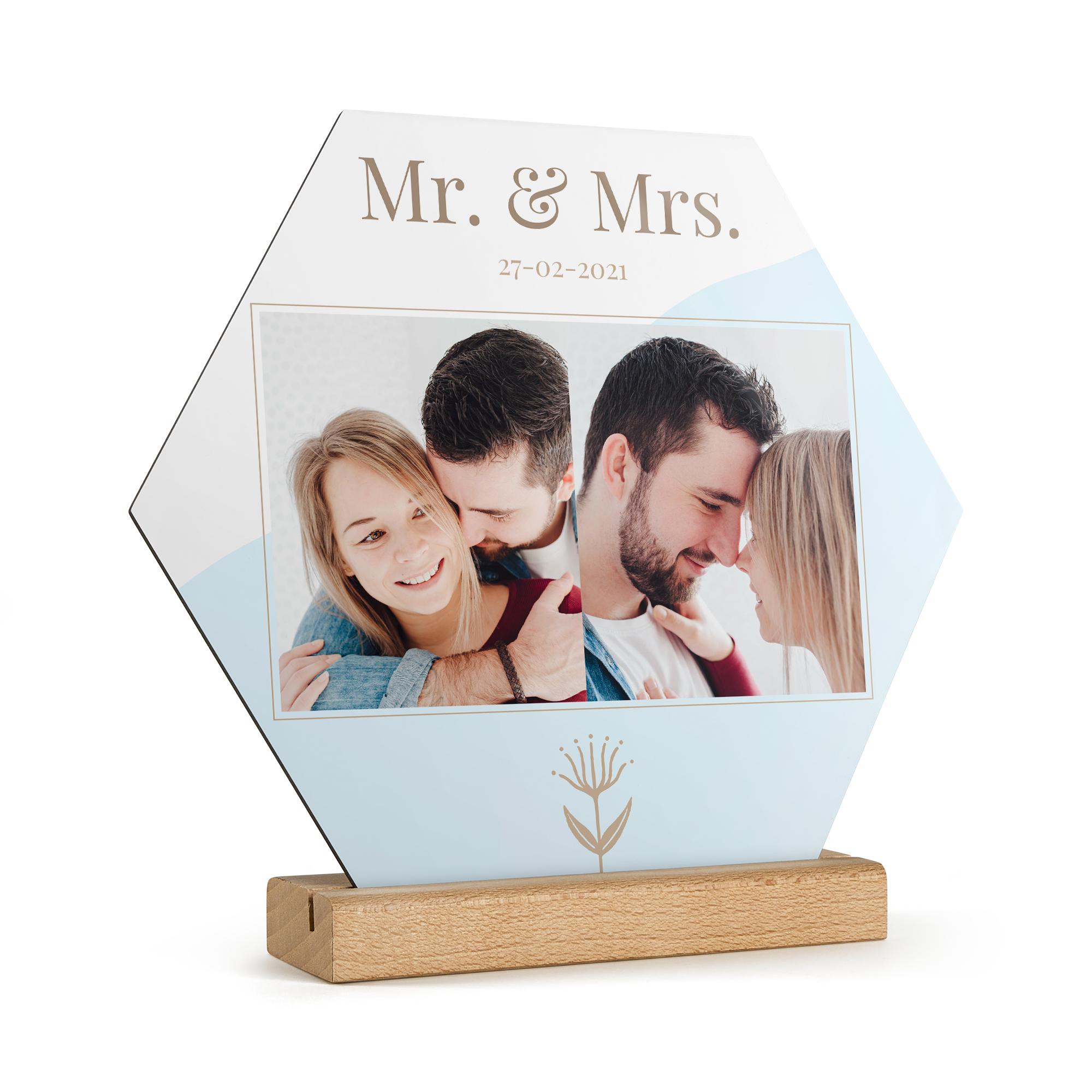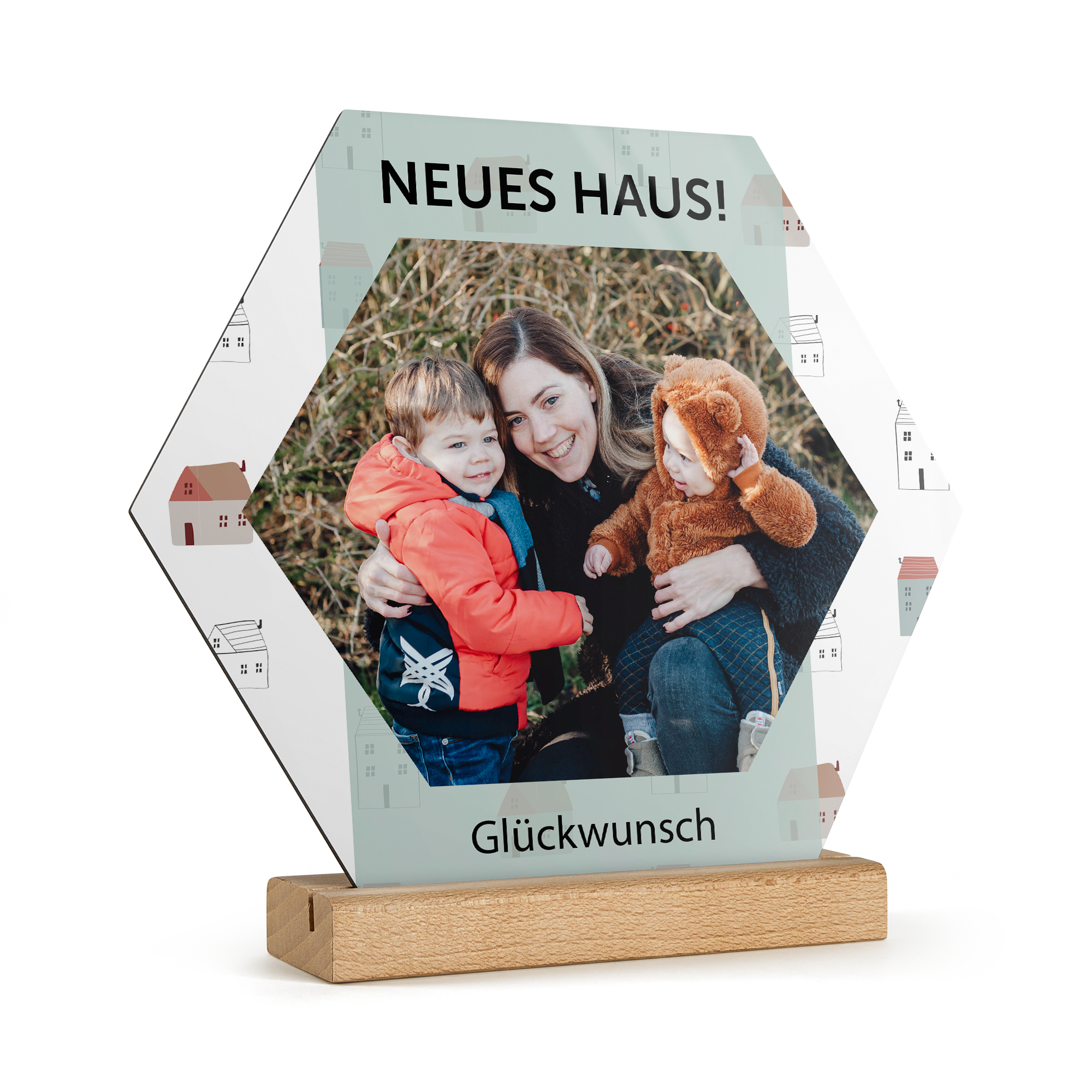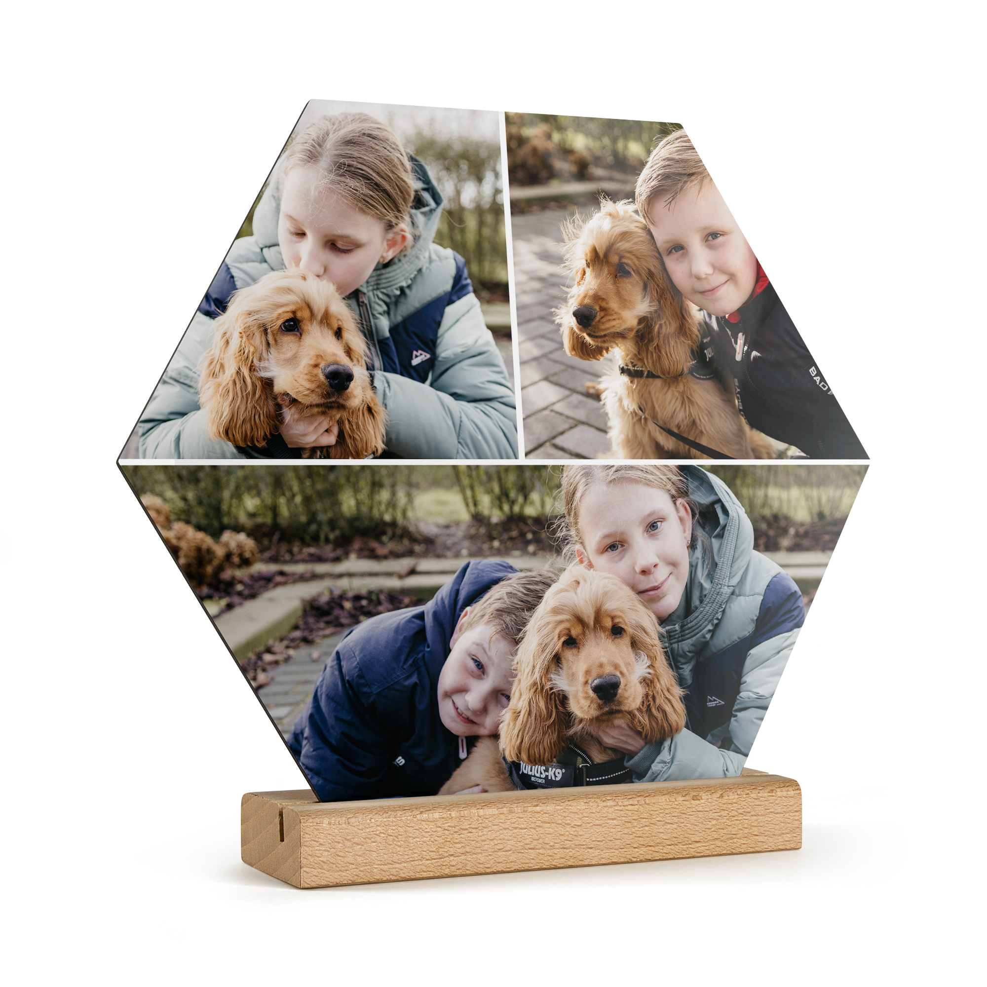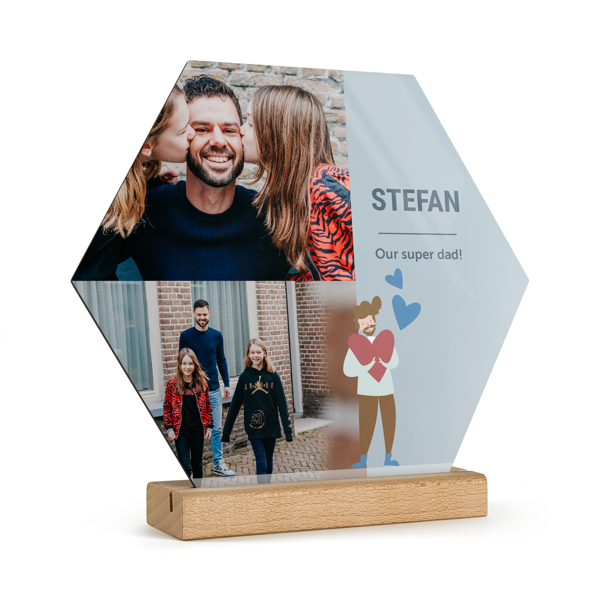 Więcej informacji o panelu drewnianym:Kształt: sześciokątMateriał: wysokiej jakości sklejkaWykończenie: błyszcząca powłokaWymiary panelu: 23 x 20 x 20 x 0,3 cmWymiary stojaka: 15 x 5 x 2 x 2 cmPersonalizacja: zdjęciem, tekstem i/lub logoNadruk: w wyraźnych, ostrych kolorach