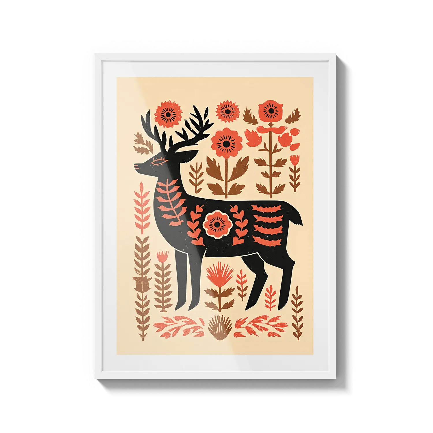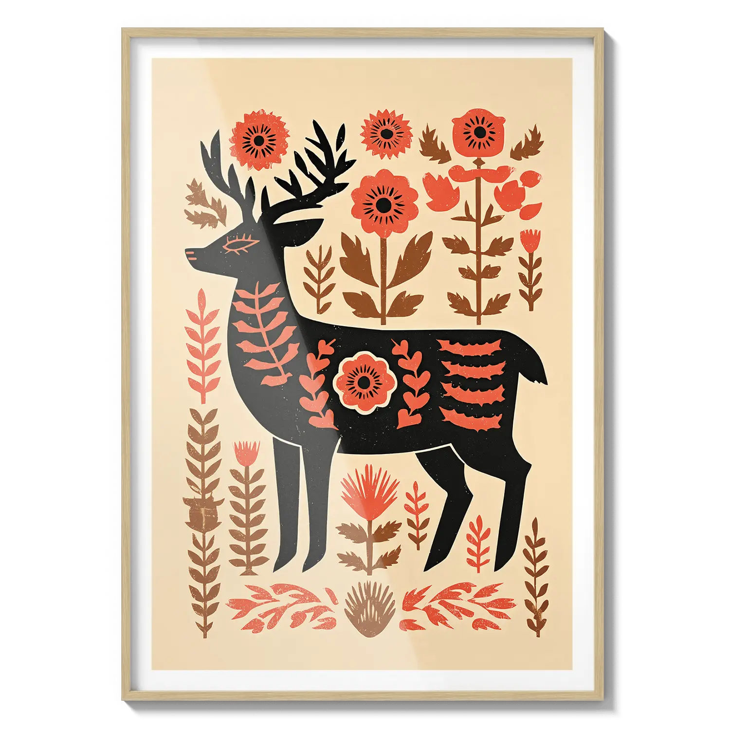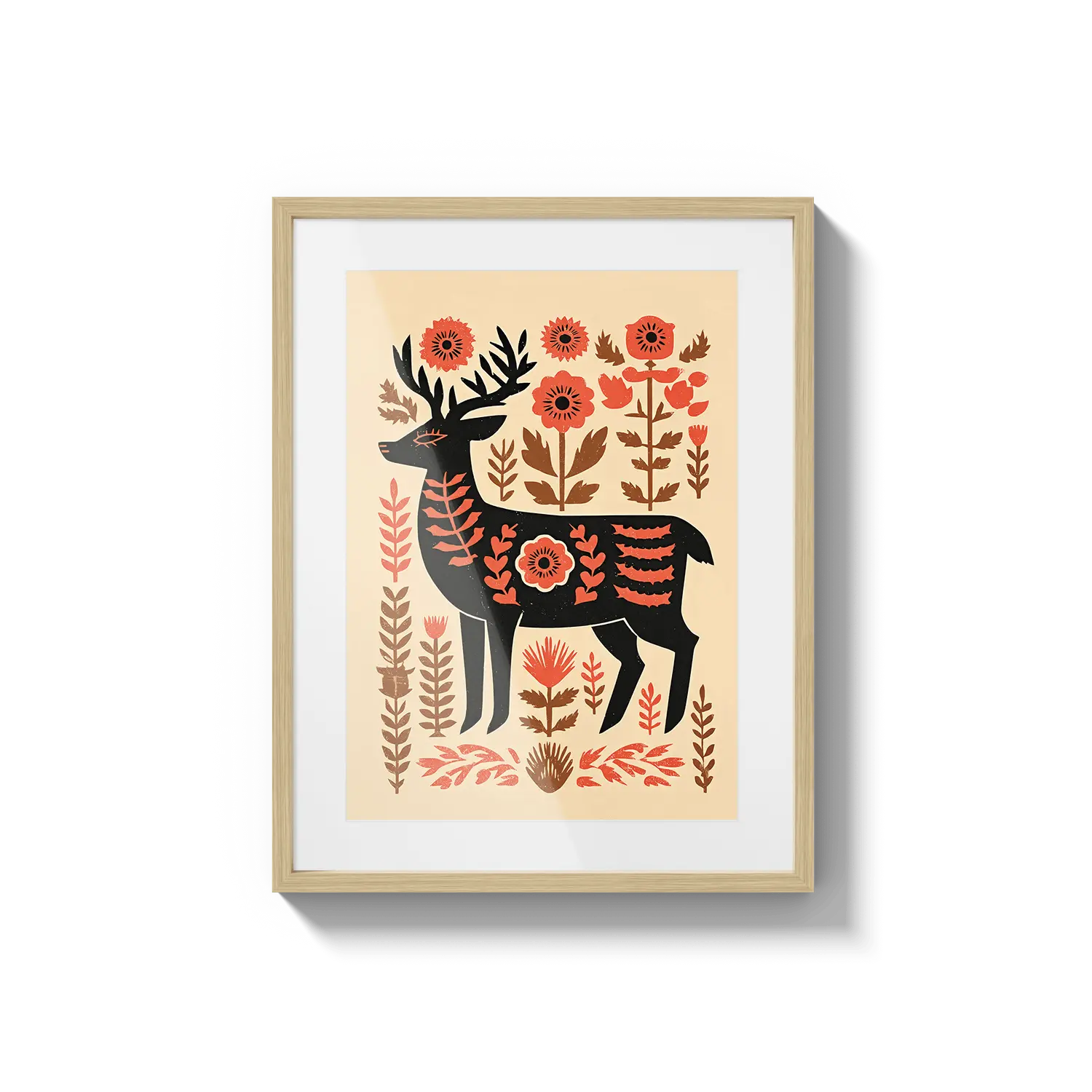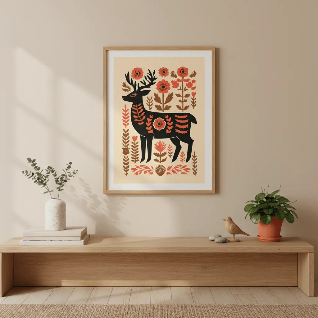 Stylizowany jeleń stoi wśród ciepłych kształtów kwiatowych, łącząc urok sztuki ludowej z delikatnymi naturalnymi odcieniami. Ta grafika wydaje się przemyślana i ciepła, to miły gest dla kogoś, kto ceni prostotę i spokojne piękno.