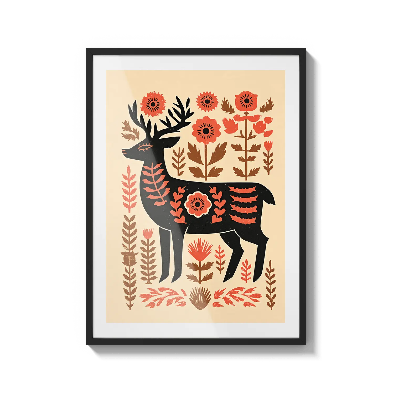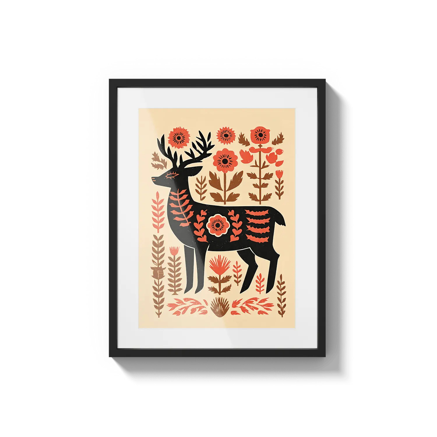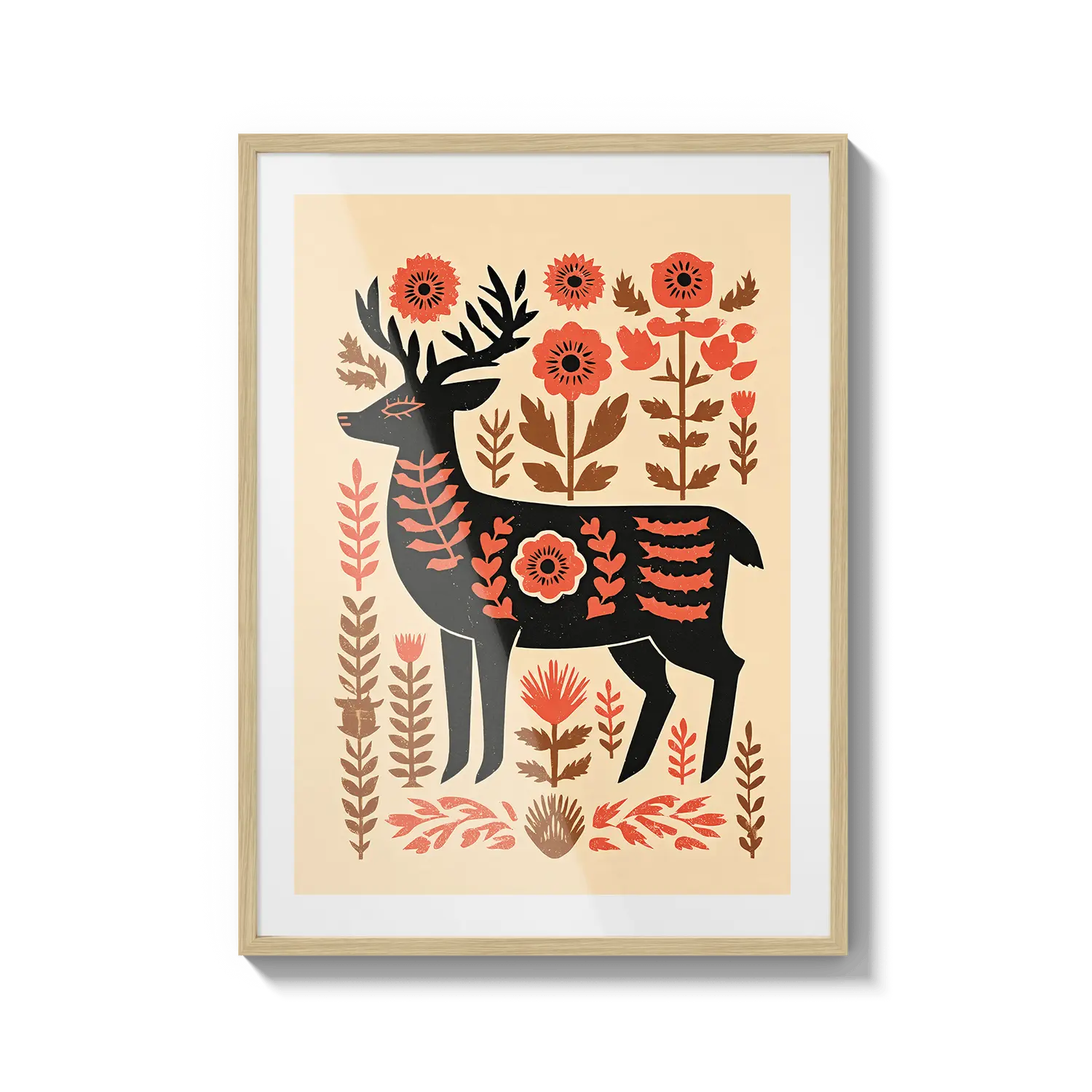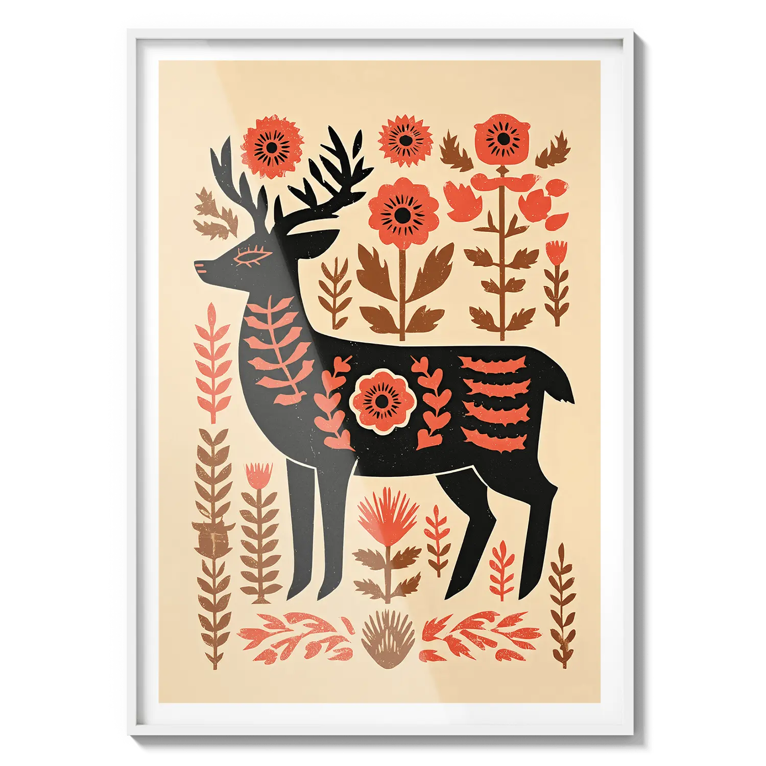 Stylizowany jeleń stoi wśród ciepłych kształtów kwiatowych, łącząc urok sztuki ludowej z delikatnymi naturalnymi odcieniami. Ta grafika wydaje się przemyślana i ciepła, to miły gest dla kogoś, kto ceni prostotę i spokojne piękno.