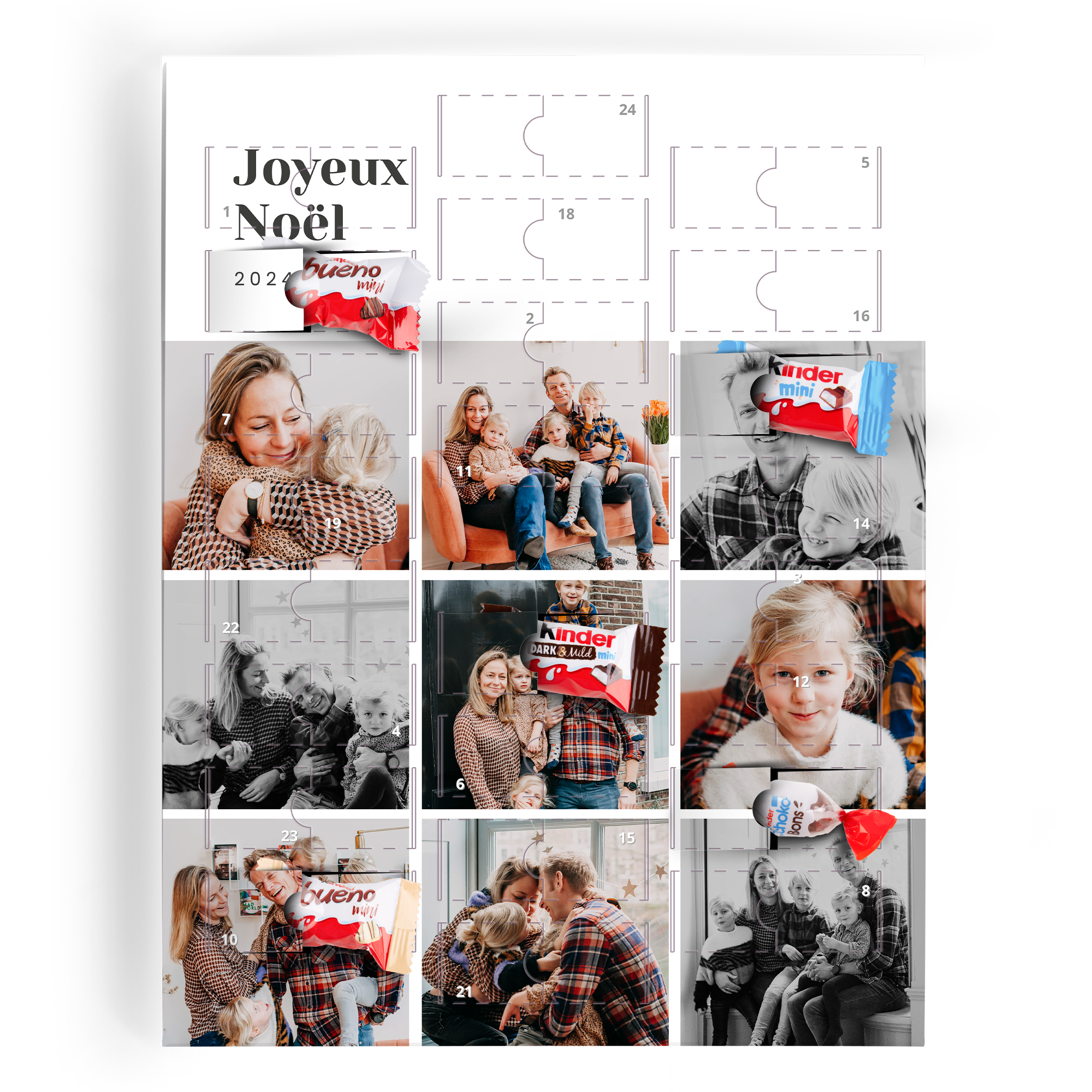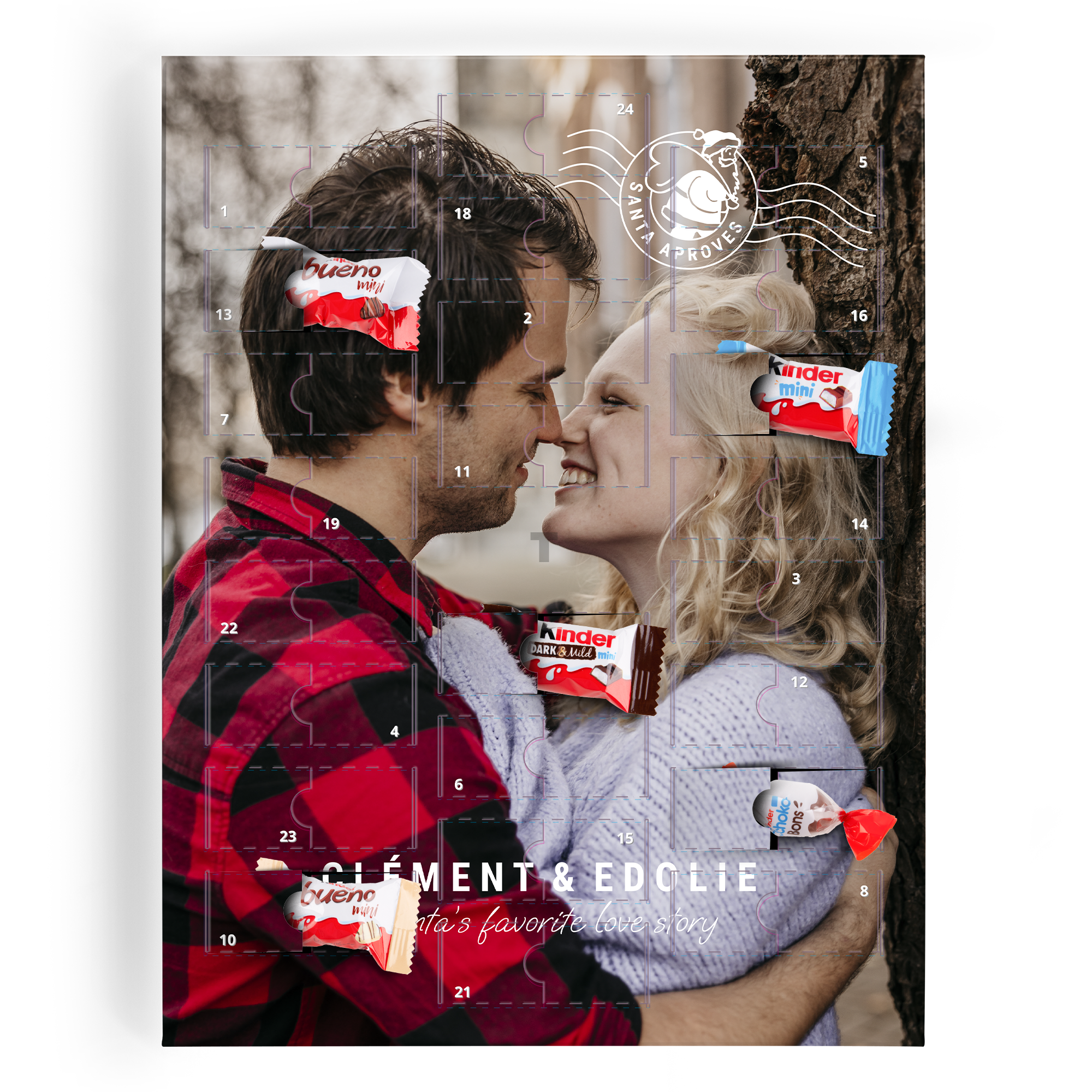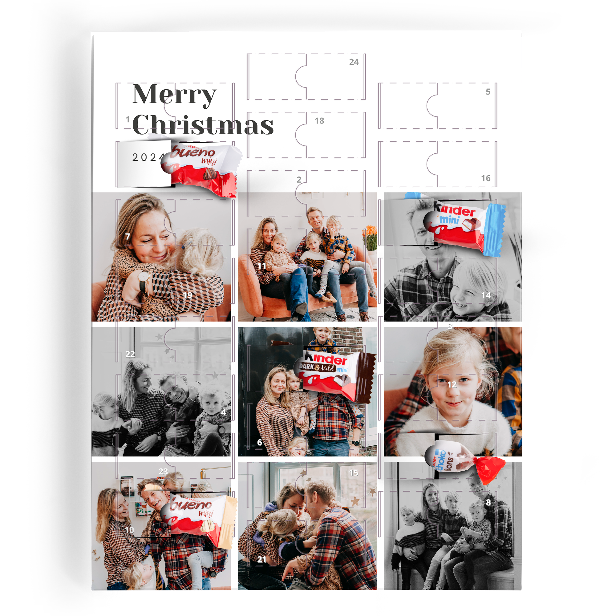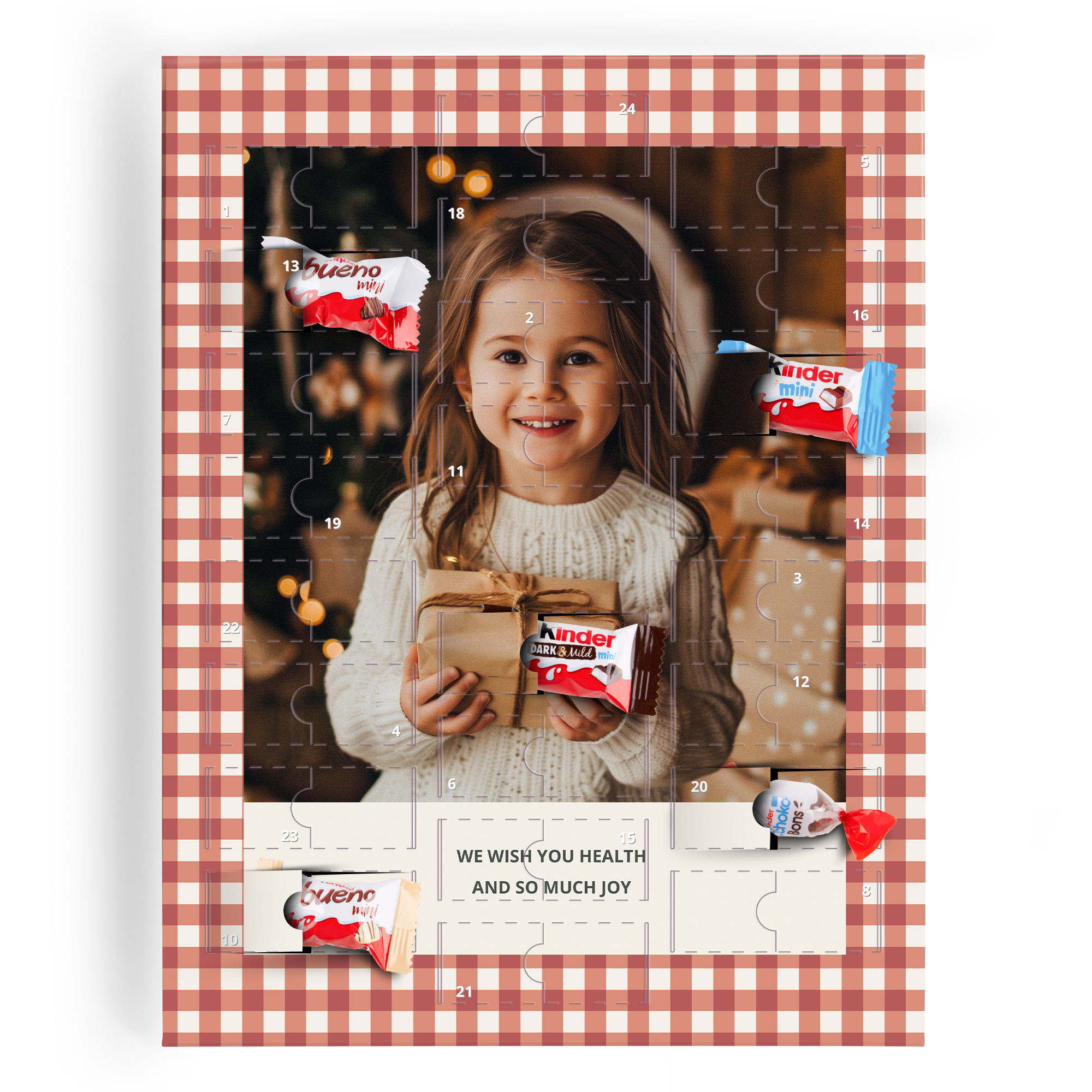 Spersonalizowany kalendarz adwentowy ze zdjęciem, imieniem i/lub wybranym tekstem, z 24 pysznymi czekoladkami kinder Happy Moments.Więcej informacji na temat spersonalizowanego kalendarza adwentowego kinder Happy Moments:Zawiera: 24 pyszne czekoladki kinderNadzienie: Kinder Happy Moments mini mixWymiary: 23,7 x 30,5 x 2,5 cmLiczba dni: 24 (1–24 grudnia)Personalizacja: imieniem, zdjęciem i/lub logoDruk: pełnokolorowyZ przyczyn technicznych nie jest możliwe użycie znaków cyrylicy, arabskich, azjatyckich, greckich ani znaków specjalnych.Składniki: czekolada kinder Chocolate Mini Superior MILK 40% (cukier, MLEKO w proszku, masło kakaowe, miazga kakaowa, emulgatory: lecytyna [SOJA]; wanilina), cukier, odtłuszczone MLEKO w proszku, olej palmowy, KONCENTRAT MASŁA, emulgatory: lecytyna [SOJA]; wanilina. Pełny skład produktu: Produkty mleczne 33% (odtłuszczone MLEKO w proszku, MLEKO w proszku 27,4%, KONCENTRAT MASŁA 5,6%), kakao 13%. Kinder Schoko-Bons Superior Czekolada MLECZNA 50% (Cukier, MLEKO w proszku, masło kakaowe, miazga kakaowa, emulgatory: lecytyny [SOJA]; wanilina), cukier, odtłuszczone MLEKO w proszku, olej palmowy, ORZECHY LASKOWE 5,8%, KONCENTRAT MASŁA, gorzka czekolada (cukier, miazga kakaowa, masło kakaowe, emulgatory: lecytyny [SOJA]; aromaty), substancje glazurujące (guma arabska, szelak), syrop glukozowy, emulgatory: lecytyny [SOJA]; aromaty, Pełny skład produktu: Produkty mleczne 28% (odtłuszczone MLEKO w proszku, MLEKO w proszku 24,3%, KONCENTRAT MASŁA 3,7%), kakao 16,5%. Kinder Chocolate with Cereals Mini Superior Czekolada mleczna 37,5% (Cukier, masło kakaowe, MLEKO w proszku, miazga kakaowa, emulgatory: lecytyna [SOJA]; wanilina), cukier, odtłuszczone MLEKO w proszku, olej palmowy, KONCENTRAT MASŁA, JĘCZMIEŃ, ryż, PSZENICA, PSZENICA (orkisz), emulgatory: lecytyna [SOJA]; GRYKA, wanilina, Pełny skład produktu: Produkty mleczne 30,5% (odtłuszczone MLEKO w proszku, MLEKO w proszku 25,4%, KONCENTRAT MASŁA 5,1%), zboża 6%. Kinder Bueno Mini Czekolada MLECZNA 31% (Cukier, masło kakaowe, miazga kakaowa, odtłuszczone MLEKO w proszku, KONCENTRAT MASŁA, lecytyny [SOJA]; wanilina), cukier, olej palmowy, MĄKA PSZENNA, ORZECHY LASKOWE 10,8%, odtłuszczone MLEKO w proszku, MLEKO w proszku, gorzka czekolada (Cukier, miazga kakaowa, masło kakaowe, emulgatory: lecytyny [SOJA]; wanilina), odtłuszczone kakao, emulgatory: lecytyny [SOJA], substancje spulchniające (wodorowęglan sodu, węglan amonu), sól, wanilina. Pełny skład produktu: Produkty MLECZNE 19% (odtłuszczone MLEKO w proszku, MLEKO w proszku: 18%, KONCENTRAT MASŁA 1%). Kinder Bueno White Mini Biała czekolada 29,5% (masło kakaowe, cukier, odtłuszczone MLEKO w proszku, KONCENTRAT MASŁA, emulgatory: lecytyna [SOJA]; wanilina), cukier, olej palmowy, PSZENNA PSZENNA, ORZECHY LASKOWE 10,8%, odtłuszczone MLEKO w proszku, MLEKO w proszku, MLECZNA czekolada (cukier, masło kakaowe, miazga kakaowa, odtłuszczone MLEKO w proszku, KONCENTRAT MASŁA, emulgatory: lecytyna [SOJA]; wanilina), odtłuszczone kakao, emulgatory: lecytyna [SOJA], substancje spulchniające (wodorowęglan sodu, węglan amonu), sól, wanilina. Pełny skład produktu: Produkty MLECZNE 23% ((odtłuszczone MLEKO w proszku, MLEKO w proszku 22%, KONCENTRAT MASŁA 1%).