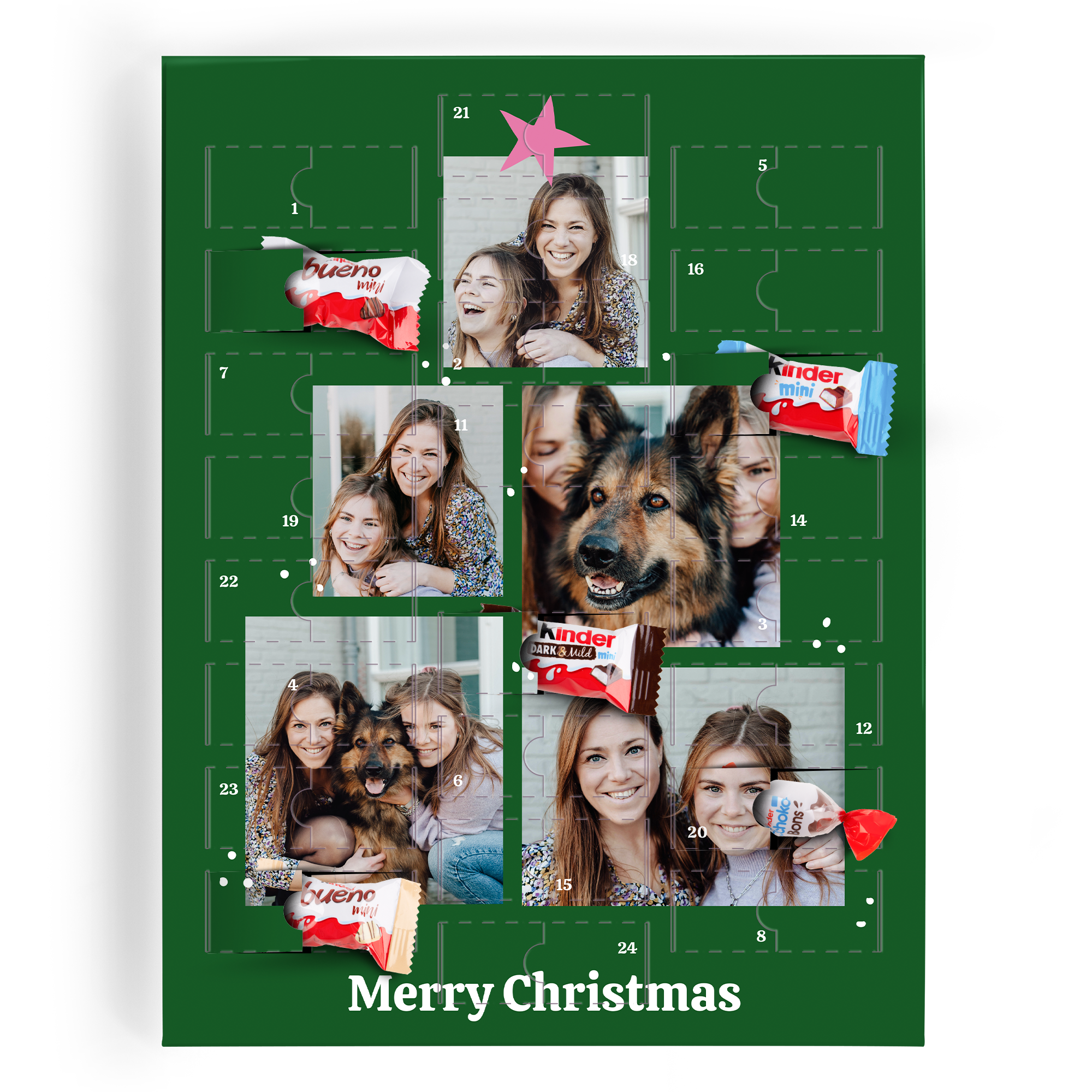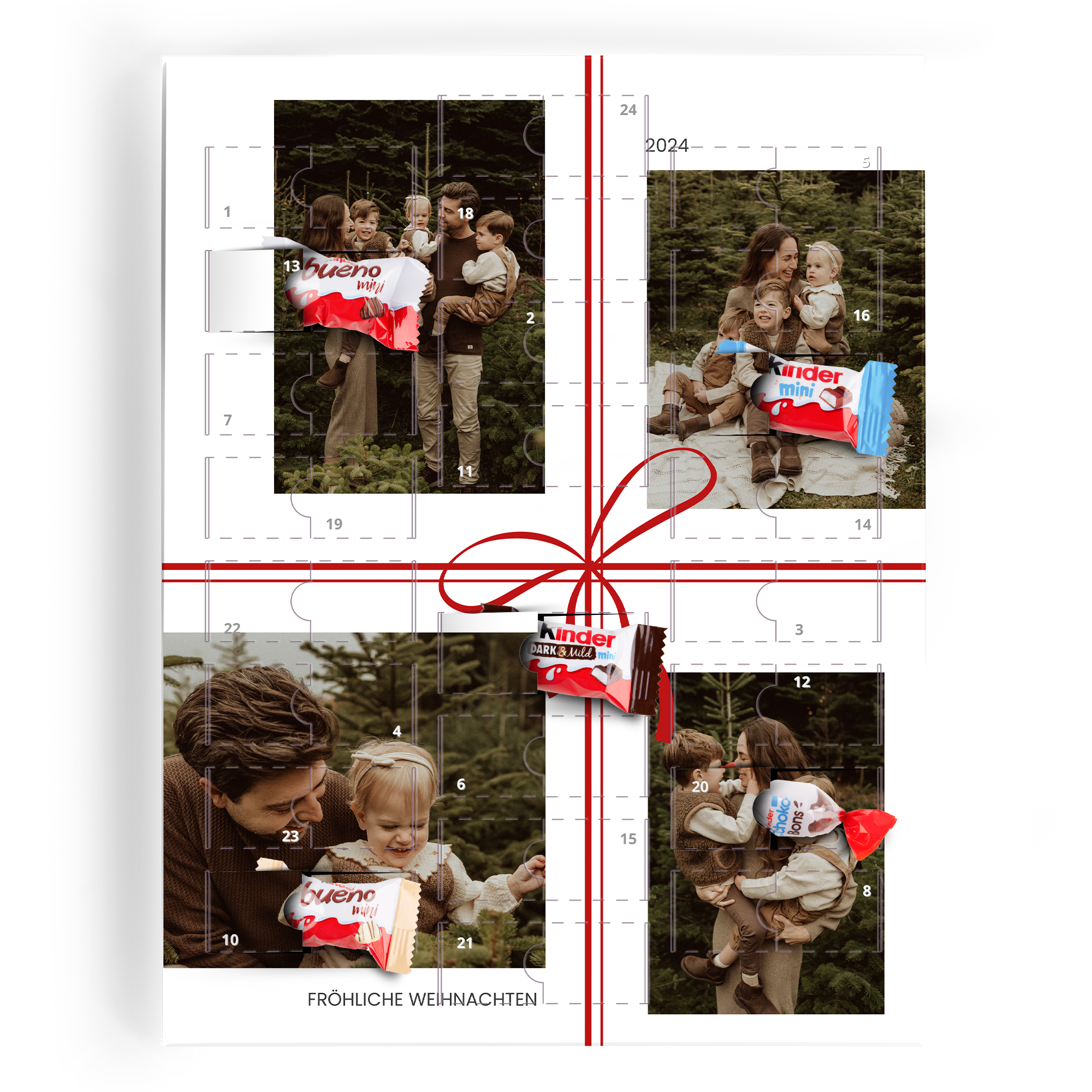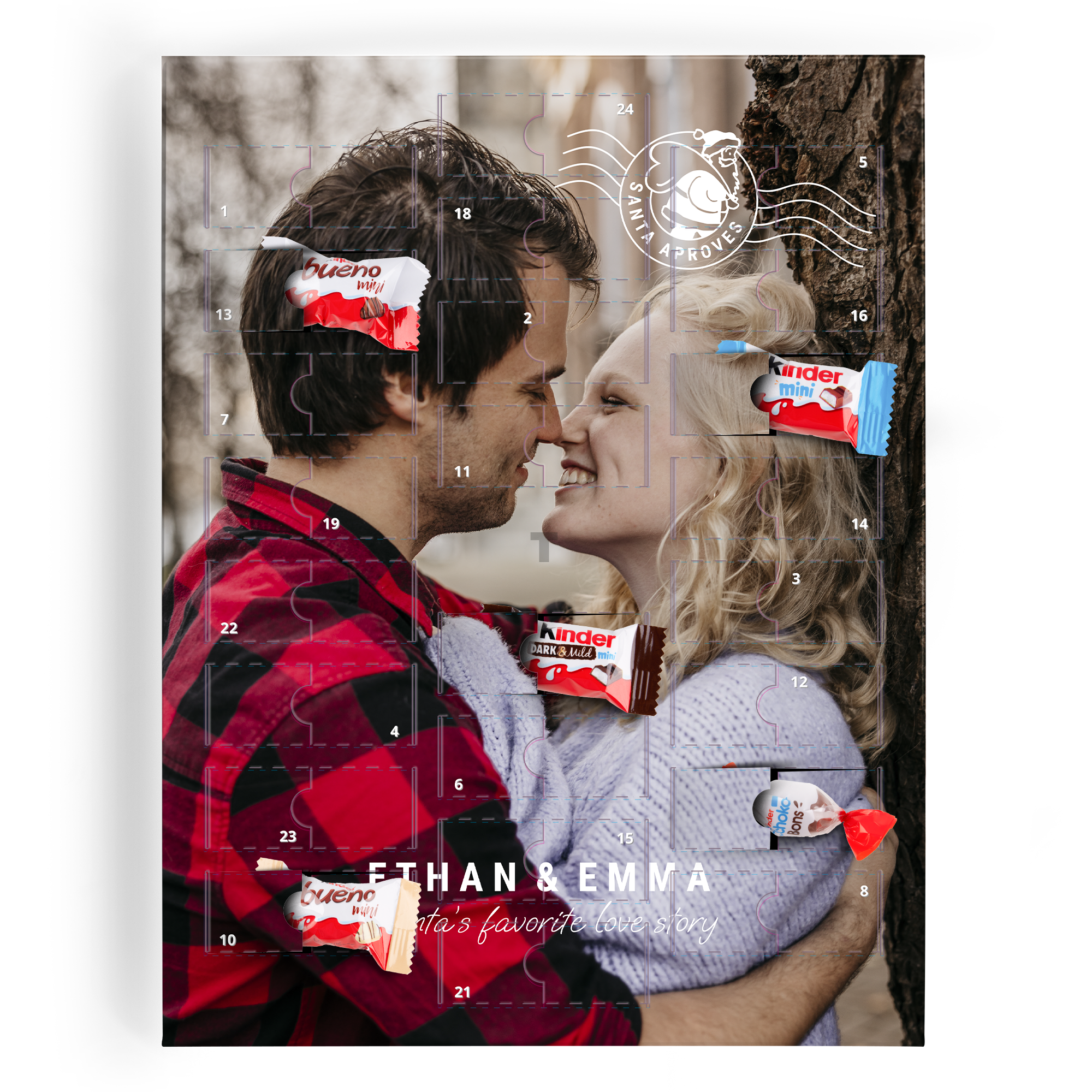 Spersonalizowany kalendarz adwentowy ze zdjęciem, imieniem i/lub wybranym tekstem, z 24 pysznymi czekoladkami kinder Happy Moments.Więcej informacji na temat spersonalizowanego kalendarza adwentowego kinder Happy Moments:Zawiera: 24 pyszne czekoladki kinderNadzienie: Kinder Happy Moments mini mixWymiary: 23,7 x 30,5 x 2,5 cmLiczba dni: 24 (1–24 grudnia)Personalizacja: imieniem, zdjęciem i/lub logoDruk: pełnokolorowyZ przyczyn technicznych nie jest możliwe użycie znaków cyrylicy, arabskich, azjatyckich, greckich ani znaków specjalnych.Składniki: czekolada kinder Chocolate Mini Superior MILK 40% (cukier, MLEKO w proszku, masło kakaowe, miazga kakaowa, emulgatory: lecytyna [SOJA]; wanilina), cukier, odtłuszczone MLEKO w proszku, olej palmowy, KONCENTRAT MASŁA, emulgatory: lecytyna [SOJA]; wanilina. Pełny skład produktu: Produkty mleczne 33% (odtłuszczone MLEKO w proszku, MLEKO w proszku 27,4%, KONCENTRAT MASŁA 5,6%), kakao 13%. Kinder Schoko-Bons Superior Czekolada MLECZNA 50% (Cukier, MLEKO w proszku, masło kakaowe, miazga kakaowa, emulgatory: lecytyny [SOJA]; wanilina), cukier, odtłuszczone MLEKO w proszku, olej palmowy, ORZECHY LASKOWE 5,8%, KONCENTRAT MASŁA, gorzka czekolada (cukier, miazga kakaowa, masło kakaowe, emulgatory: lecytyny [SOJA]; aromaty), substancje glazurujące (guma arabska, szelak), syrop glukozowy, emulgatory: lecytyny [SOJA]; aromaty, Pełny skład produktu: Produkty mleczne 28% (odtłuszczone MLEKO w proszku, MLEKO w proszku 24,3%, KONCENTRAT MASŁA 3,7%), kakao 16,5%. Kinder Chocolate with Cereals Mini Superior Czekolada mleczna 37,5% (Cukier, masło kakaowe, MLEKO w proszku, miazga kakaowa, emulgatory: lecytyna [SOJA]; wanilina), cukier, odtłuszczone MLEKO w proszku, olej palmowy, KONCENTRAT MASŁA, JĘCZMIEŃ, ryż, PSZENICA, PSZENICA (orkisz), emulgatory: lecytyna [SOJA]; GRYKA, wanilina, Pełny skład produktu: Produkty mleczne 30,5% (odtłuszczone MLEKO w proszku, MLEKO w proszku 25,4%, KONCENTRAT MASŁA 5,1%), zboża 6%. Kinder Bueno Mini Czekolada MLECZNA 31% (Cukier, masło kakaowe, miazga kakaowa, odtłuszczone MLEKO w proszku, KONCENTRAT MASŁA, lecytyny [SOJA]; wanilina), cukier, olej palmowy, MĄKA PSZENNA, ORZECHY LASKOWE 10,8%, odtłuszczone MLEKO w proszku, MLEKO w proszku, gorzka czekolada (Cukier, miazga kakaowa, masło kakaowe, emulgatory: lecytyny [SOJA]; wanilina), odtłuszczone kakao, emulgatory: lecytyny [SOJA], substancje spulchniające (wodorowęglan sodu, węglan amonu), sól, wanilina. Pełny skład produktu: Produkty MLECZNE 19% (odtłuszczone MLEKO w proszku, MLEKO w proszku: 18%, KONCENTRAT MASŁA 1%). Kinder Bueno White Mini Biała czekolada 29,5% (masło kakaowe, cukier, odtłuszczone MLEKO w proszku, KONCENTRAT MASŁA, emulgatory: lecytyna [SOJA]; wanilina), cukier, olej palmowy, PSZENNA PSZENNA, ORZECHY LASKOWE 10,8%, odtłuszczone MLEKO w proszku, MLEKO w proszku, MLECZNA czekolada (cukier, masło kakaowe, miazga kakaowa, odtłuszczone MLEKO w proszku, KONCENTRAT MASŁA, emulgatory: lecytyna [SOJA]; wanilina), odtłuszczone kakao, emulgatory: lecytyna [SOJA], substancje spulchniające (wodorowęglan sodu, węglan amonu), sól, wanilina. Pełny skład produktu: Produkty MLECZNE 23% ((odtłuszczone MLEKO w proszku, MLEKO w proszku 22%, KONCENTRAT MASŁA 1%).