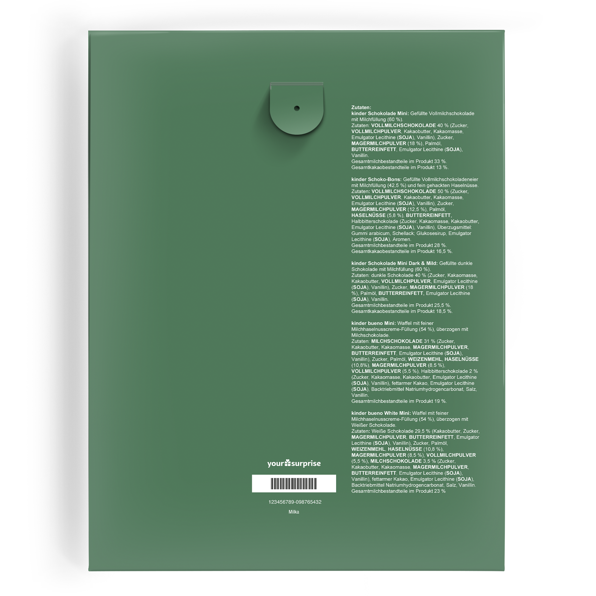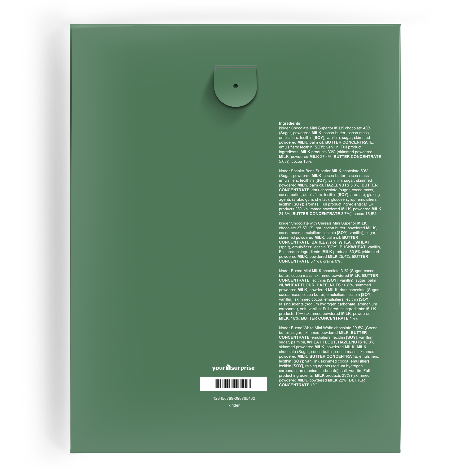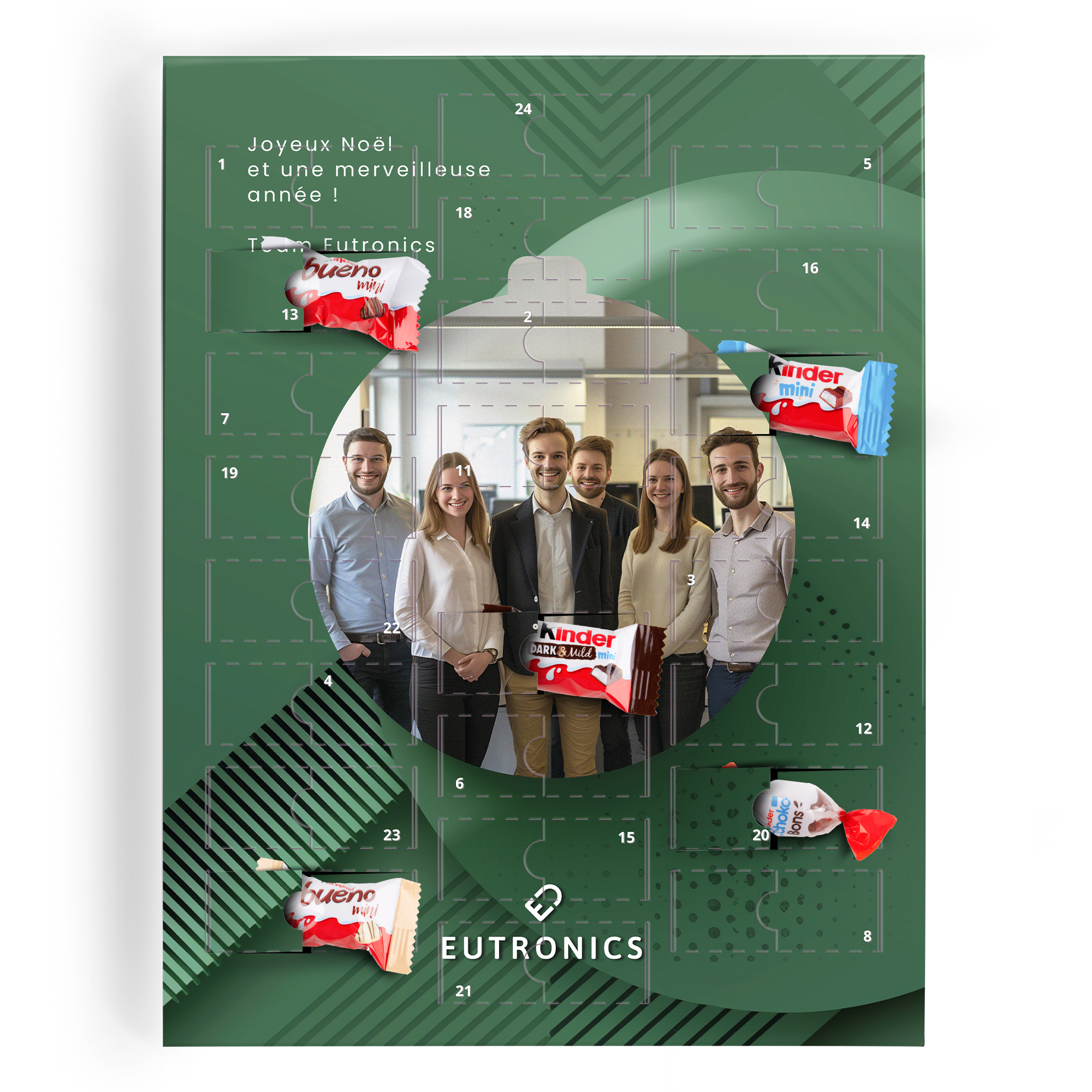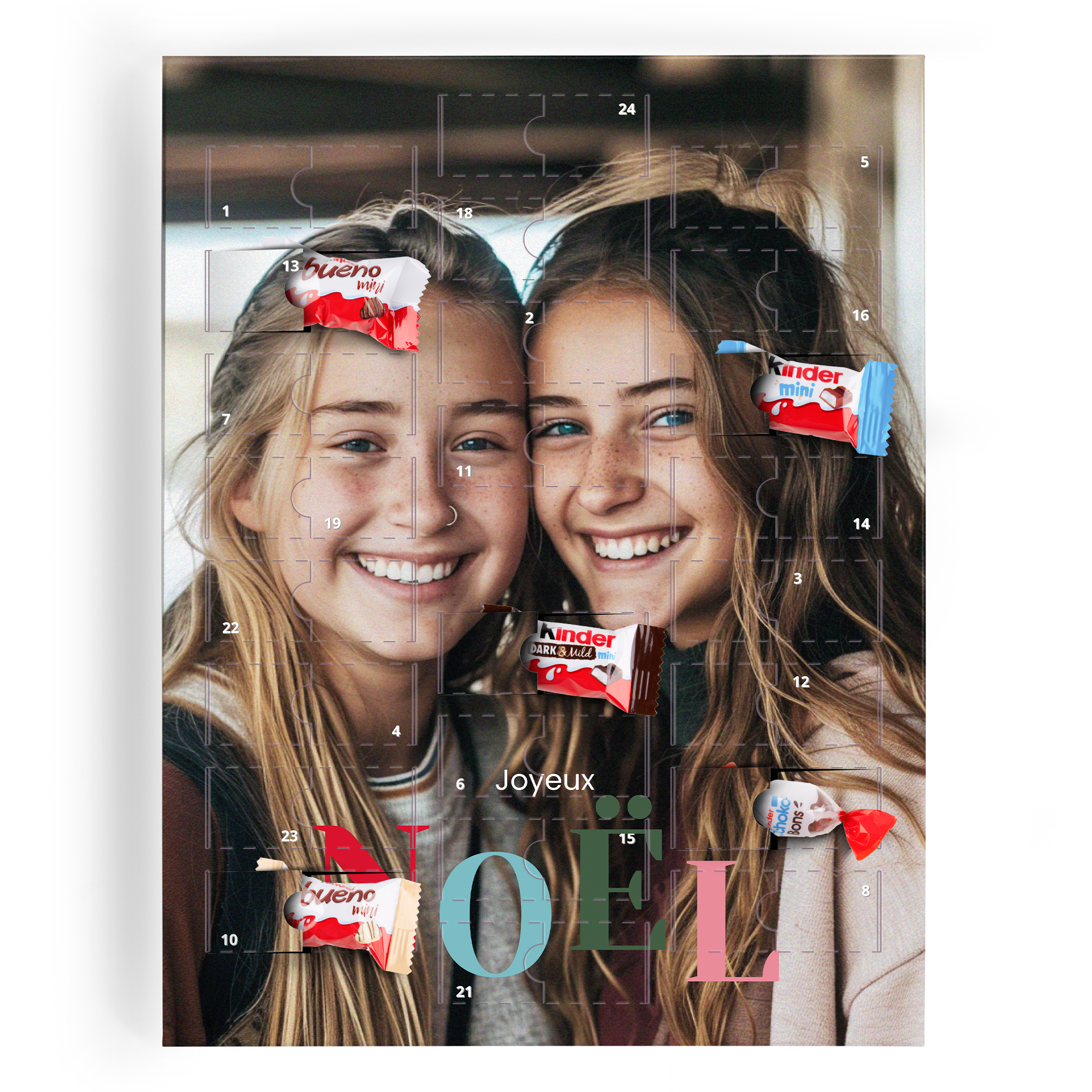 Spersonalizowany kalendarz adwentowy ze zdjęciem, imieniem i/lub wybranym tekstem, z 24 pysznymi czekoladkami kinder Happy Moments.Więcej informacji na temat spersonalizowanego kalendarza adwentowego kinder Happy Moments:Zawiera: 24 pyszne czekoladki kinderNadzienie: Kinder Happy Moments mini mixWymiary: 23,7 x 30,5 x 2,5 cmLiczba dni: 24 (1–24 grudnia)Personalizacja: imieniem, zdjęciem i/lub logoDruk: pełnokolorowyZ przyczyn technicznych nie jest możliwe użycie znaków cyrylicy, arabskich, azjatyckich, greckich ani znaków specjalnych.Składniki: czekolada kinder Chocolate Mini Superior MILK 40% (cukier, MLEKO w proszku, masło kakaowe, miazga kakaowa, emulgatory: lecytyna [SOJA]; wanilina), cukier, odtłuszczone MLEKO w proszku, olej palmowy, KONCENTRAT MASŁA, emulgatory: lecytyna [SOJA]; wanilina. Pełny skład produktu: Produkty mleczne 33% (odtłuszczone MLEKO w proszku, MLEKO w proszku 27,4%, KONCENTRAT MASŁA 5,6%), kakao 13%. Kinder Schoko-Bons Superior Czekolada MLECZNA 50% (Cukier, MLEKO w proszku, masło kakaowe, miazga kakaowa, emulgatory: lecytyny [SOJA]; wanilina), cukier, odtłuszczone MLEKO w proszku, olej palmowy, ORZECHY LASKOWE 5,8%, KONCENTRAT MASŁA, gorzka czekolada (cukier, miazga kakaowa, masło kakaowe, emulgatory: lecytyny [SOJA]; aromaty), substancje glazurujące (guma arabska, szelak), syrop glukozowy, emulgatory: lecytyny [SOJA]; aromaty, Pełny skład produktu: Produkty mleczne 28% (odtłuszczone MLEKO w proszku, MLEKO w proszku 24,3%, KONCENTRAT MASŁA 3,7%), kakao 16,5%. Kinder Chocolate with Cereals Mini Superior Czekolada mleczna 37,5% (Cukier, masło kakaowe, MLEKO w proszku, miazga kakaowa, emulgatory: lecytyna [SOJA]; wanilina), cukier, odtłuszczone MLEKO w proszku, olej palmowy, KONCENTRAT MASŁA, JĘCZMIEŃ, ryż, PSZENICA, PSZENICA (orkisz), emulgatory: lecytyna [SOJA]; GRYKA, wanilina, Pełny skład produktu: Produkty mleczne 30,5% (odtłuszczone MLEKO w proszku, MLEKO w proszku 25,4%, KONCENTRAT MASŁA 5,1%), zboża 6%. Kinder Bueno Mini Czekolada MLECZNA 31% (Cukier, masło kakaowe, miazga kakaowa, odtłuszczone MLEKO w proszku, KONCENTRAT MASŁA, lecytyny [SOJA]; wanilina), cukier, olej palmowy, MĄKA PSZENNA, ORZECHY LASKOWE 10,8%, odtłuszczone MLEKO w proszku, MLEKO w proszku, gorzka czekolada (Cukier, miazga kakaowa, masło kakaowe, emulgatory: lecytyny [SOJA]; wanilina), odtłuszczone kakao, emulgatory: lecytyny [SOJA], substancje spulchniające (wodorowęglan sodu, węglan amonu), sól, wanilina. Pełny skład produktu: Produkty MLECZNE 19% (odtłuszczone MLEKO w proszku, MLEKO w proszku: 18%, KONCENTRAT MASŁA 1%). Kinder Bueno White Mini Biała czekolada 29,5% (masło kakaowe, cukier, odtłuszczone MLEKO w proszku, KONCENTRAT MASŁA, emulgatory: lecytyna [SOJA]; wanilina), cukier, olej palmowy, PSZENNA PSZENNA, ORZECHY LASKOWE 10,8%, odtłuszczone MLEKO w proszku, MLEKO w proszku, MLECZNA czekolada (cukier, masło kakaowe, miazga kakaowa, odtłuszczone MLEKO w proszku, KONCENTRAT MASŁA, emulgatory: lecytyna [SOJA]; wanilina), odtłuszczone kakao, emulgatory: lecytyna [SOJA], substancje spulchniające (wodorowęglan sodu, węglan amonu), sól, wanilina. Pełny skład produktu: Produkty MLECZNE 23% ((odtłuszczone MLEKO w proszku, MLEKO w proszku 22%, KONCENTRAT MASŁA 1%).