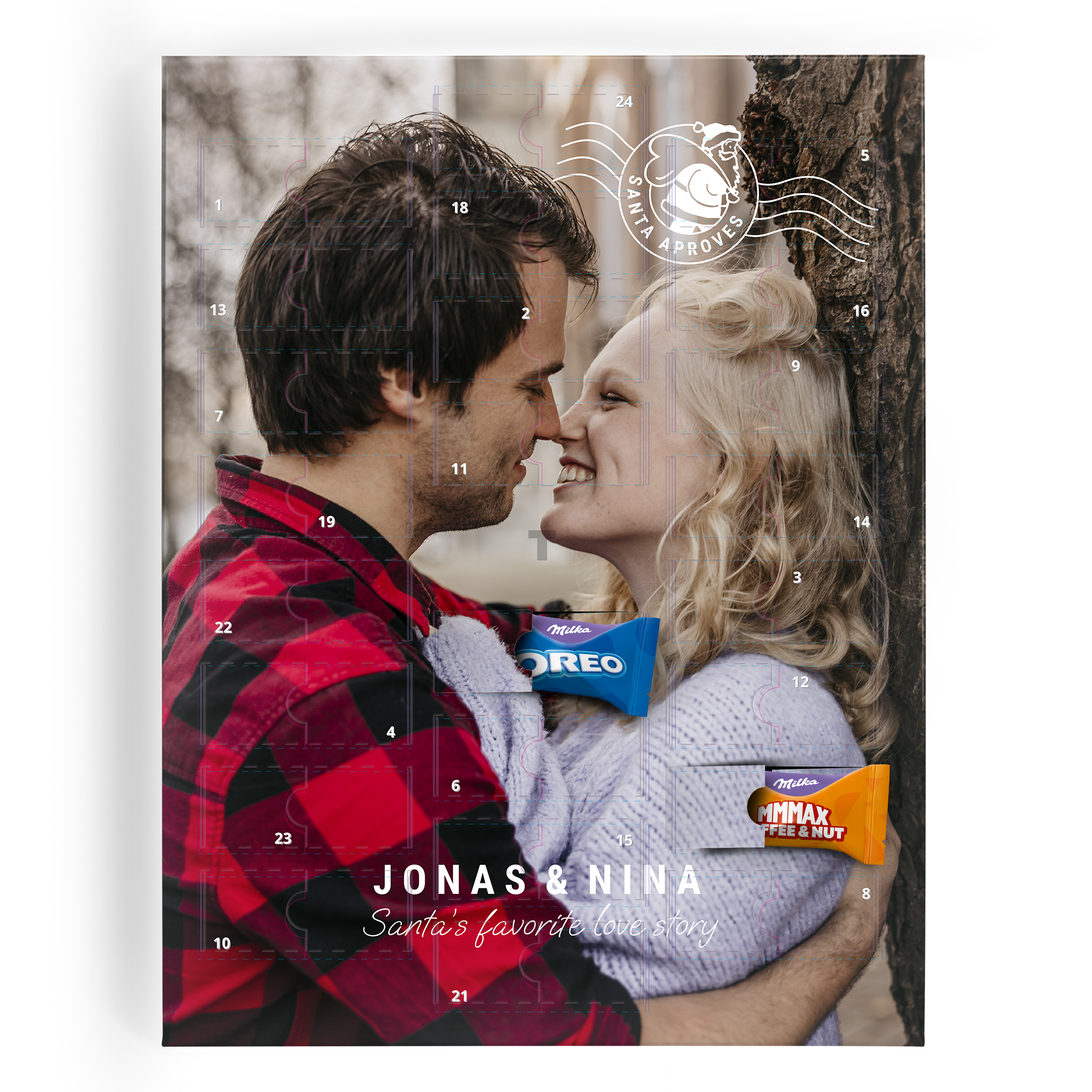 Kalendarz adwentowy ze zdjęciem, imieniem i/lub tekstem. Wypełniony 24 pysznymi czekoladkami Milka. Pyszne odliczanie do Świąt!