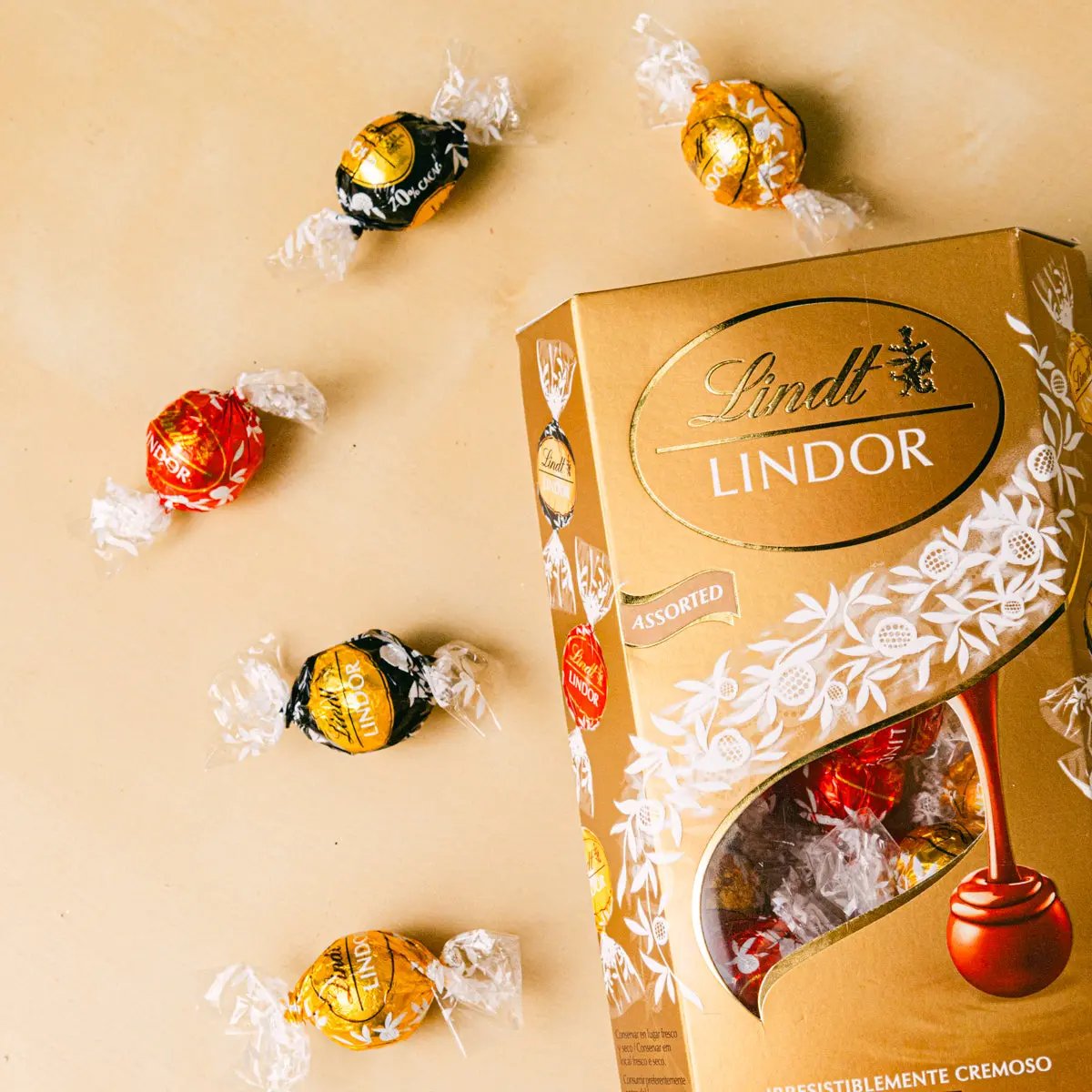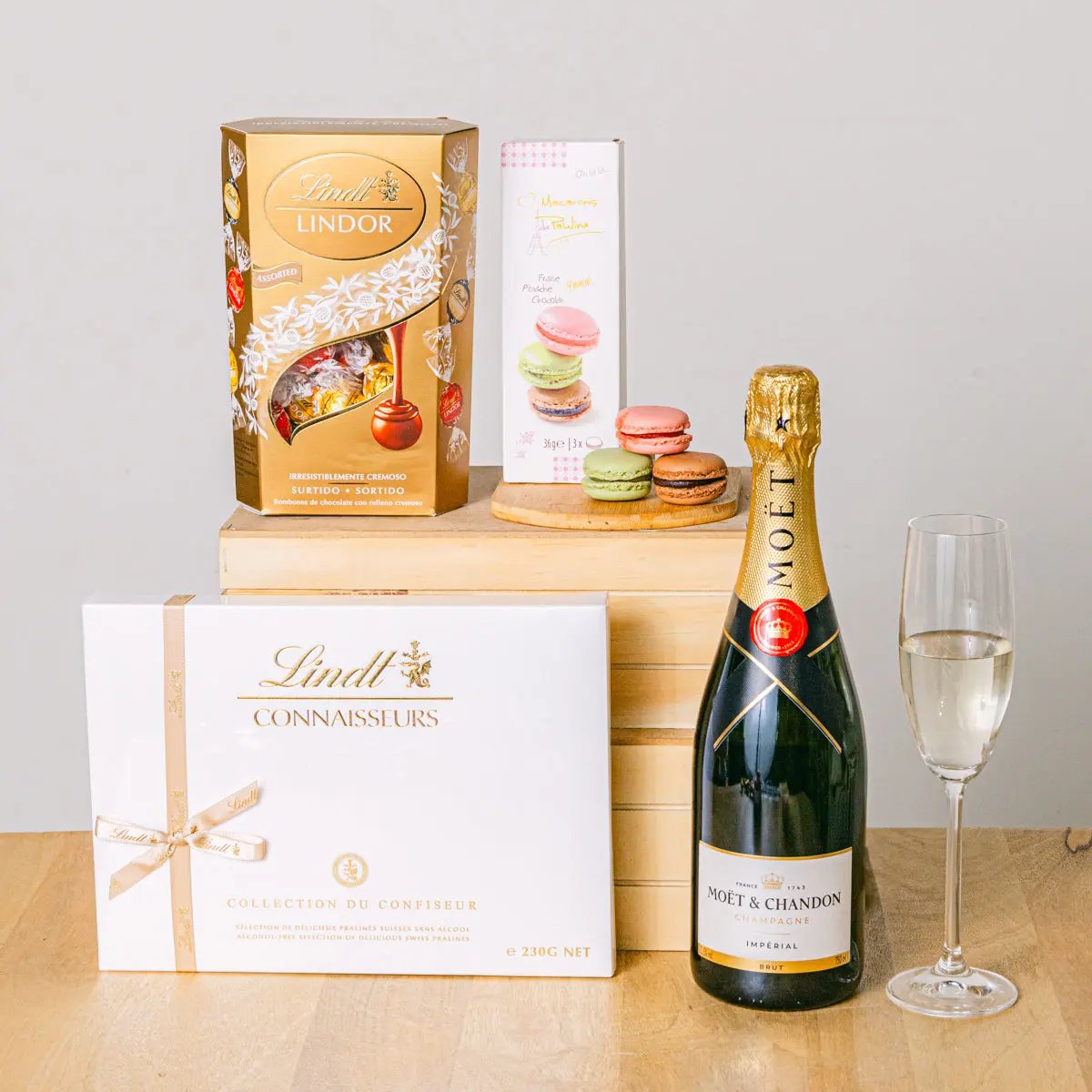 Lindt Du Confiseur 250g, Lindor Cornet 337g, Wybór makaroników 36g, Szampan Moët & Chandon.