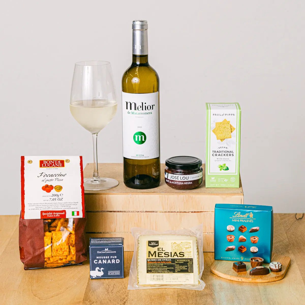 Ten starannie dobrany kosz upominkowy łączy kremową teksturę mini pralinek Lindt z głębokim smakiem dojrzewającego sera i rzemieślniczej focaccii. Delikatny mus z kaczki i aromatyczna pasta z oliwek dodają elegancji, a całość uzupełniają chrupiące wegańskie ciasteczka i orzeźwiające białe wino Melior Verdejo.
