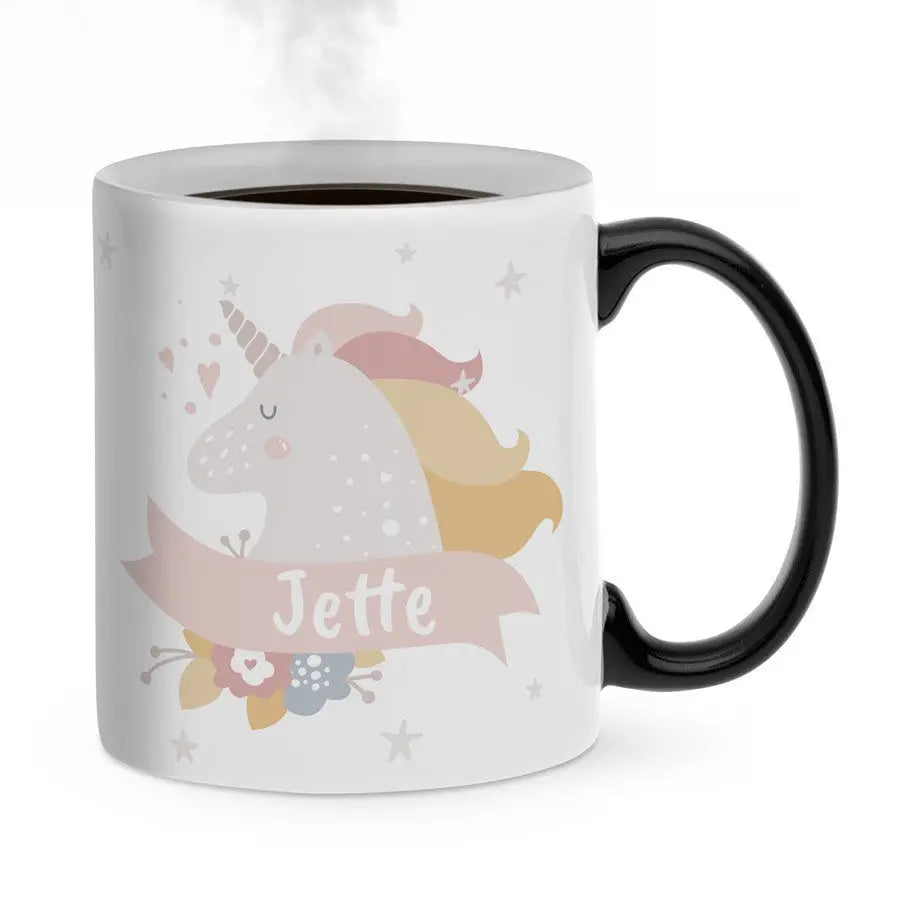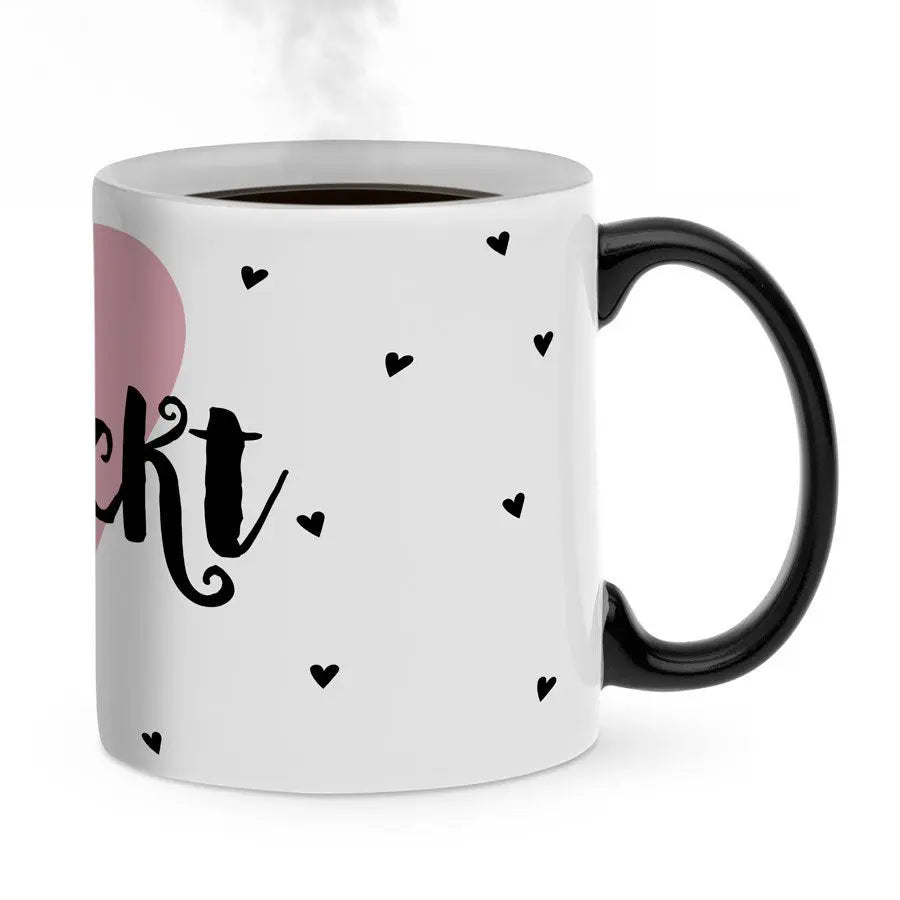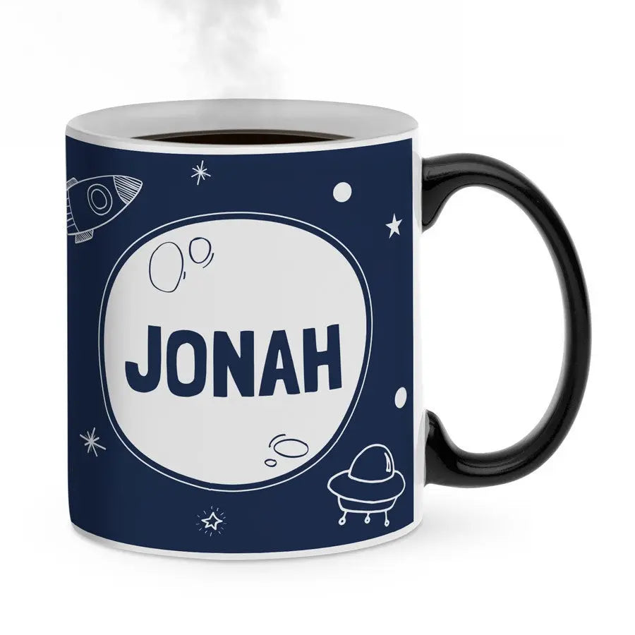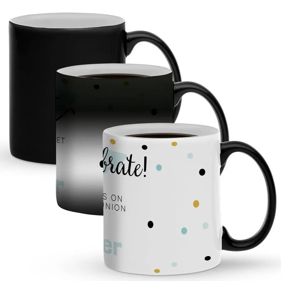 Magiczny kubek z Twoim imieniem lub ulubionym tekstem. Unikatowy: obrazek pojawia się po napełnieniu kubka gorącym napojem! Świetny prezent!Więcej informacji o magicznym kubku: Materiał: ceramika Wysokość: 9,5 cm / 3,7" Średnica: 8,2 cm / 3,2" Pojemność: 325 ml Uwaga: Kubek będzie całkowicie czarny w momencie dostawy. Twój wzór będzie widoczny dopiero po napełnieniu kubka gorącym napojem. Obrazek będzie zawsze lekko widoczny przez magiczną warstwę. Kubek nie nadaje się do mycia w zmywarce ani do podgrzewania w kuchence mikrofalowej!