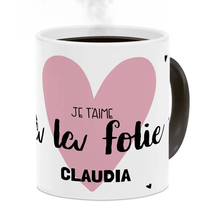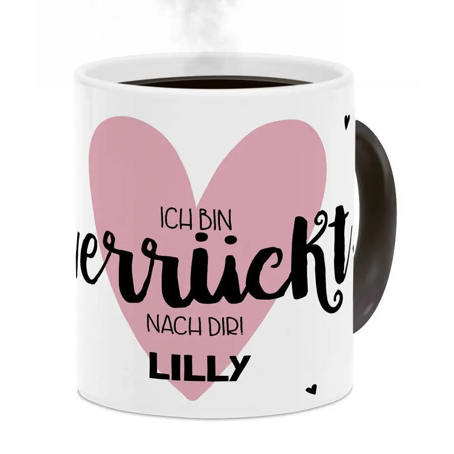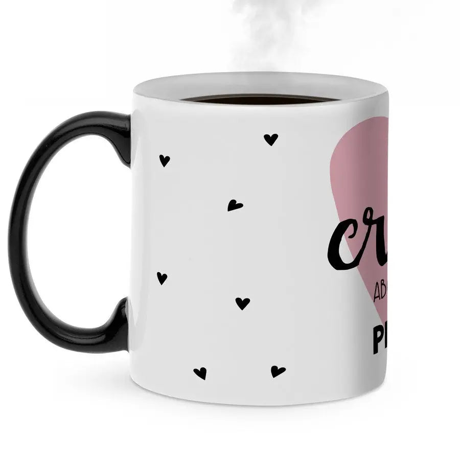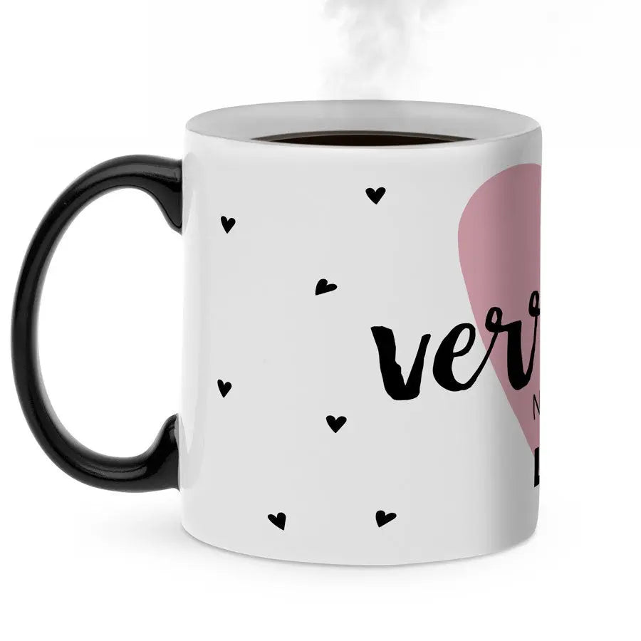 Magiczny kubek z Twoim imieniem lub ulubionym tekstem. Unikatowy: obrazek pojawia się po napełnieniu kubka gorącym napojem! Świetny prezent!Więcej informacji o magicznym kubku: Materiał: ceramika Wysokość: 9,5 cm / 3,7" Średnica: 8,2 cm / 3,2" Pojemność: 325 ml Uwaga: Kubek będzie całkowicie czarny w momencie dostawy. Twój wzór będzie widoczny dopiero po napełnieniu kubka gorącym napojem. Obrazek będzie zawsze lekko widoczny przez magiczną warstwę. Kubek nie nadaje się do mycia w zmywarce ani do podgrzewania w kuchence mikrofalowej!