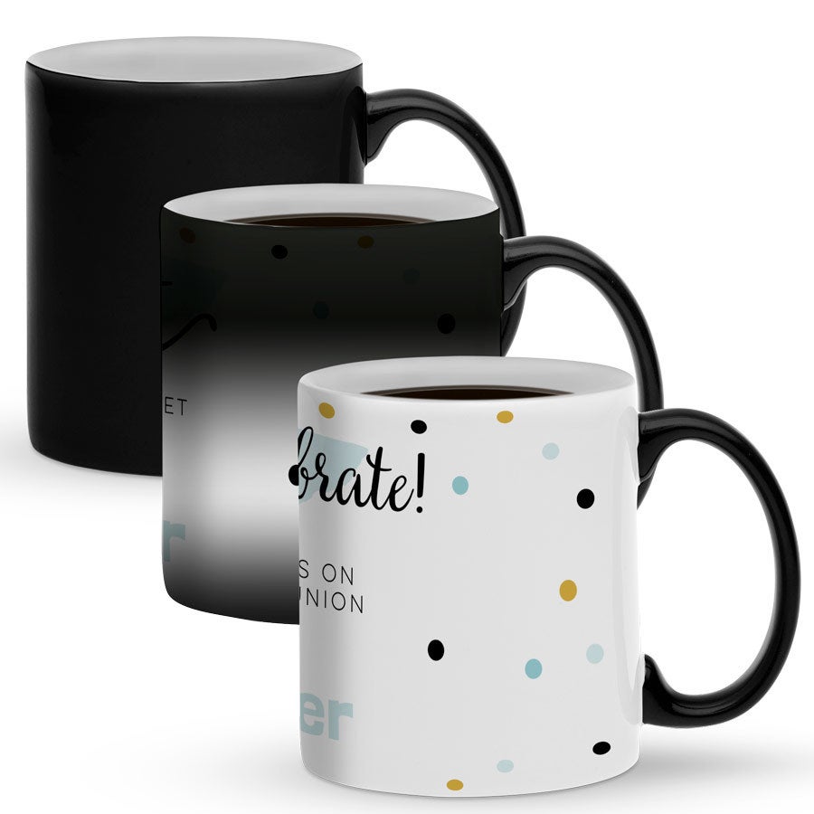 Więcej informacji o magicznym kubku: Materiał: ceramika Wysokość: 9,5 cm / 3,7" Średnica: 8,2 cm / 3,2" Pojemność: 325 ml Uwaga: Kubek będzie całkowicie czarny w momencie dostawy. Twój wzór będzie widoczny dopiero po napełnieniu kubka gorącym napojem. Obrazek będzie zawsze lekko widoczny przez magiczną warstwę. Kubek nie nadaje się do mycia w zmywarce ani do podgrzewania w kuchence mikrofalowej!