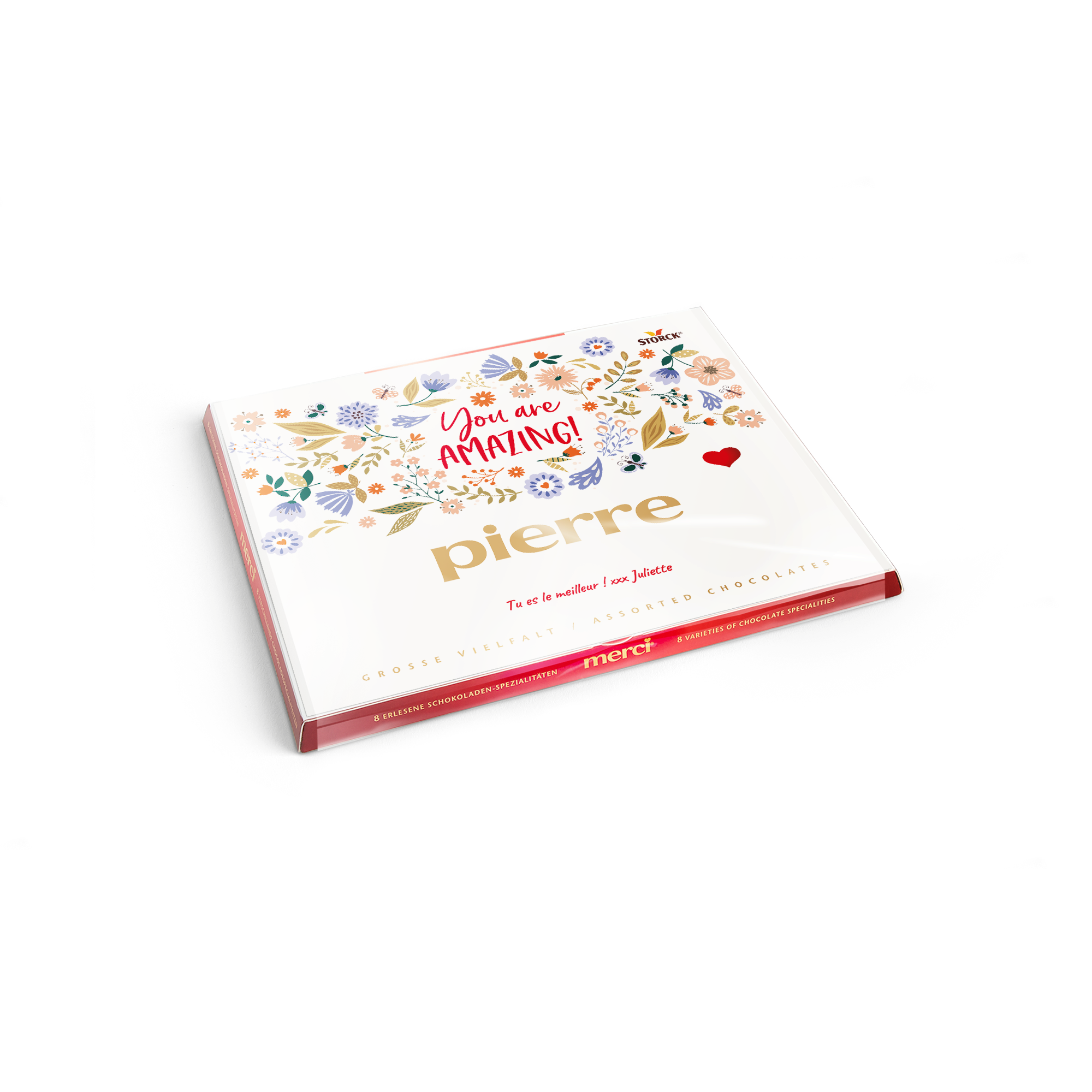 Możliwość personalizacji kartki dodaje osobistego i niepowtarzalnego charakteru prezentowi. Wyborna mieszanka smaków czekoladek Merci zadowoli każdego smakosza.