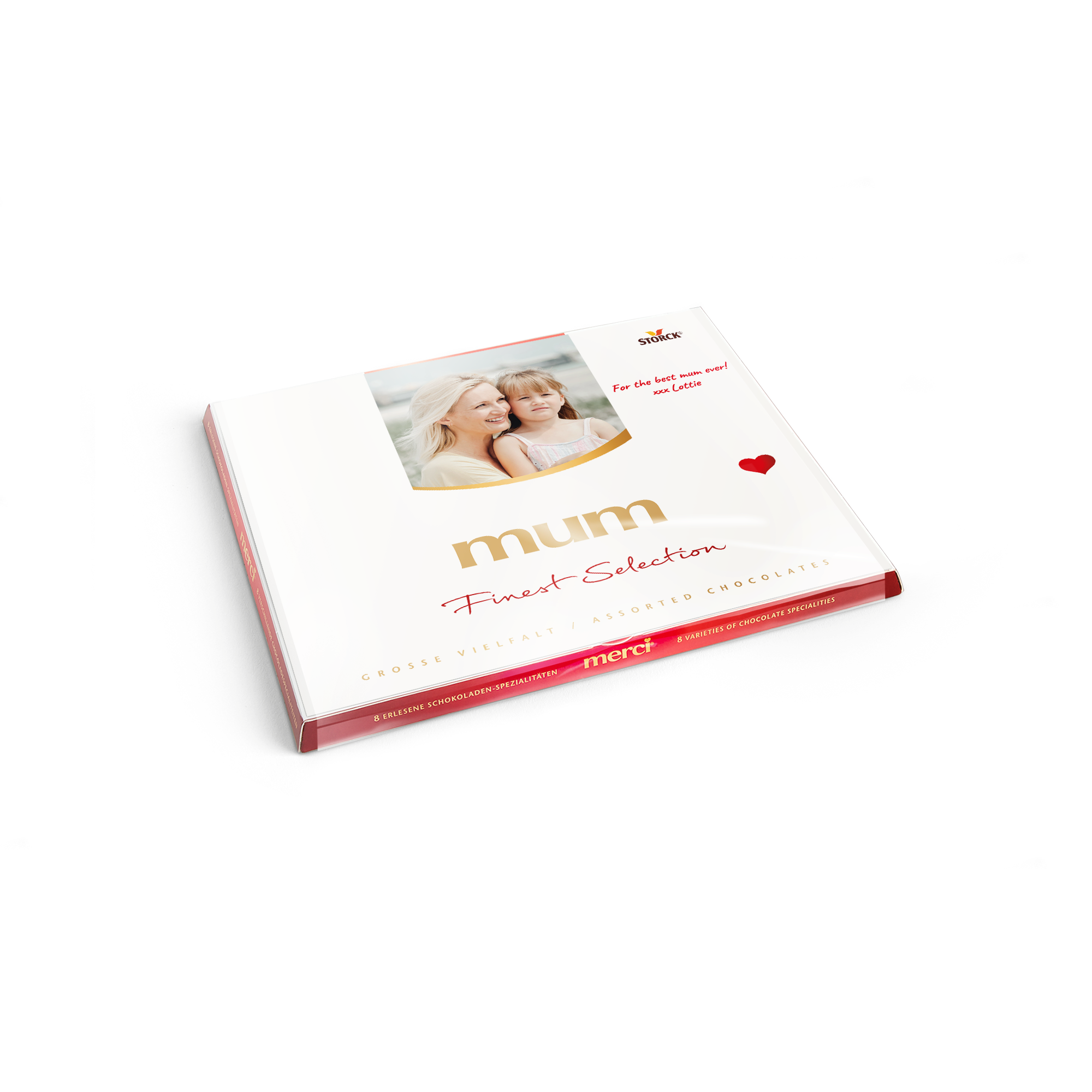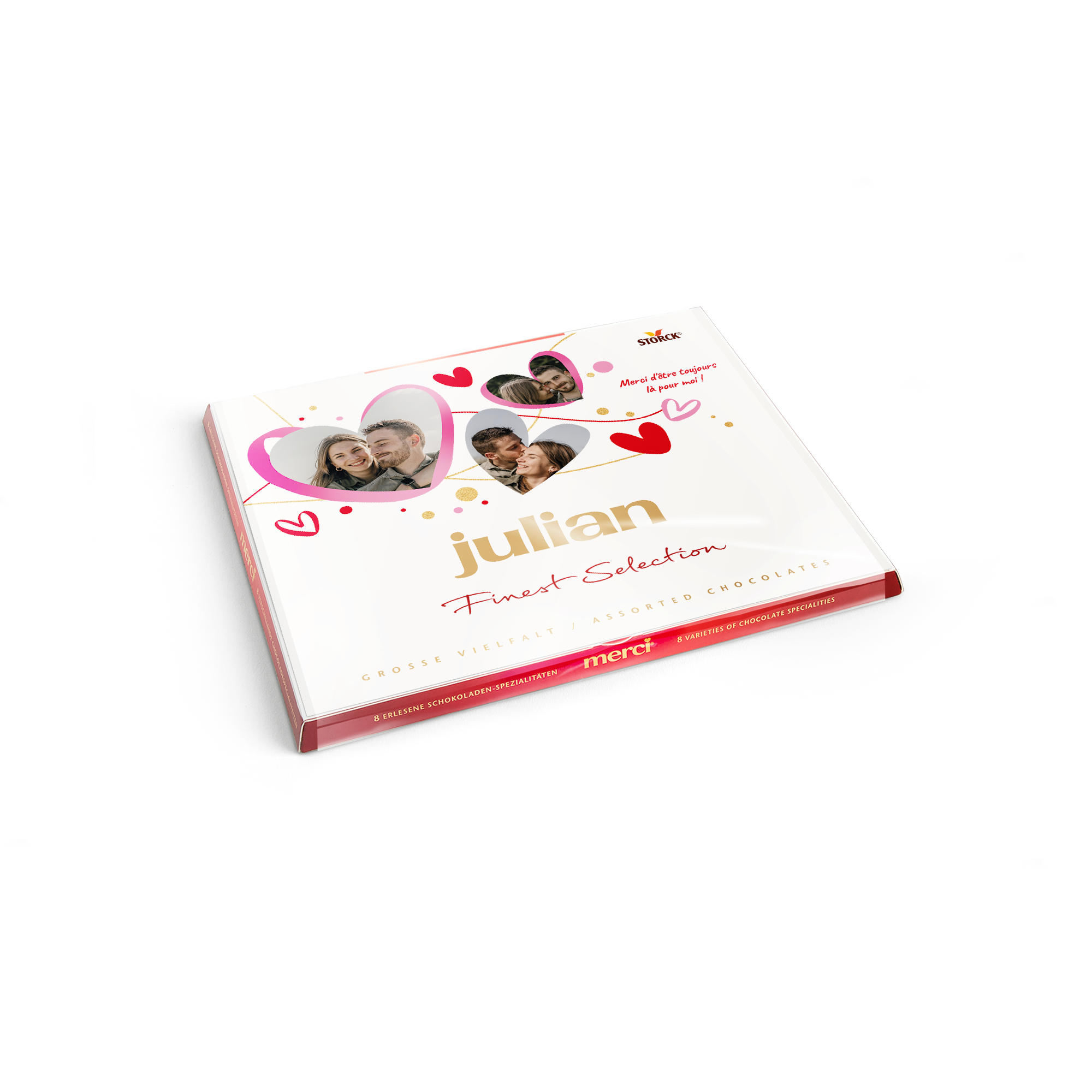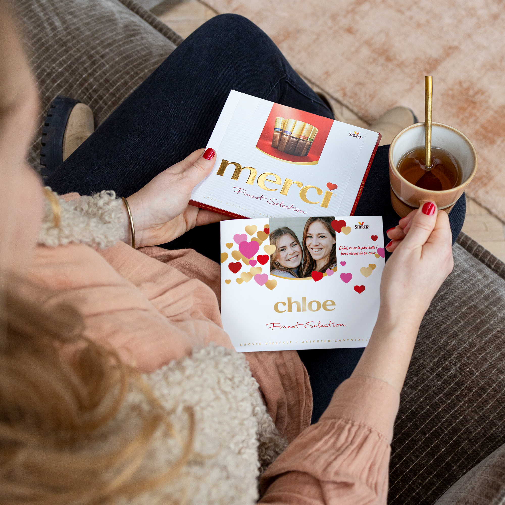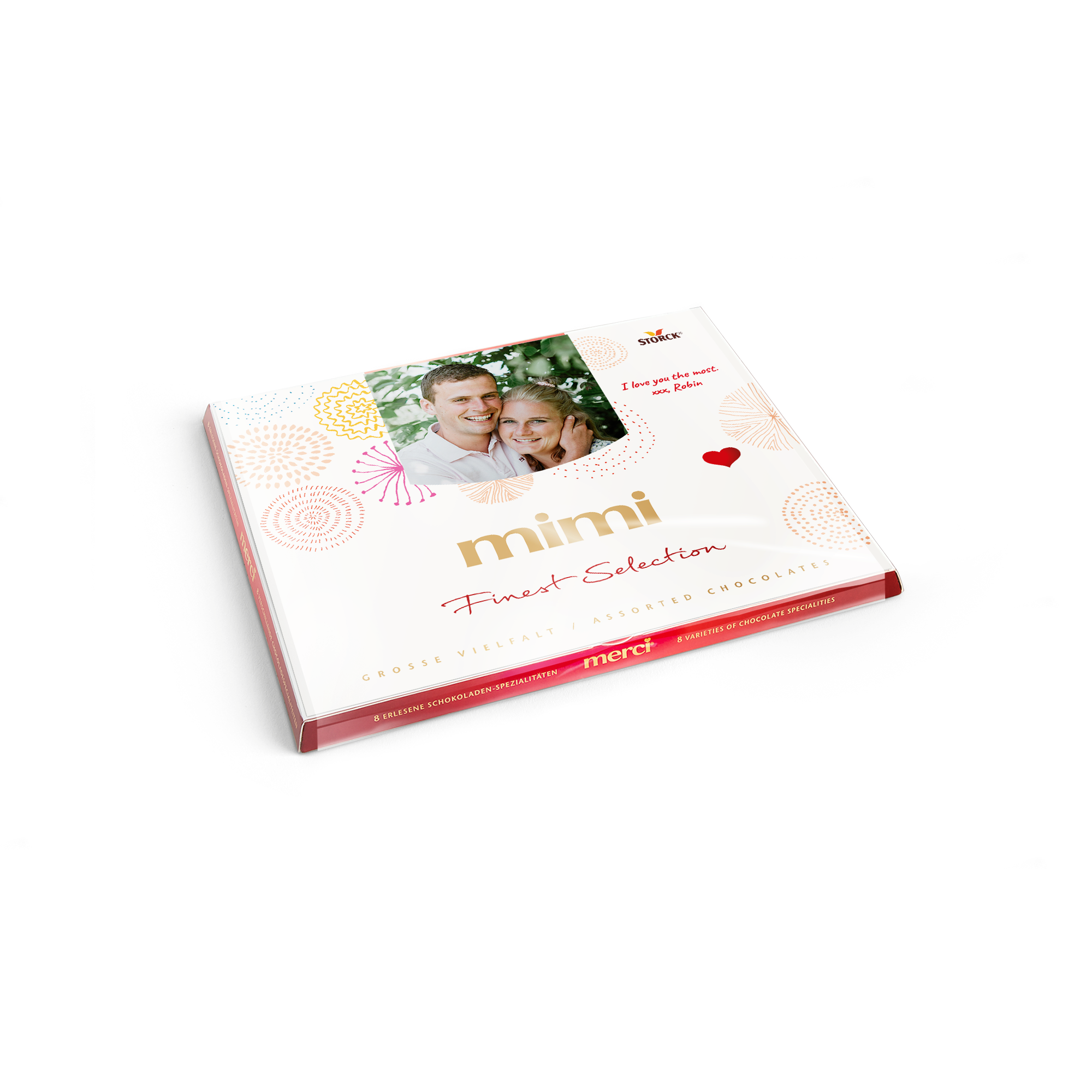 Pudełko czekoladek Merci z personalizowaną kartką ze zdjęciem, imieniem i/lub tekstem do wyboru. Klasyczny wzór Merci!