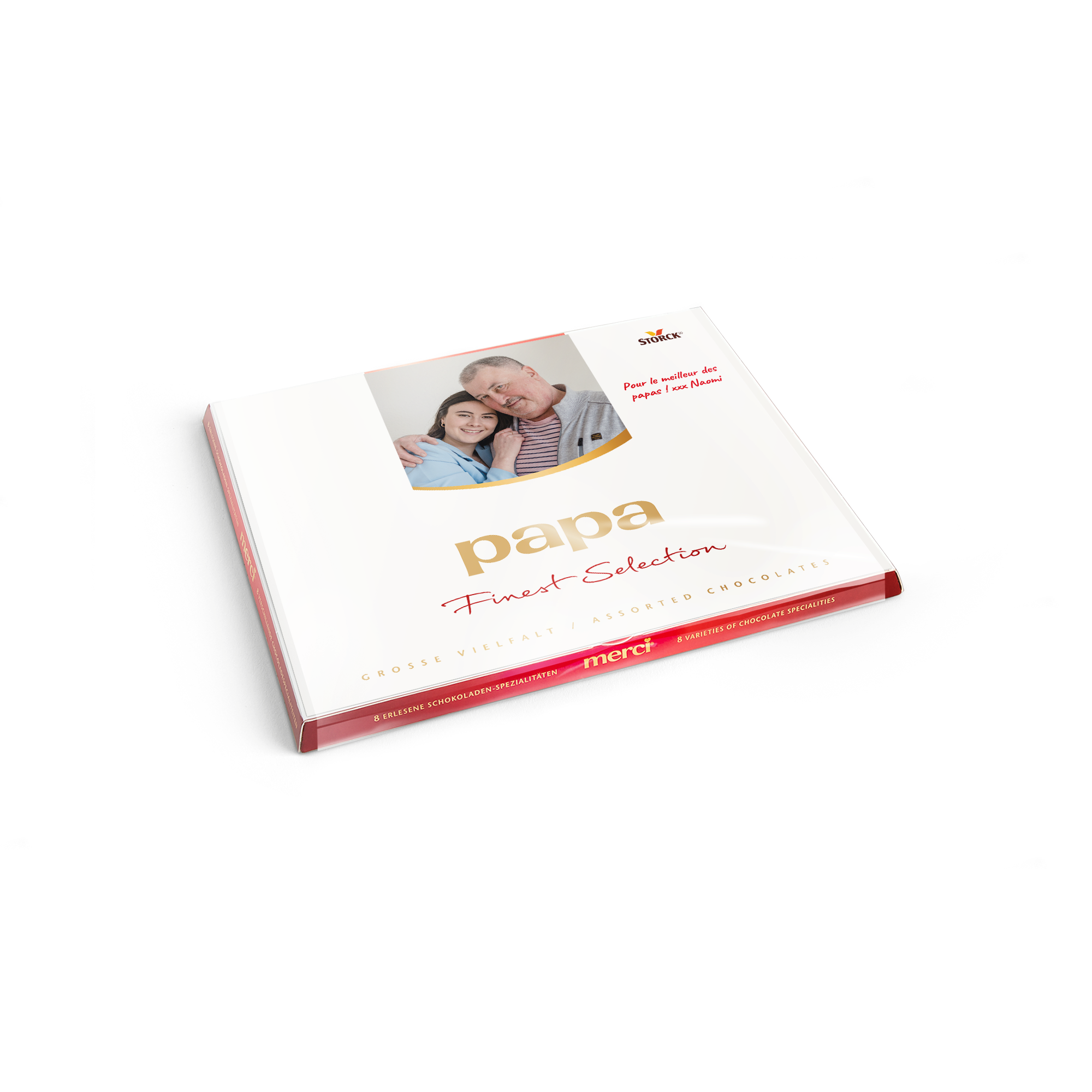 Więcej informacji na temat czekoladek Merci:Czekolada: Mieszanka mlecznej czekolady, mlecznej praliny, czekolady migdałowo-orzechowej, orzechowo-praliny, gorzkiej czekolady, kremu mokka, musu z gorzkiej czekolady, marcepanaLiczba czekoladek: 20Waga: 250 gramówWymiary pudełka: 19,5 x 16 x 1,5 cmWymiary złożonej kartki: 18,5 x 14,8 cmPersonalizacja: imieniem, zdjęciem i osobistą wiadomościąNadruk: idealny i w pełnym kolorzeJeśli temperatura zewnętrzna wynosi 25 stopni Celsjusza lub więcej, nie gwarantujemy jakości czekoladki. Jeśli masz jakiekolwiek pytania dotyczące zamówień czekoladek, skontaktuj się z naszym zespołem obsługi klienta. Ze względów technicznych nie jest możliwe użycie cyrylicy, znaków tureckich, azjatyckich, arabskich, greckich ani znaków specjalnych.