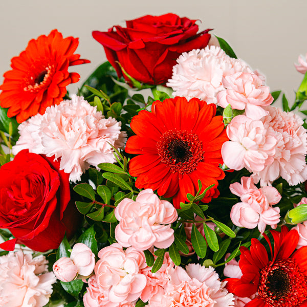 Zachwyć kogoś wyjątkowego tym pięknym bukietem czerwonych róż i mini czerwonych gerber! Ta niesamowita kombinacja kwiatów oczaruje każdego, kto ją otrzyma. Dodaj odrobinę koloru w tym wyjątkowym dniu! Możesz zrobić to w wersji deluxe, aby dodać więcej kwiatów i bezpłatnie dołączyć dedykowaną kartkę. Poczujesz się blisko, niezależnie od odległości.