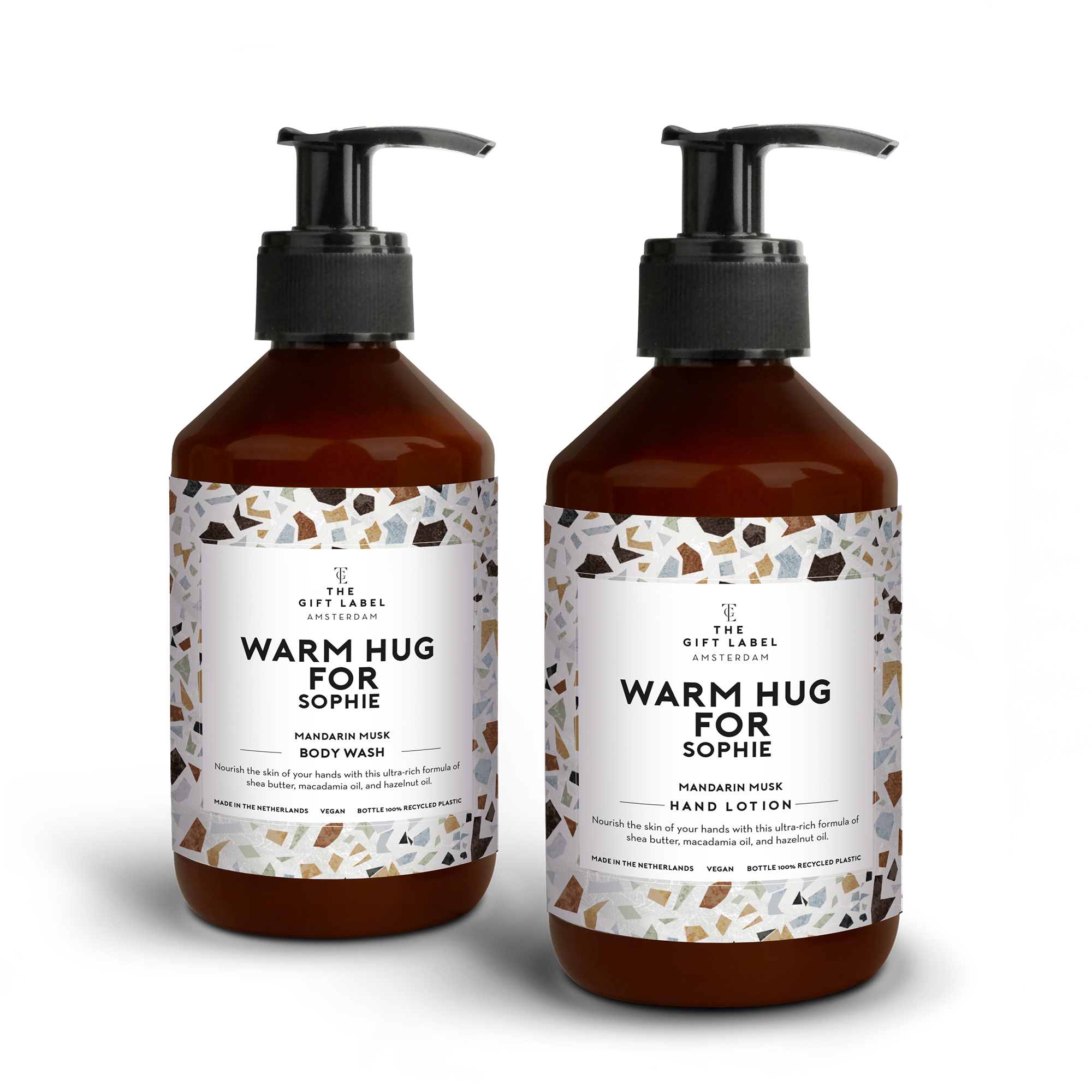 Więcej informacji o zestawie prezentowym:Zawartość zestawu prezentowego: Żel pod prysznic (250 ml) i mydło do rąk (250 ml)Zapach: Piżmo mandarynkoweNadruk: W pełni zadrukowane etykiety, idealne i w pełnym kolorzePersonalizacja: tekst i osobista wiadomośćDodatkowe informacje: Butelki znajdują się w wytrzymałym pudełku prezentowymZ przyczyn technicznych nie jest możliwe użycie znaków cyrylicy, azjatyckich, arabskich, greckich, tureckich ani znaków specjalnych.