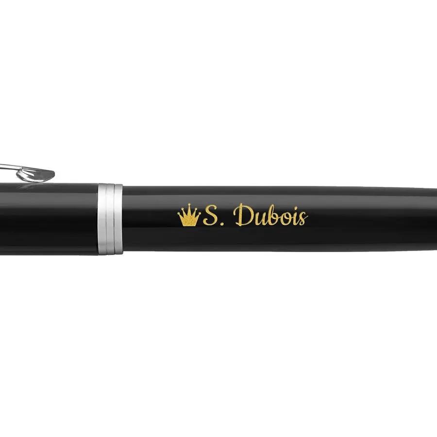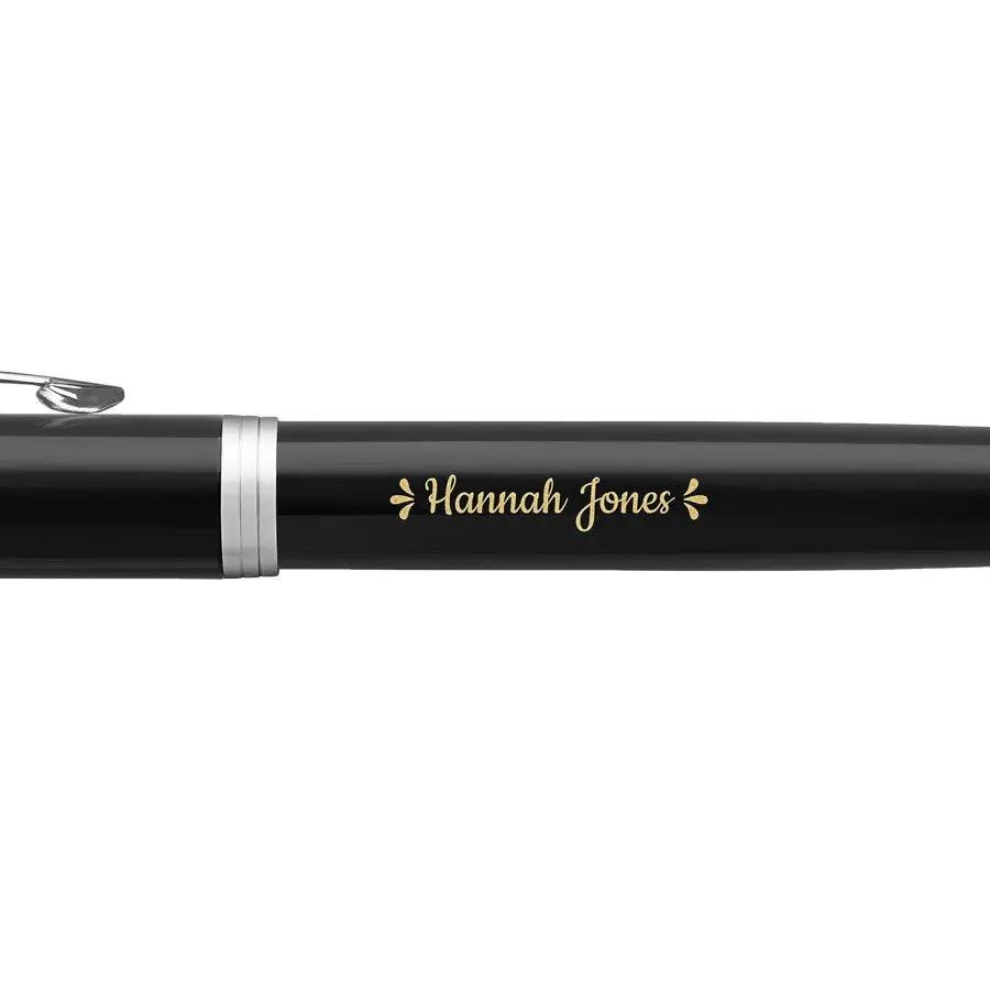 Pióro Parker, czarny kolor, grawerowany tekst, luksusowe pudełko prezentowe.