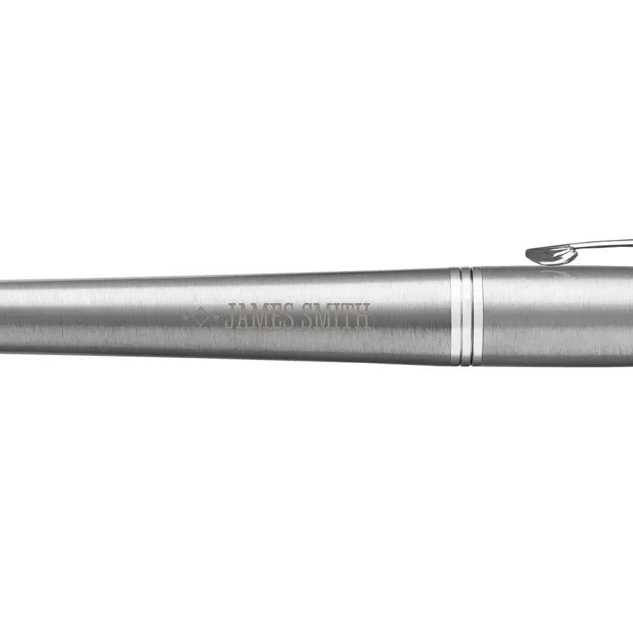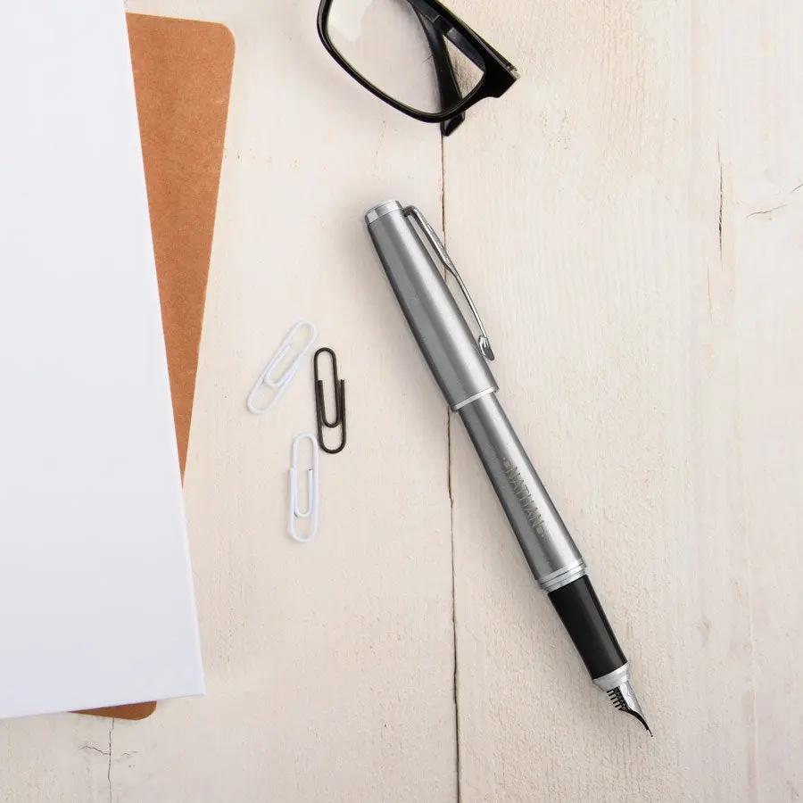 Dodatkowe informacje o grawerowanym piórze Parker Urban:Marka: ParkerModel: Urban Metro Typ: Wieczne pióroKolor pióra: SrebrnyKolor atramentu: NiebieskiPersonalizacja: Grawerowany tekstKolor grawerunku: ZłotyDodatkowo: zawiera 1 napełnienie i jest dostarczane w luksusowym pudełku prezentowym. Można je uzupełniać napełnieniami Parker.Uwaga: to pióro jest odpowiednie dla osób leworęcznych