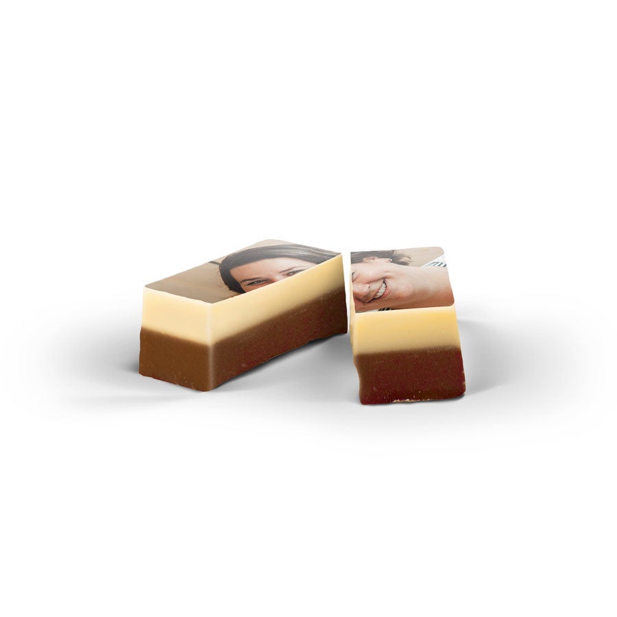 Zestaw 24 personalizowanych czekoladek z mlecznej czekolady z warstwą białej czekolady. Możliwość wydruku zdjęcia lub logo.