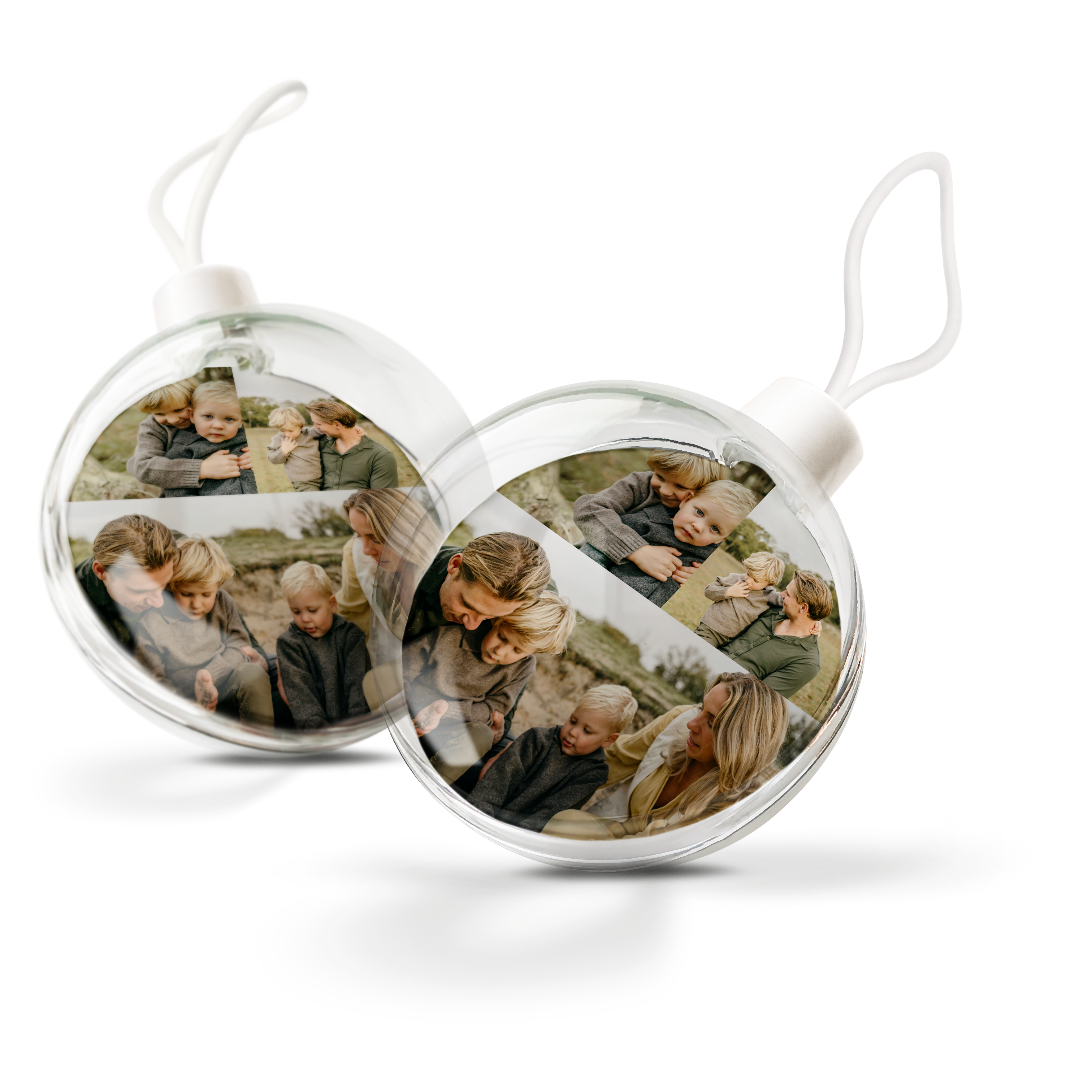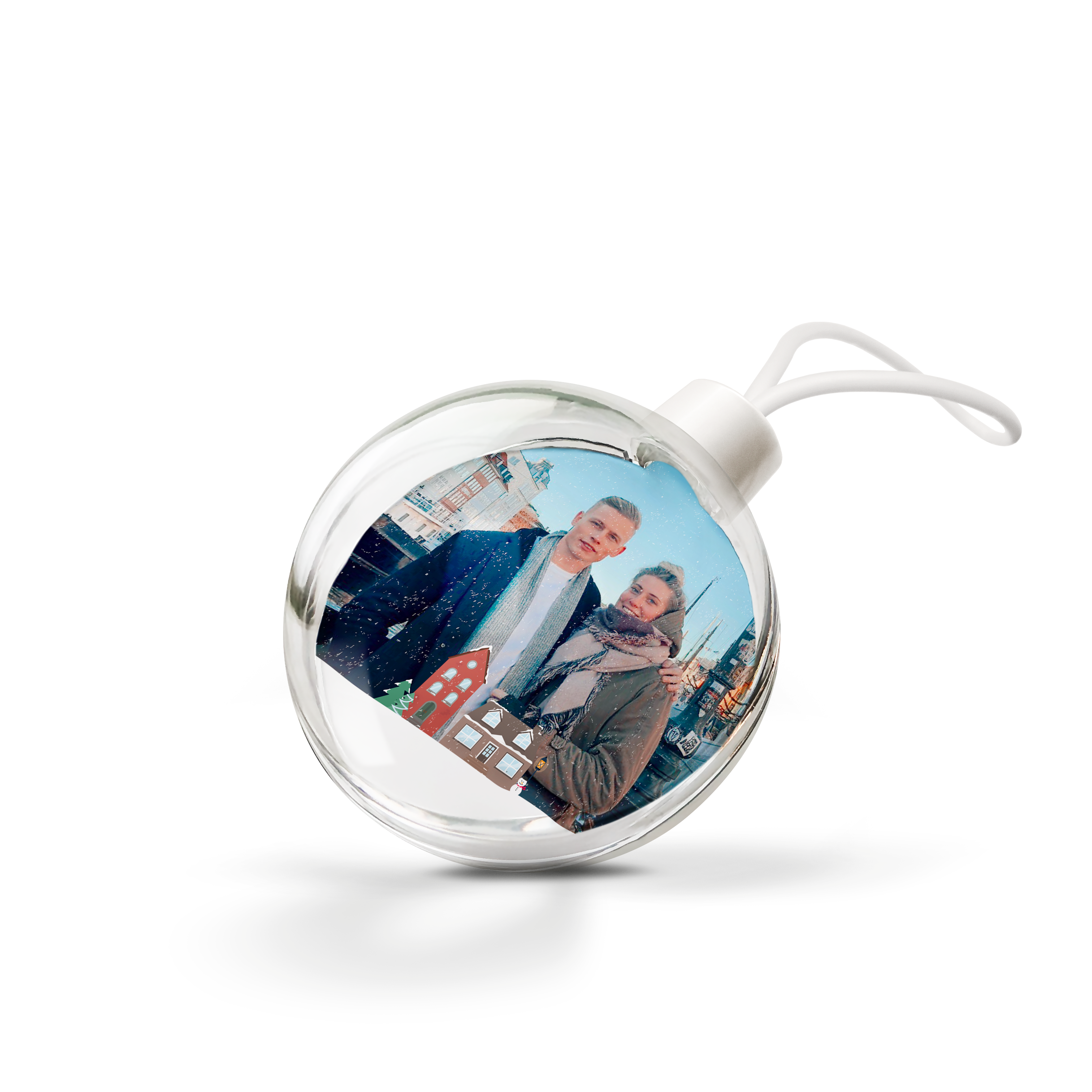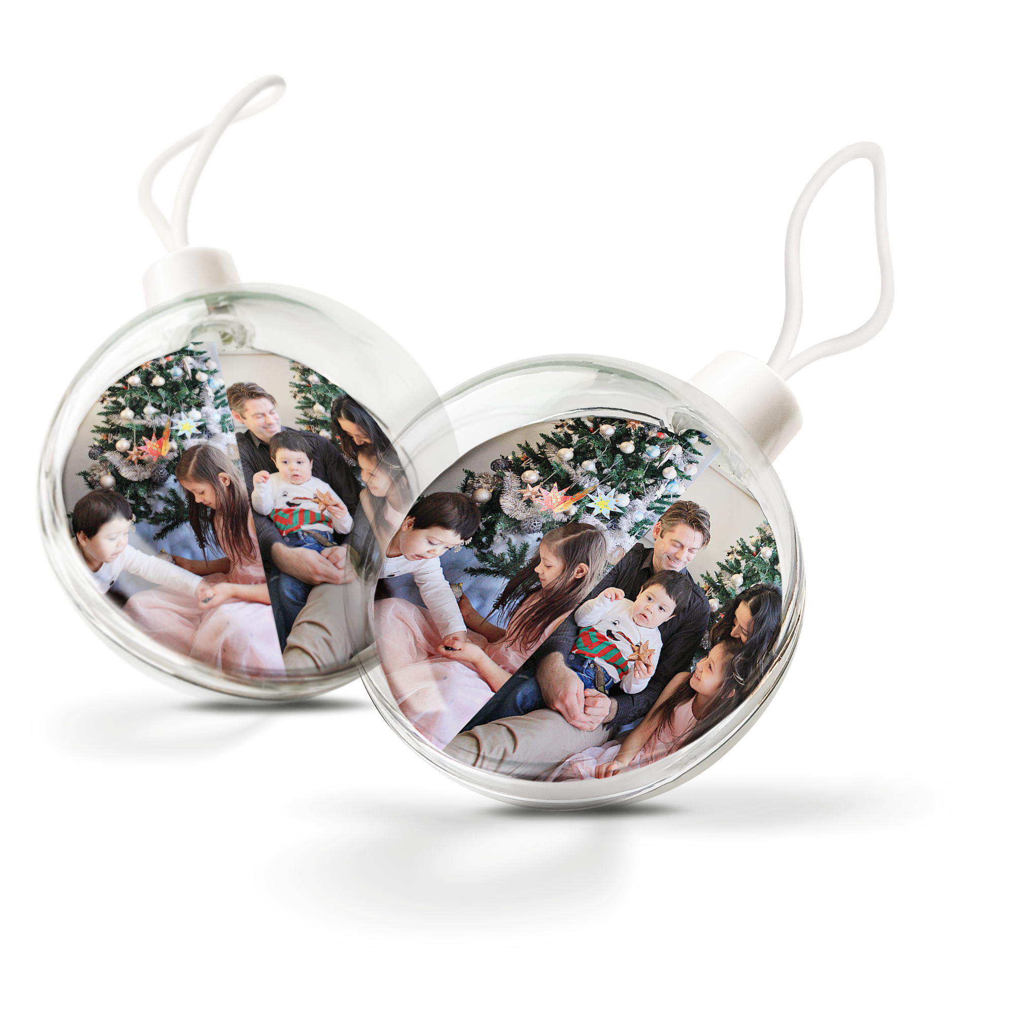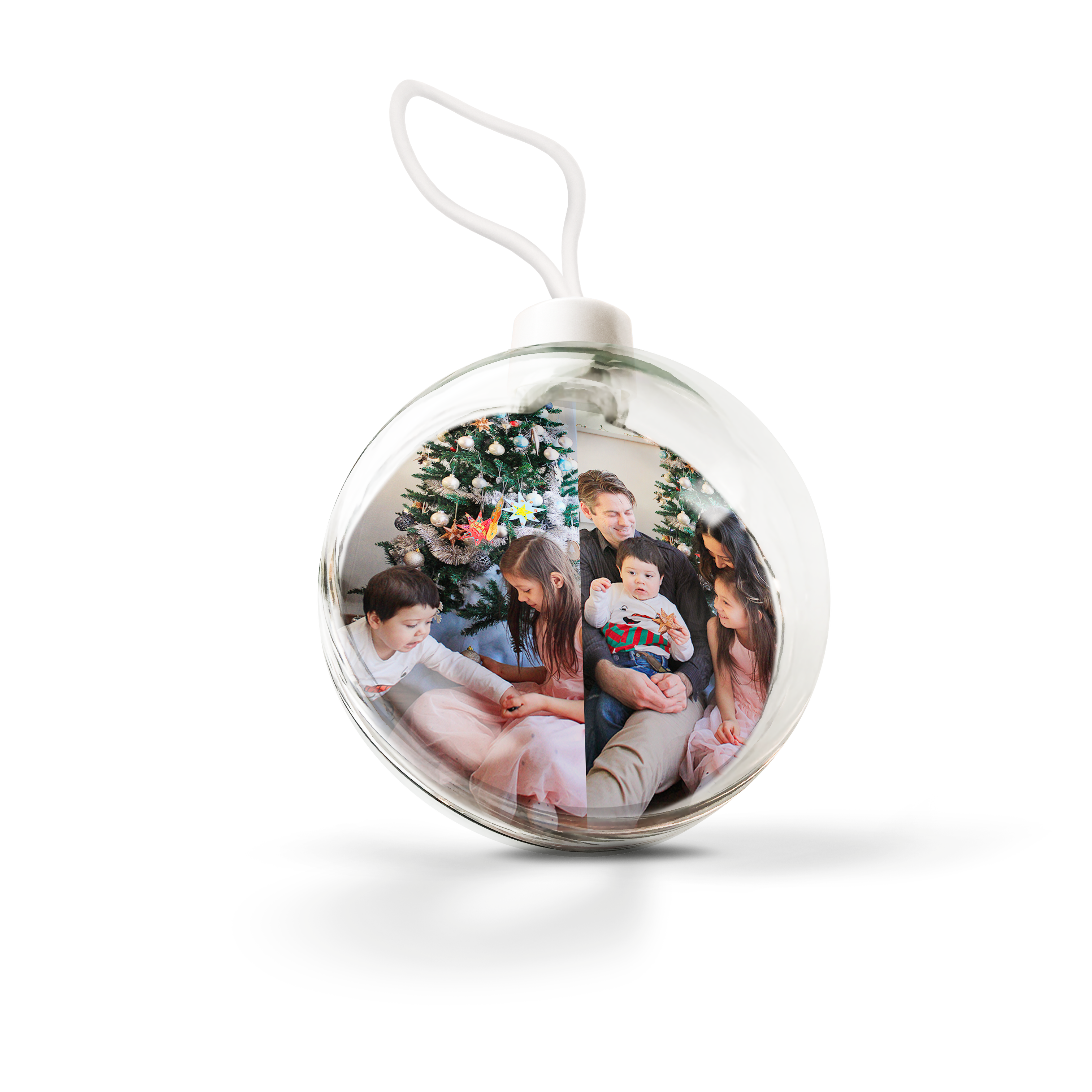 Twoje własne zdjęcie i tekst wewnątrz spersonalizowanych, przezroczystych bombek świątecznych. Dwustronny obraz!