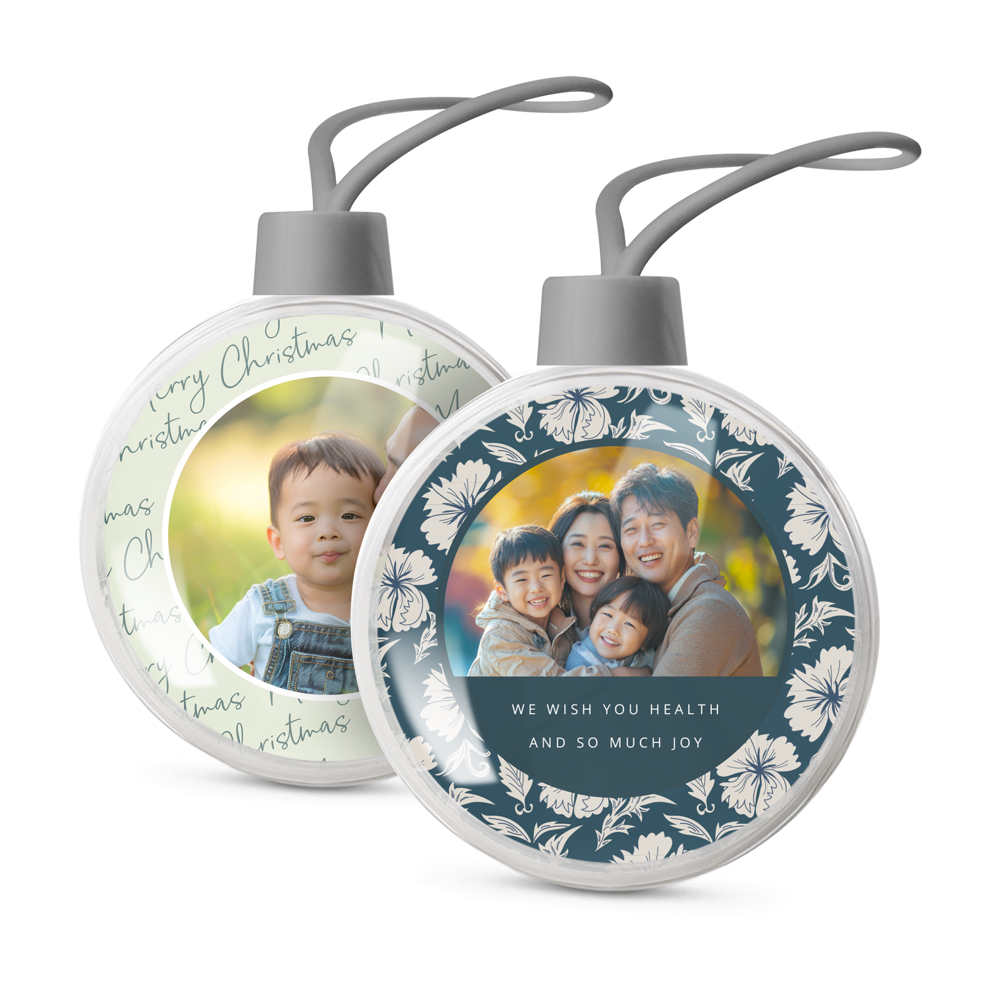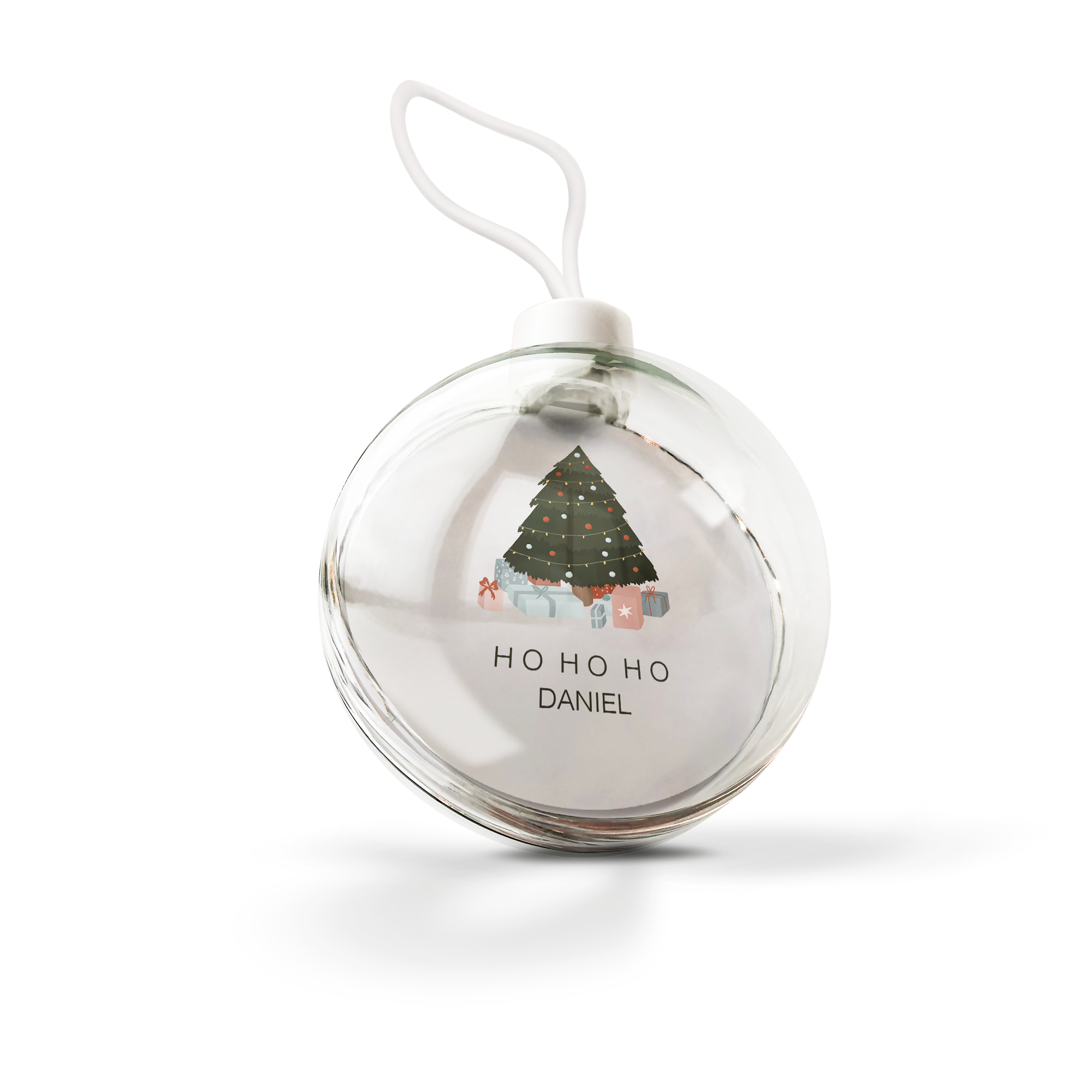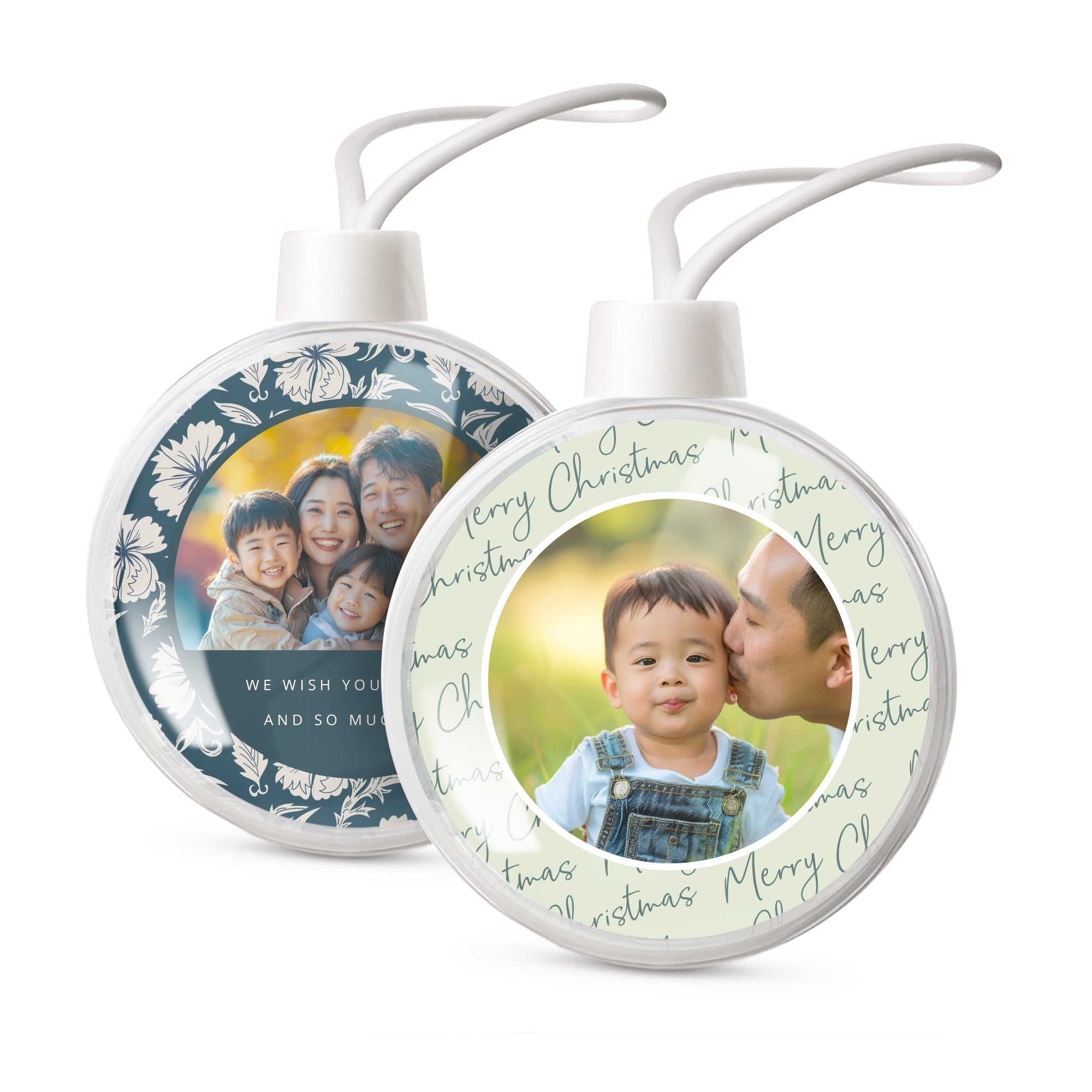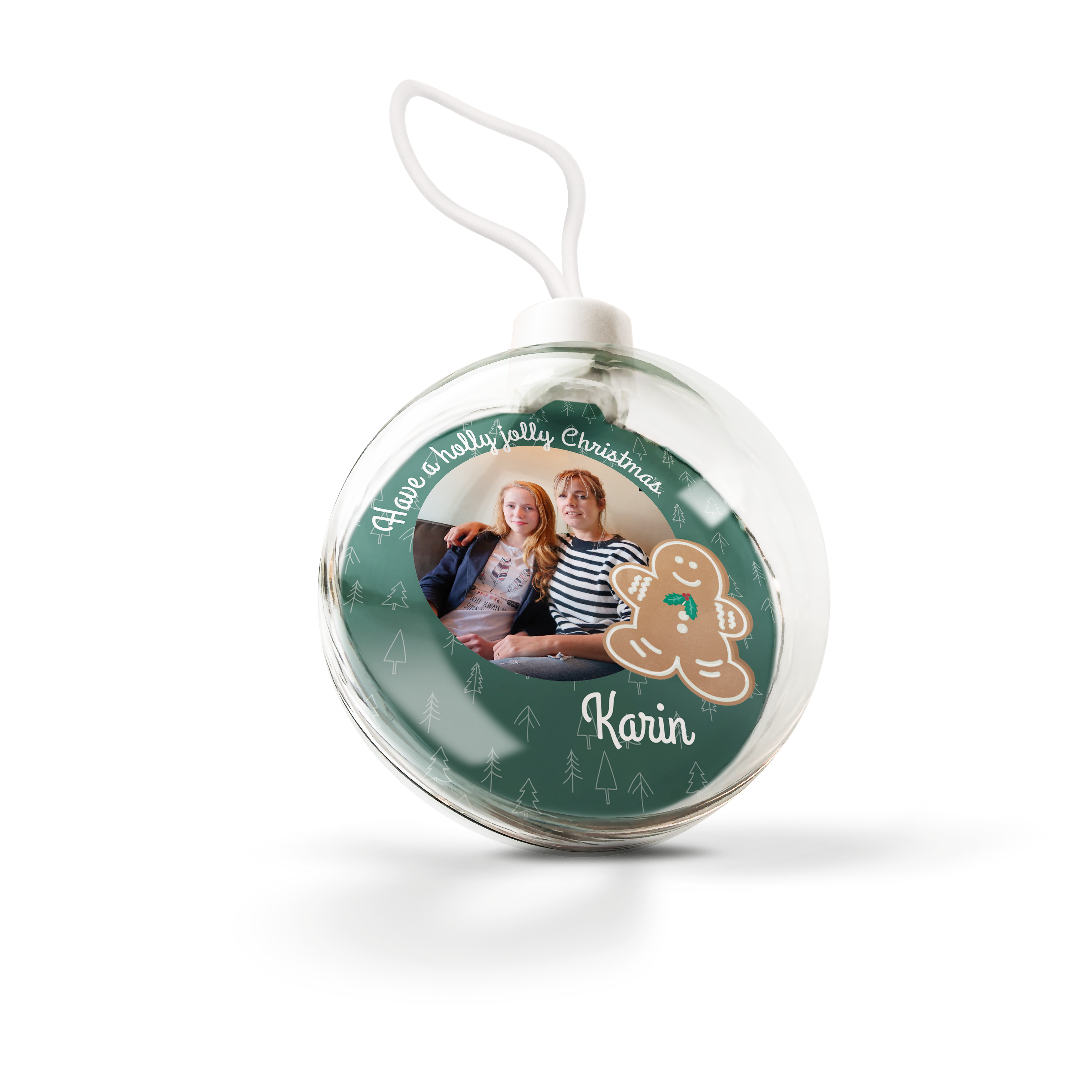 Twoje własne zdjęcie i tekst wewnątrz spersonalizowanych, przezroczystych bombek świątecznych. Dwustronny obraz!