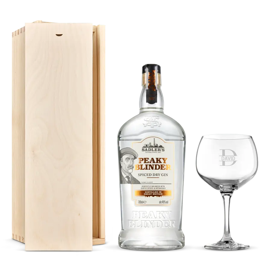 Na podstawie popularnego programu telewizyjnego. Kogo zaskoczysz zestawem do ginu Peaky Blinders? W zestawie luksusowy grawerowany kieliszek do ginu z tonikiem.Więcej informacji na temat personalizacjiPersonalizacja: imieniem lub tekstem Wykończenie: wysokiej jakości grawerowanie laserowe na szkleKolor grawerunku: biały Wymiary pudełka: 36,5 x 12 x 11 cmSzczegóły: drewniane pudełko posiada znak jakości FSCWięcej szczegółów na temat ginuNazwa: Sadler's Peaky BlinderRodzaj ginu: wytrawny z przyprawamiPojemność: 700 mlKraj: AngliaZawartość alkoholu: 40%Charakter: gin Peaky Blinder to wytrawny gin z egzotycznymi ziołami i przyprawami, takimi jak imbir, czarny pieprz i kasja.