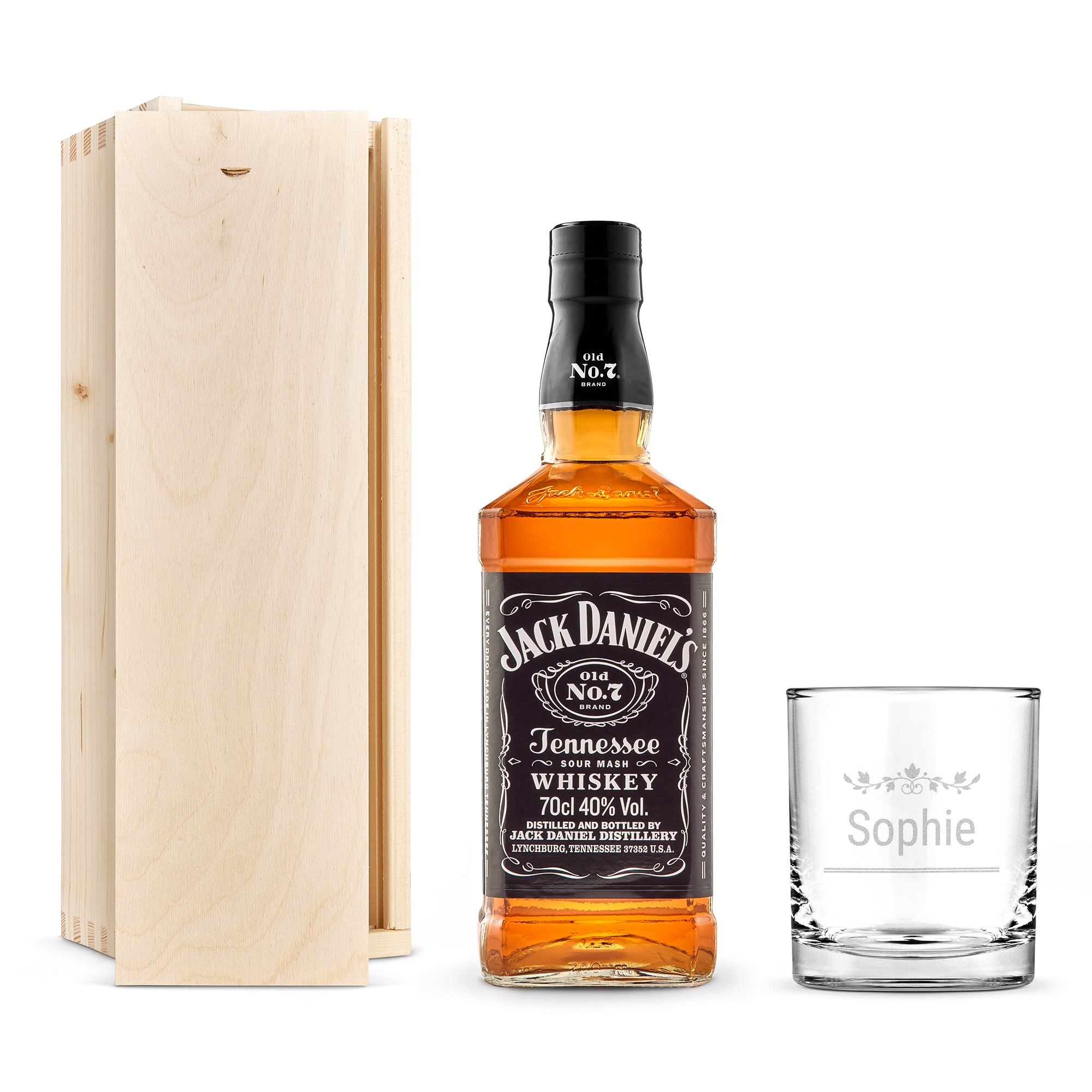 Butelka Jack Daniels (0,7 l), grawerowana szklanka, drewniana skrzynka z certyfikatem FSC.