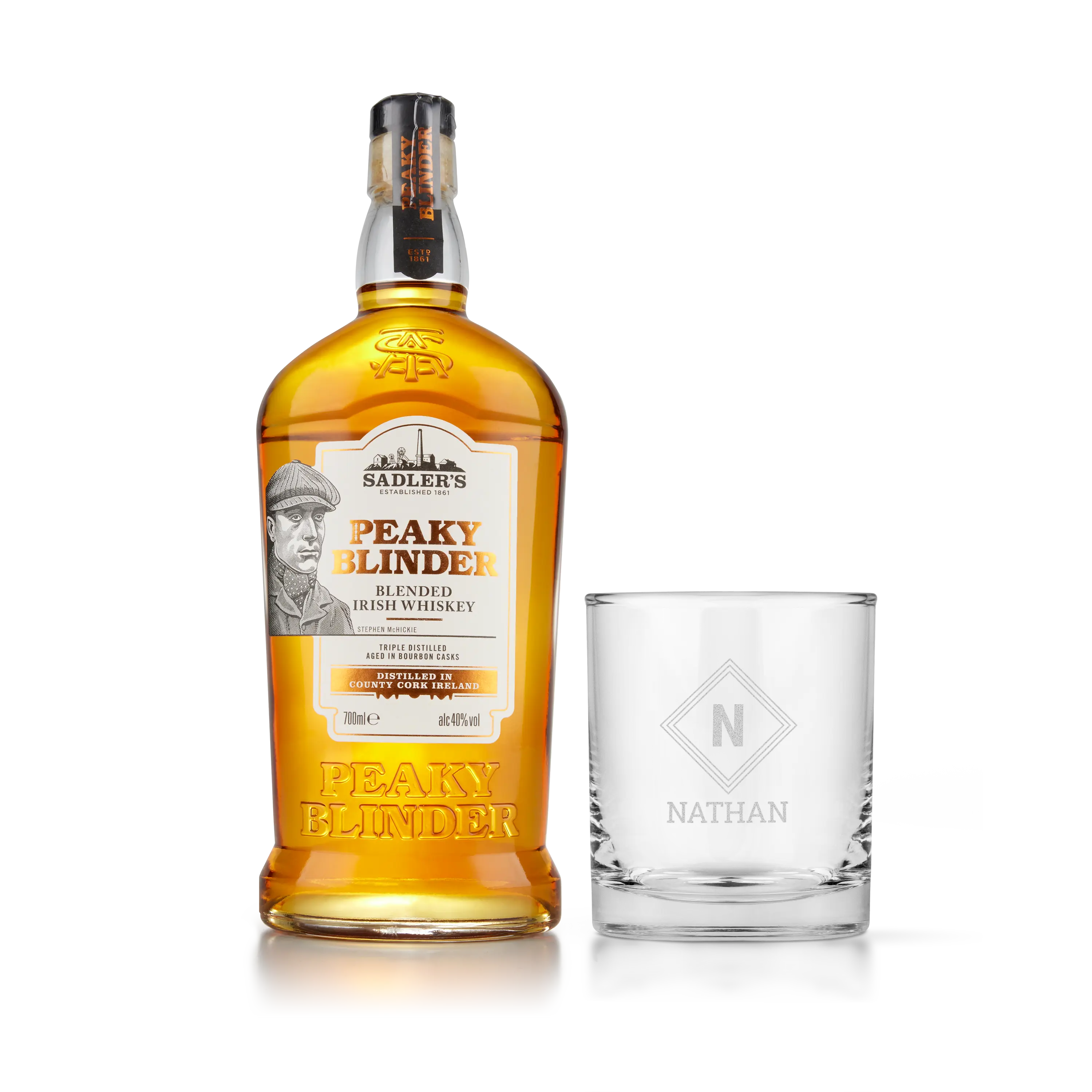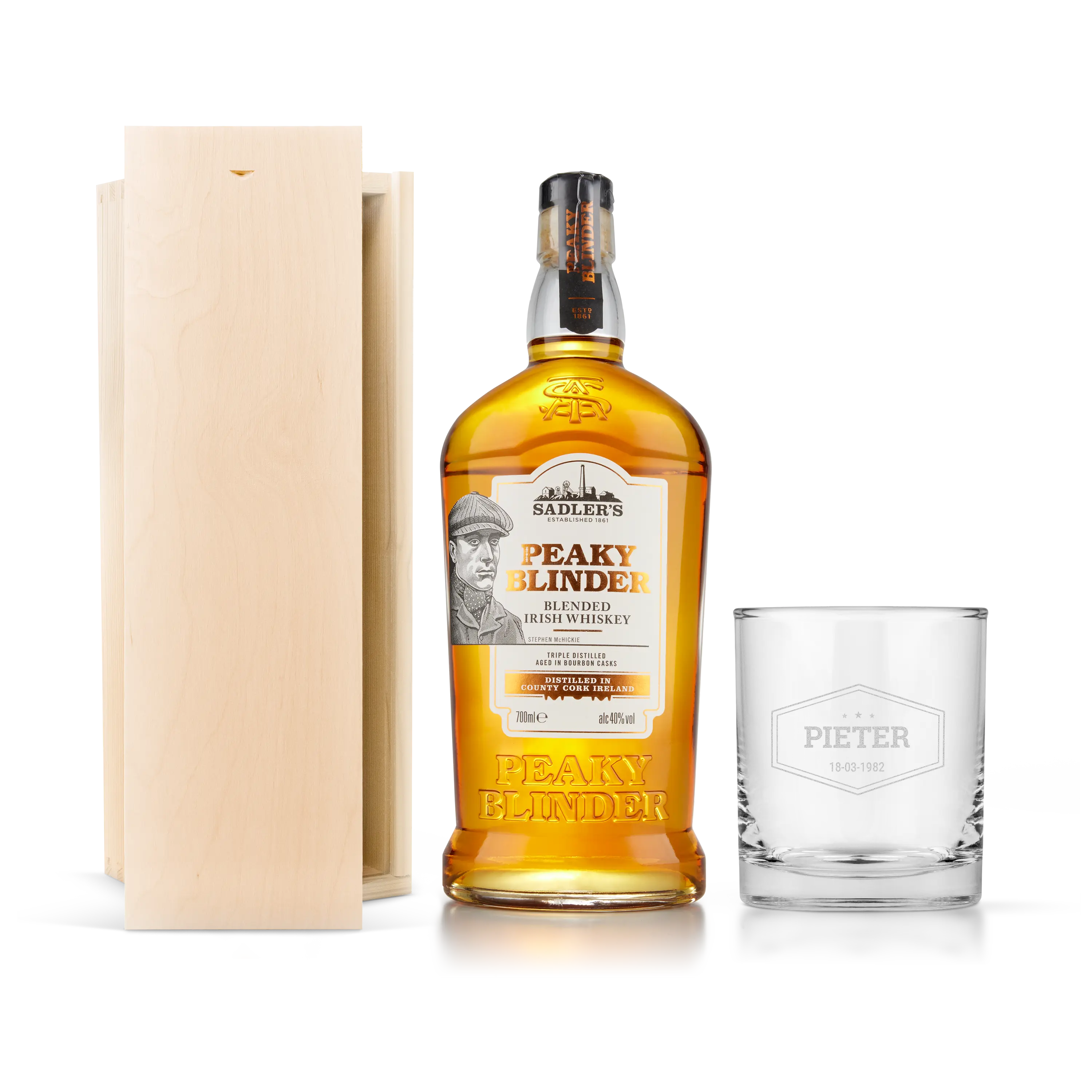 Na podstawie popularnego programu telewizyjnego. Kogo zaskoczysz zestawem do whisky Peaky Blinders? W tym luksusową grawerowaną szklankę do whisky.Więcej informacji na temat personalizacjiPersonalizacja: imieniem lub tekstem Wykończenie: wysokiej jakości grawerowanie laserowe na szkleKolor grawerunku: biały Wymiary pudełka: 36,5 x 12 x 11 cmSzczegóły: drewniane pudełko posiada znak jakości FSCWięcej szczegółów na temat whiskyNazwa: Sadler's Peaky BlinderRodzaj whisky: mieszana Pojemność: 700 mlKraj: Anglia Zawartość alkoholu: 40% Charakter: Peaky Blinder Irish Whiskey jest potrójnie destylowana i dojrzewa w beczkach po sherry. Wyczuwalne są w niej nuty czarnej porzeczki, jabłka i toffi. Można delektować się kuszącymi odcieniami czekolady, moreli i pomarańczy.