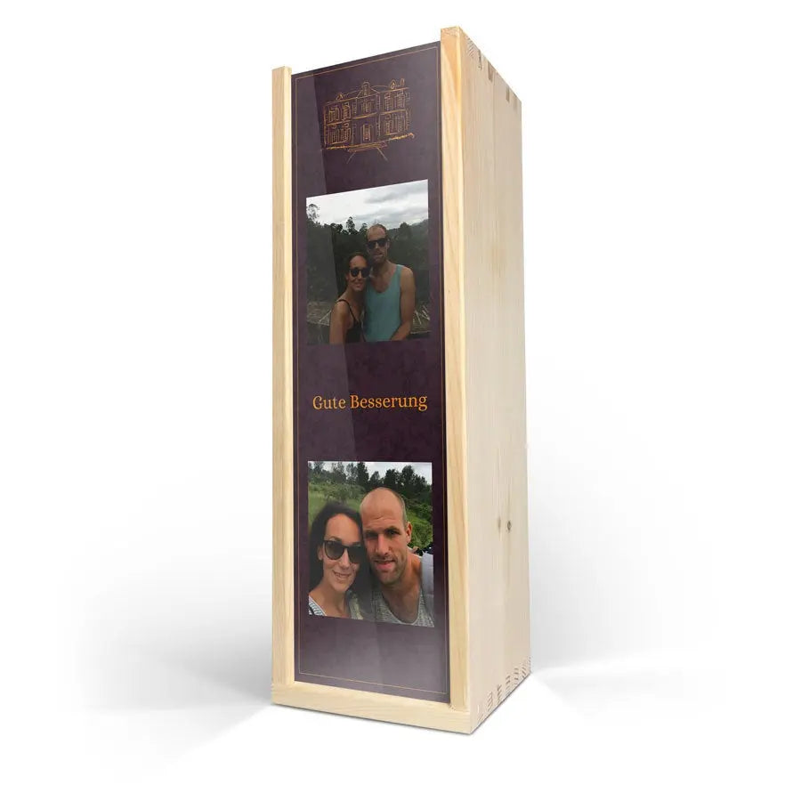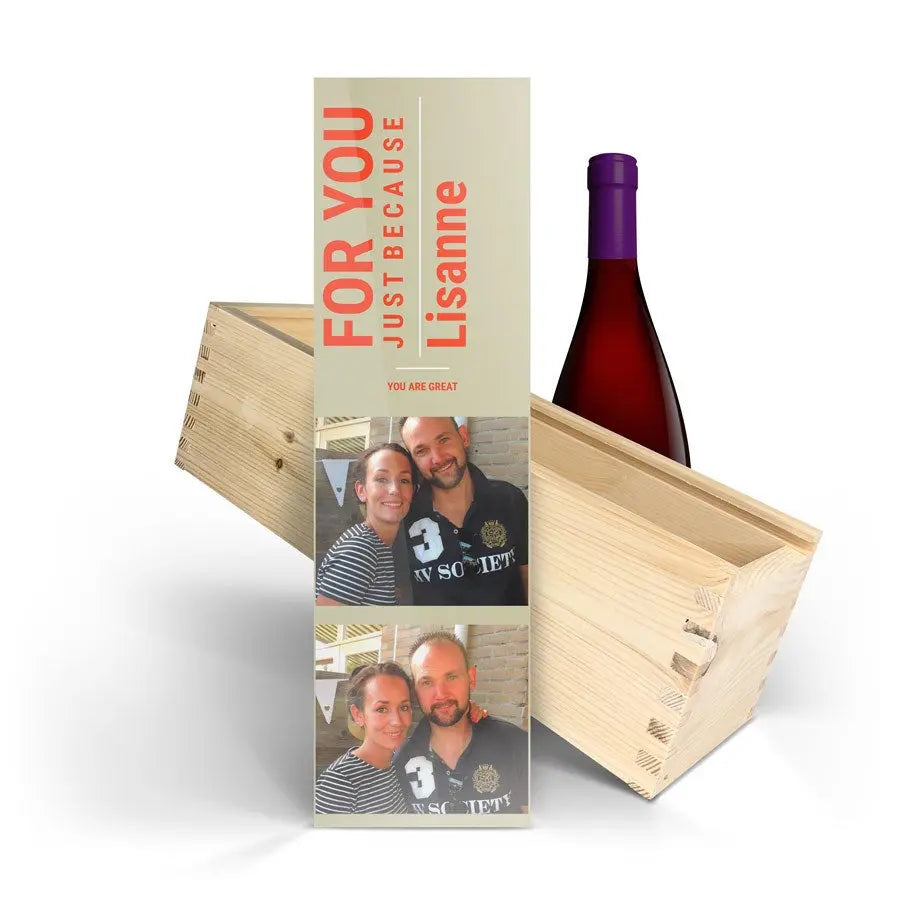 Upiększ każdą okazję dzięki naszemu spersonalizowanemu pudełku prezentowemu na wino, oferującemu idealne połączenie elegancji i personalizacji. Ten prezent zawiera starannie dobraną butelkę wina w wysokiej jakości drewnianym pudełku, wykonanym specjalnie po to, aby uatrakcyjnić Twoje doświadczenie z wręczaniem prezentów.