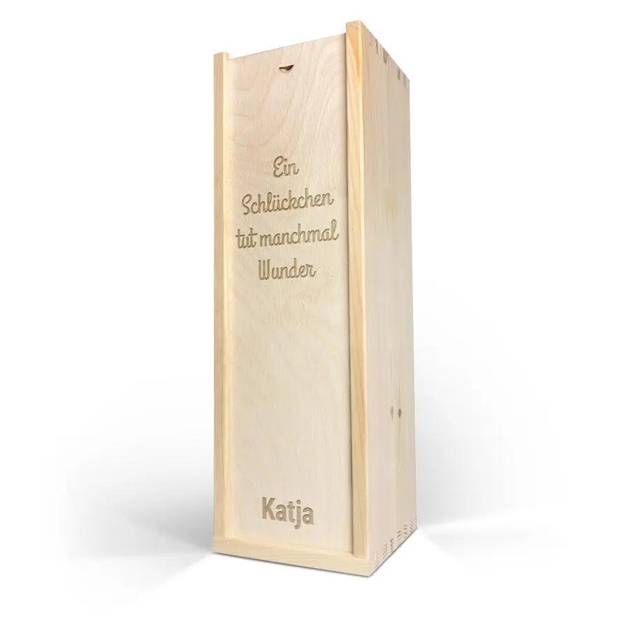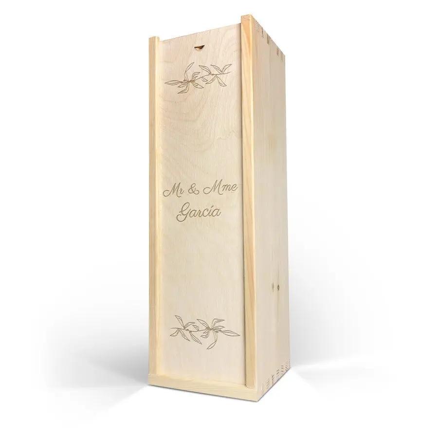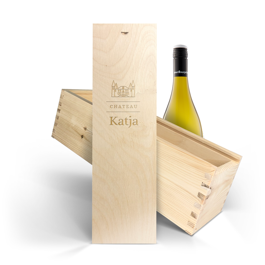 Pyszne wino Maison de la Surprise w luksusowej drewnianej skrzynce z wybranym przez Ciebie imieniem i/lub tekstem. Stwórz swoje już teraz!