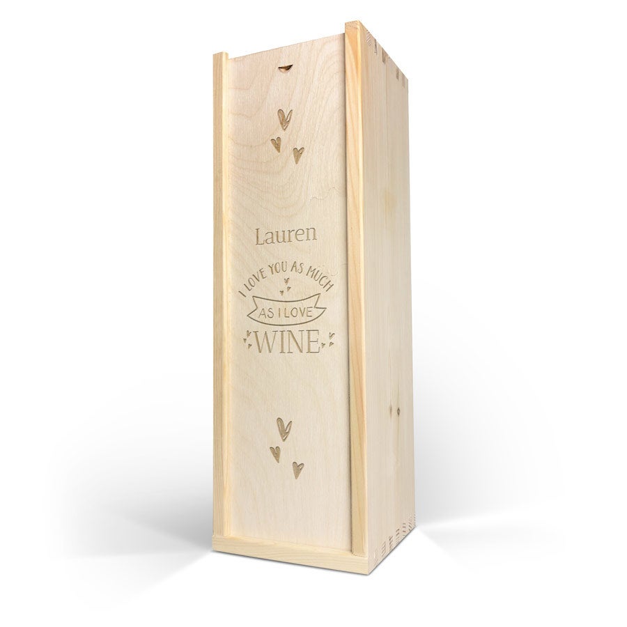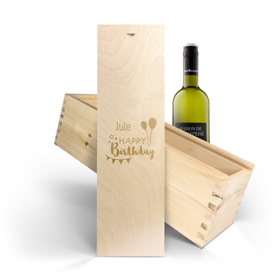 Pyszne wino Maison de la Surprise w luksusowym drewnianym pudełku z nazwą i/lub tekstem według Twojego wyboru. Stwórz swoje już teraz!