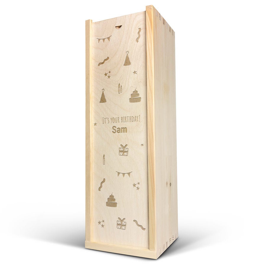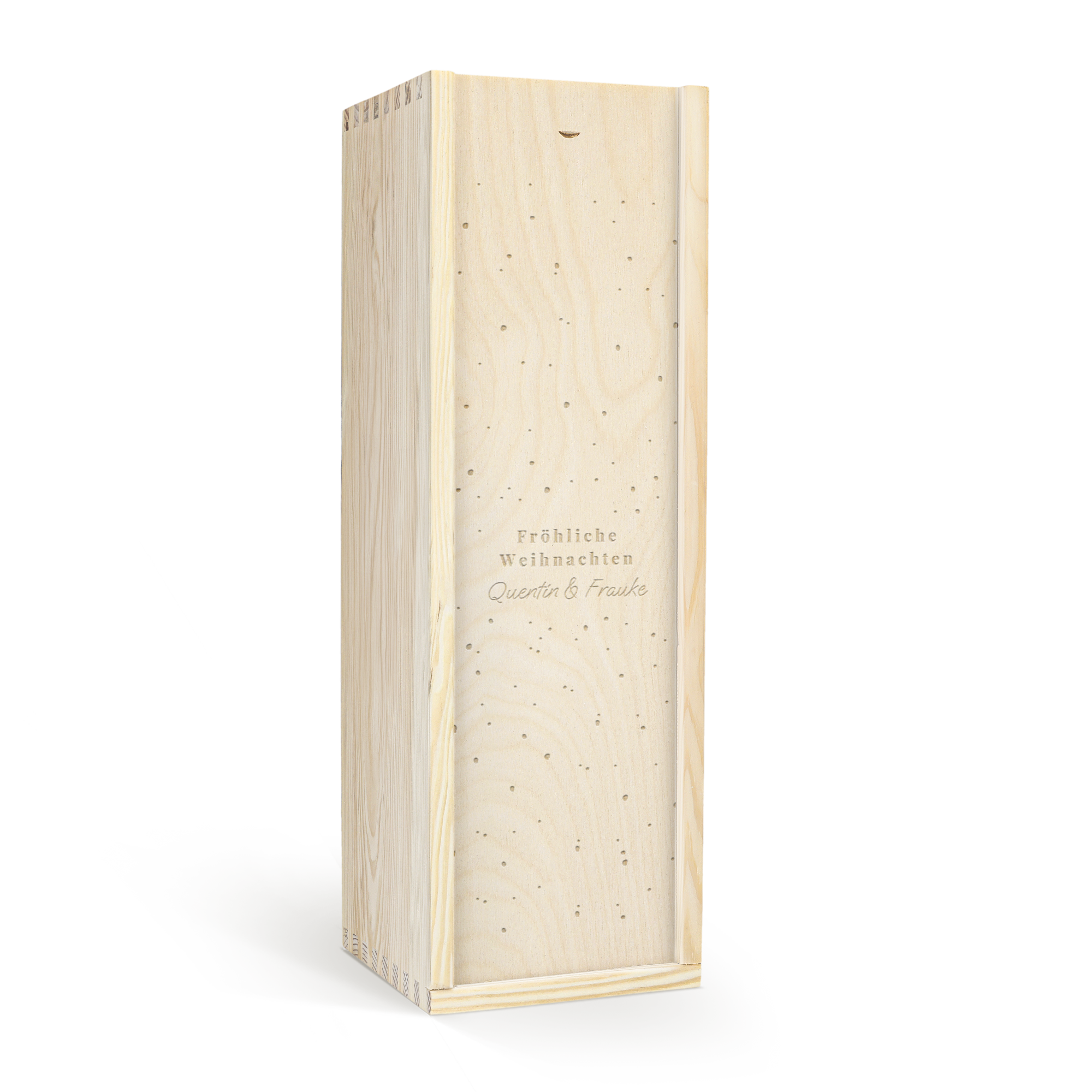 Pyszna butelka cavy Villa Conchi w drewnianym pudełku prezentowym z Twoim projektem. Idealna do zdjęcia i w pełnej gamie kolorów!