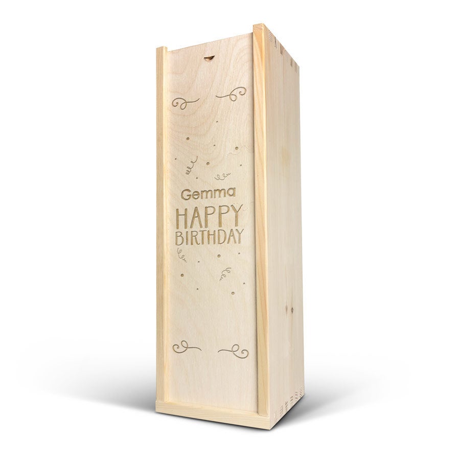 Więcej informacji na temat luksusowego etui na wino:Personalizacja: imieniem lub tekstemUmieszczenie personalizacji: na drewnianej pokrywie etuiMetoda personalizacji: wysokiej jakości grawerowanie laseroweWymiary etui: 36,5 x 12 x 11 cmWymiary pokrywy: 35,6 x 10,5 x 0,3 cmDodatkowo: drewniane etui posiada certyfikat FSCWięcej informacji na temat wina musującego:Marka: Palau GazoTyp: cavaPojemność: 750 mlKraj pochodzenia: HiszpaniaWinogrona: Parellada, Macabeo i Xarel-LoCharakter: Drobne bąbelki, owocowe z aromatami zielonego jabłka. Miękki, okrągły posmak. Idealne na imprezy