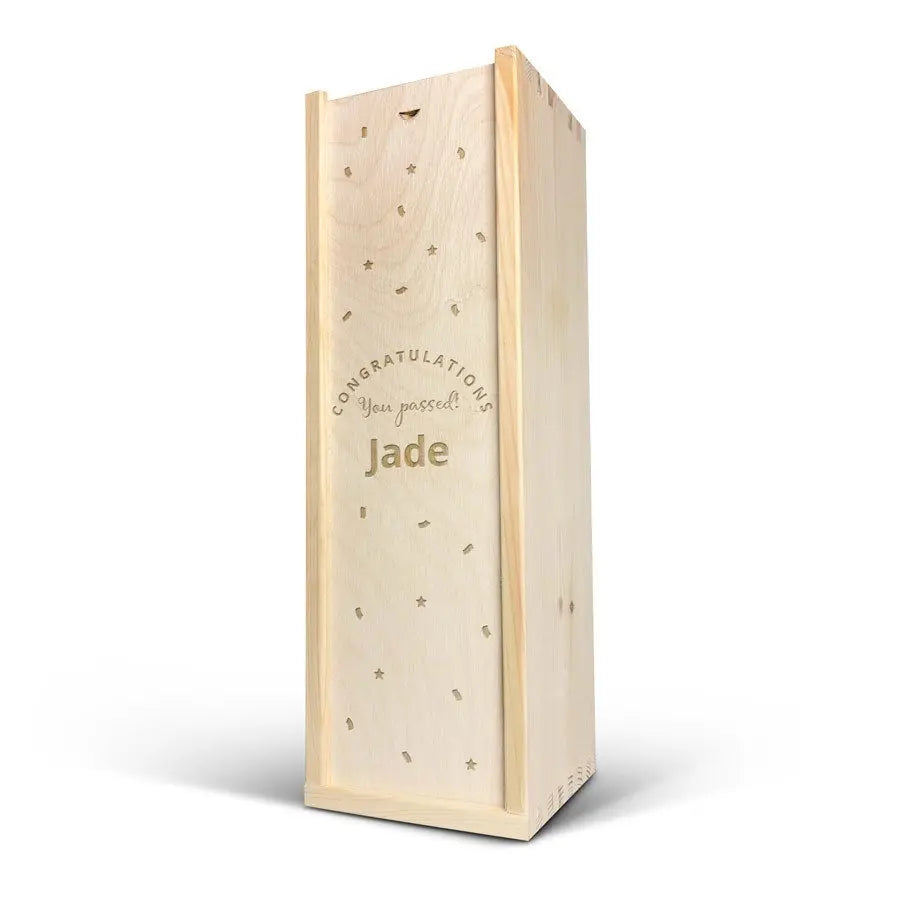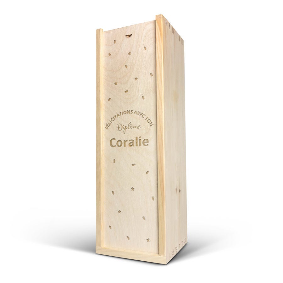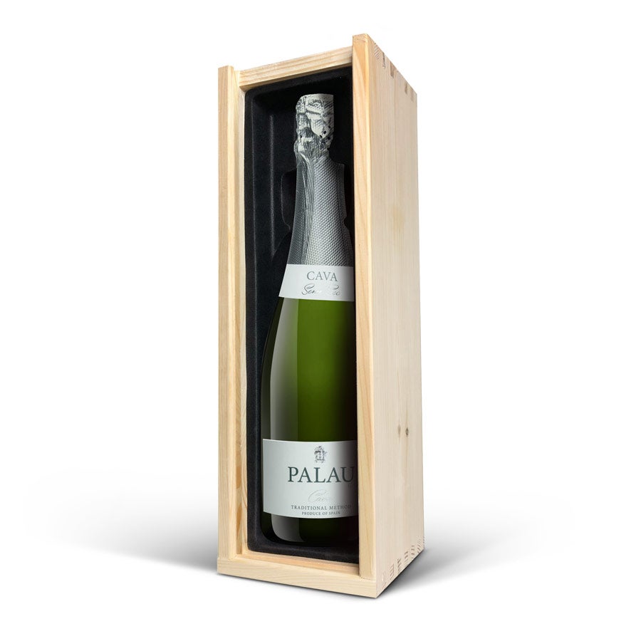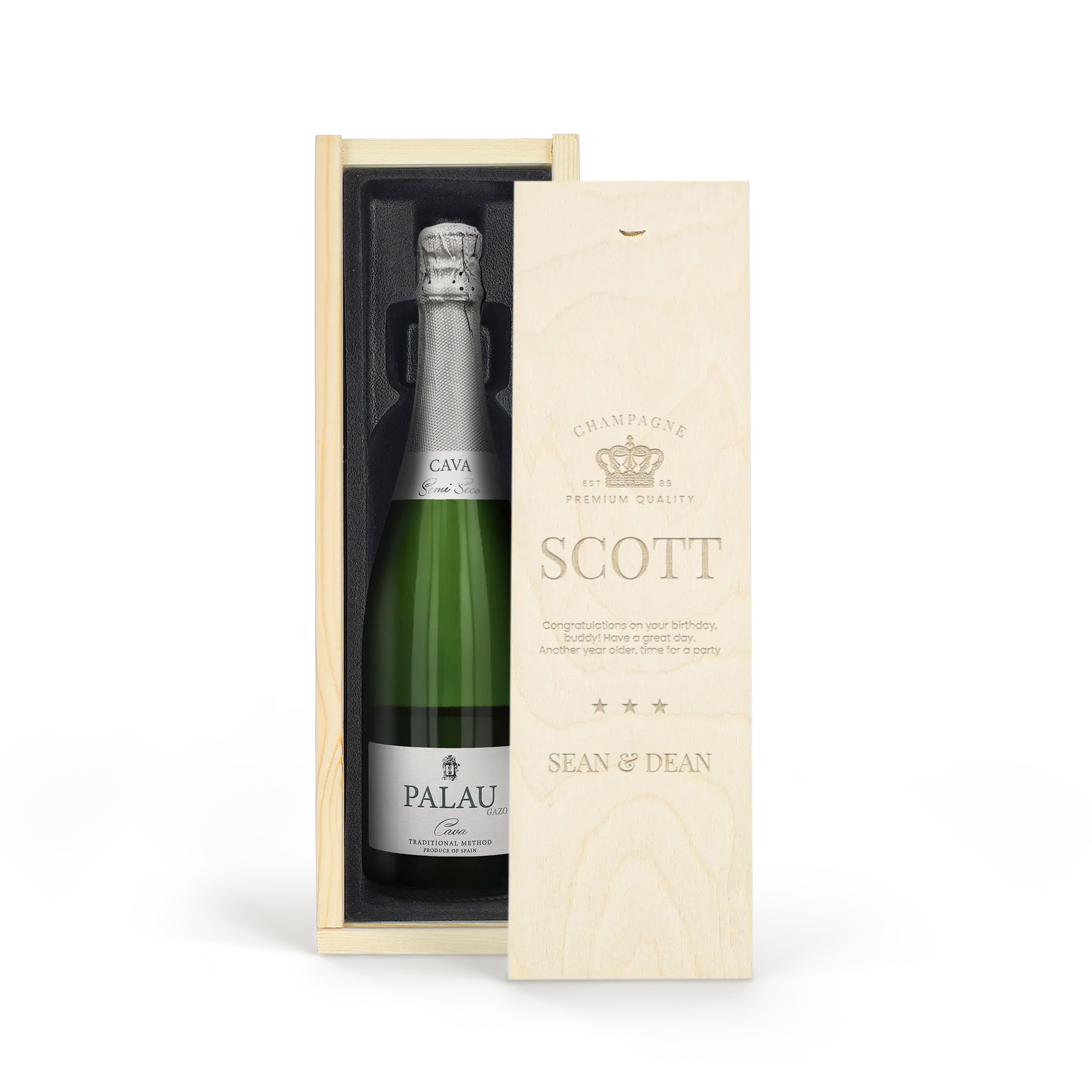Pyszna butelka cavy Palau Semi-Seco w luksusowym drewnianym opakowaniu z wygrawerowanym Twoim imieniem i/lub tekstem. Oryginalny prezent!