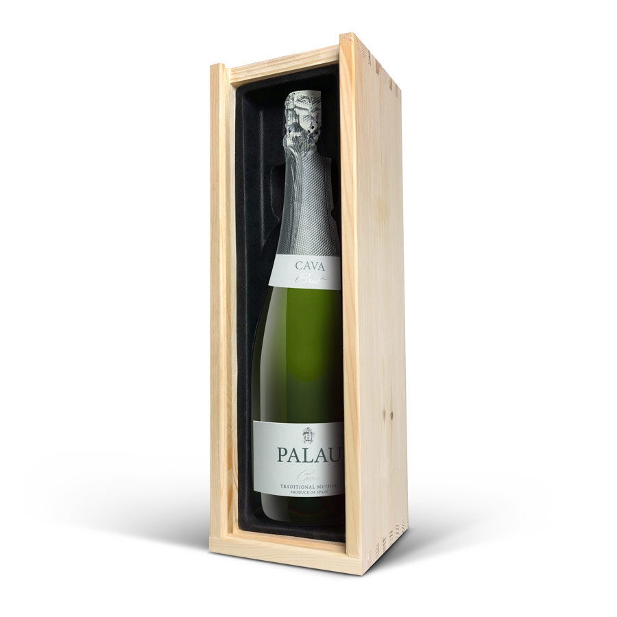 Pyszna butelka wina musującego Cava Palau Gazo w grawerowanym etui. Spersonalizuj według własnego uznania tekstem w unikalnym projekcie!