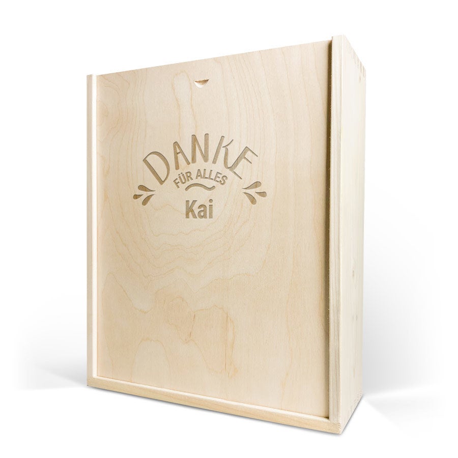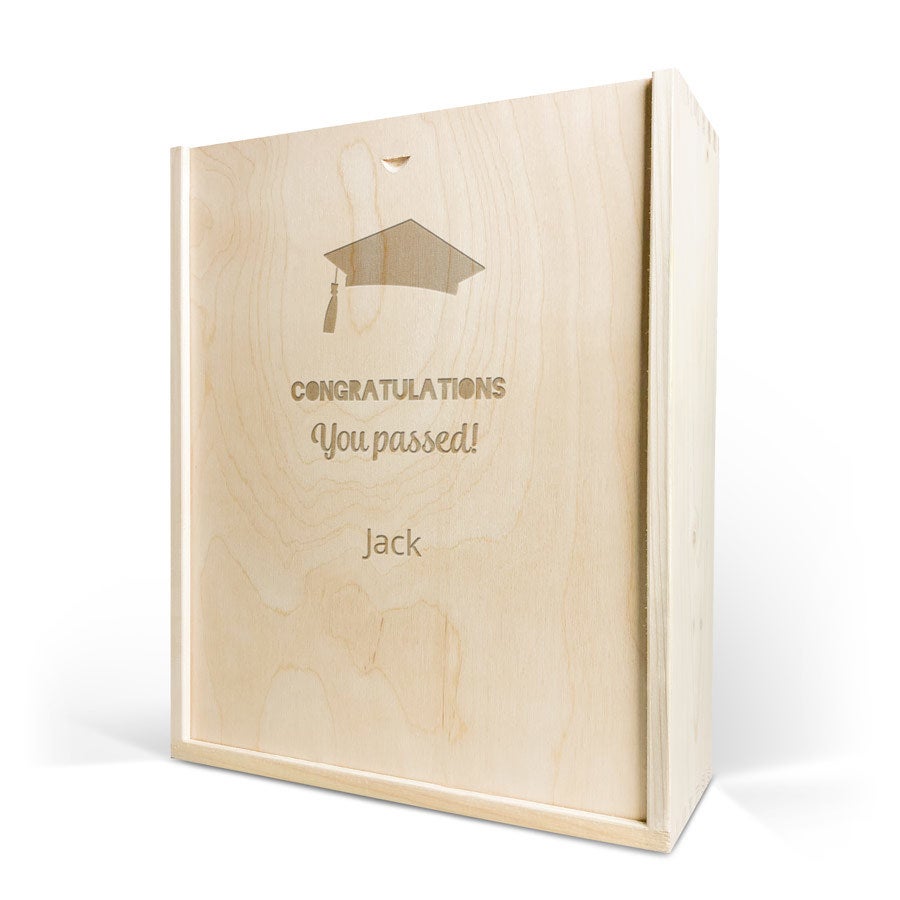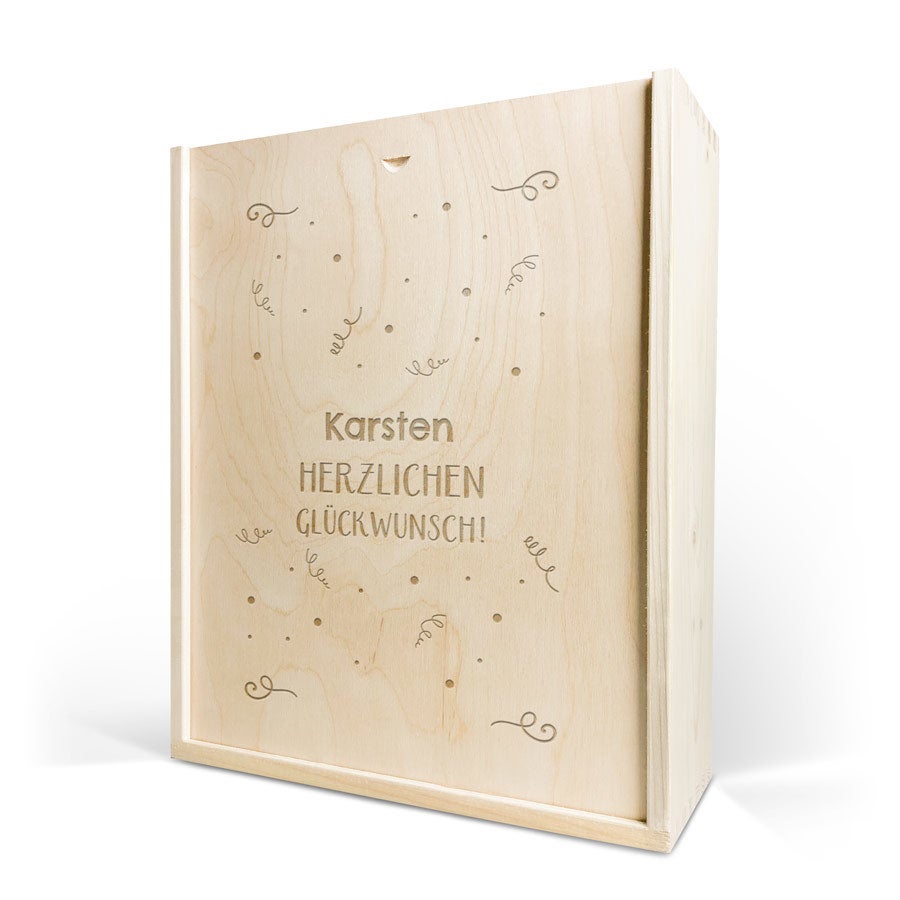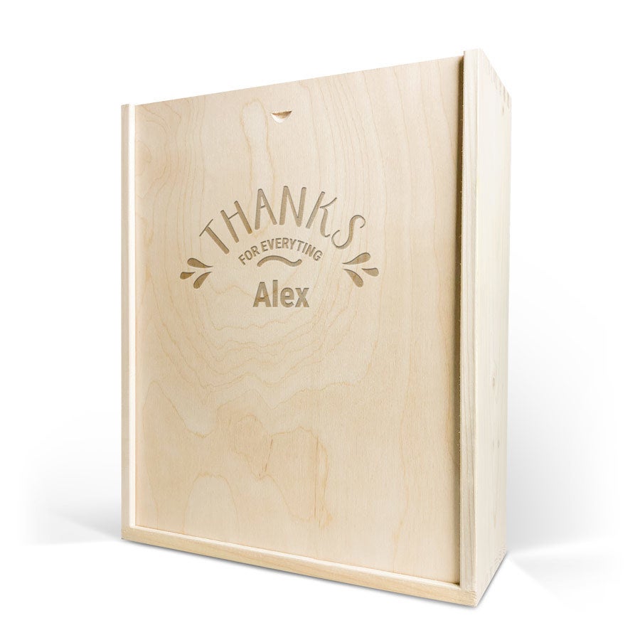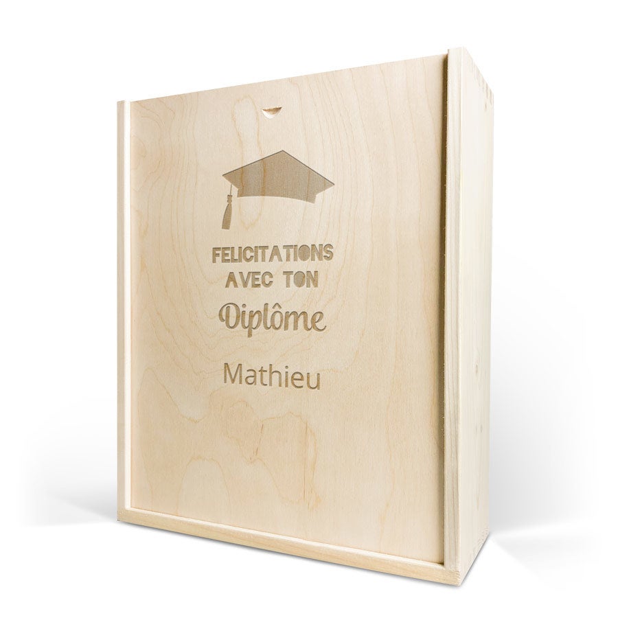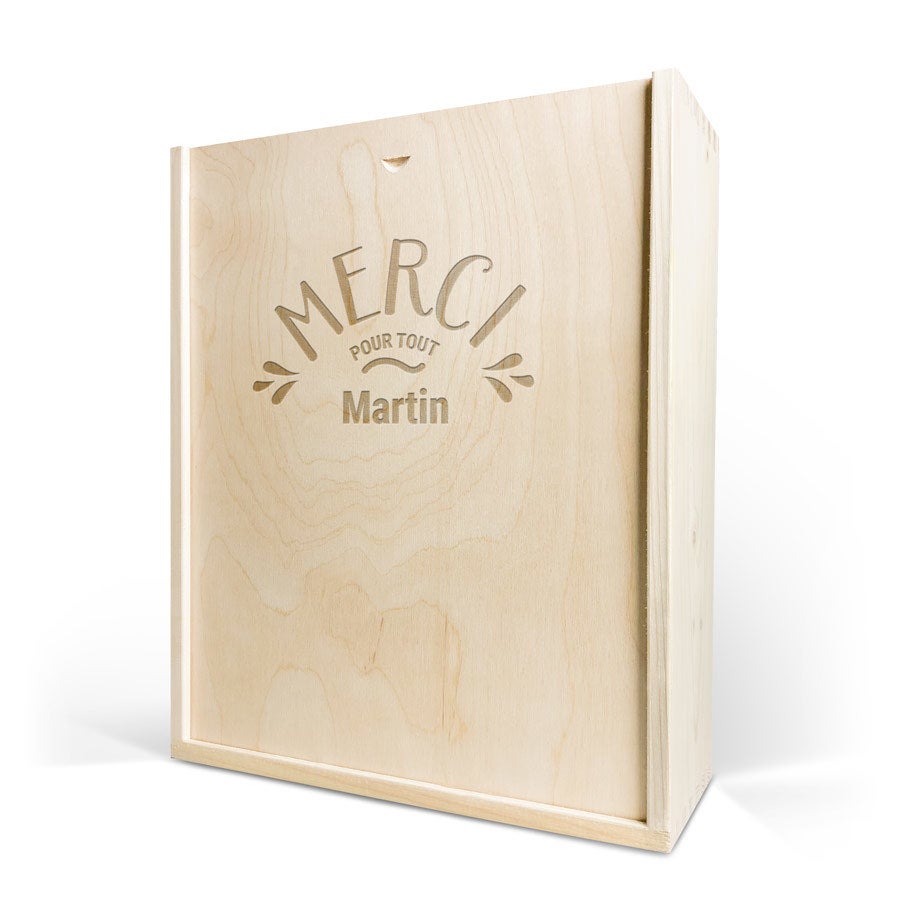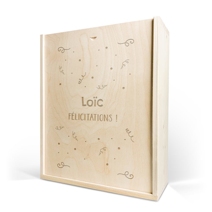 Personalizowane drewniane etui, które staje się pamiątką na lata. Możliwość wyboru spośród trzech rodzajów wina Maison de la Surprise.