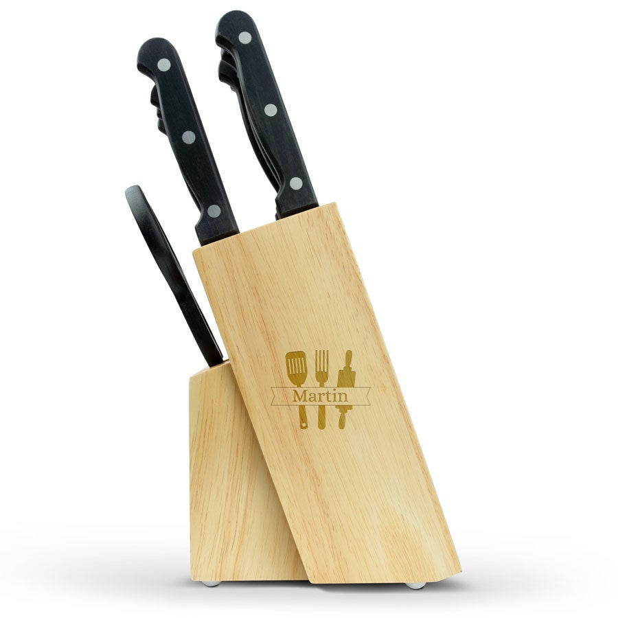 Zaskocz swojego ulubionego szefa kuchni luksusowym, drewnianym blokiem na noże. Piękny grawerunek imienia lub tekstu do wyboru. W zestawie 9-częściowy zestaw noży.