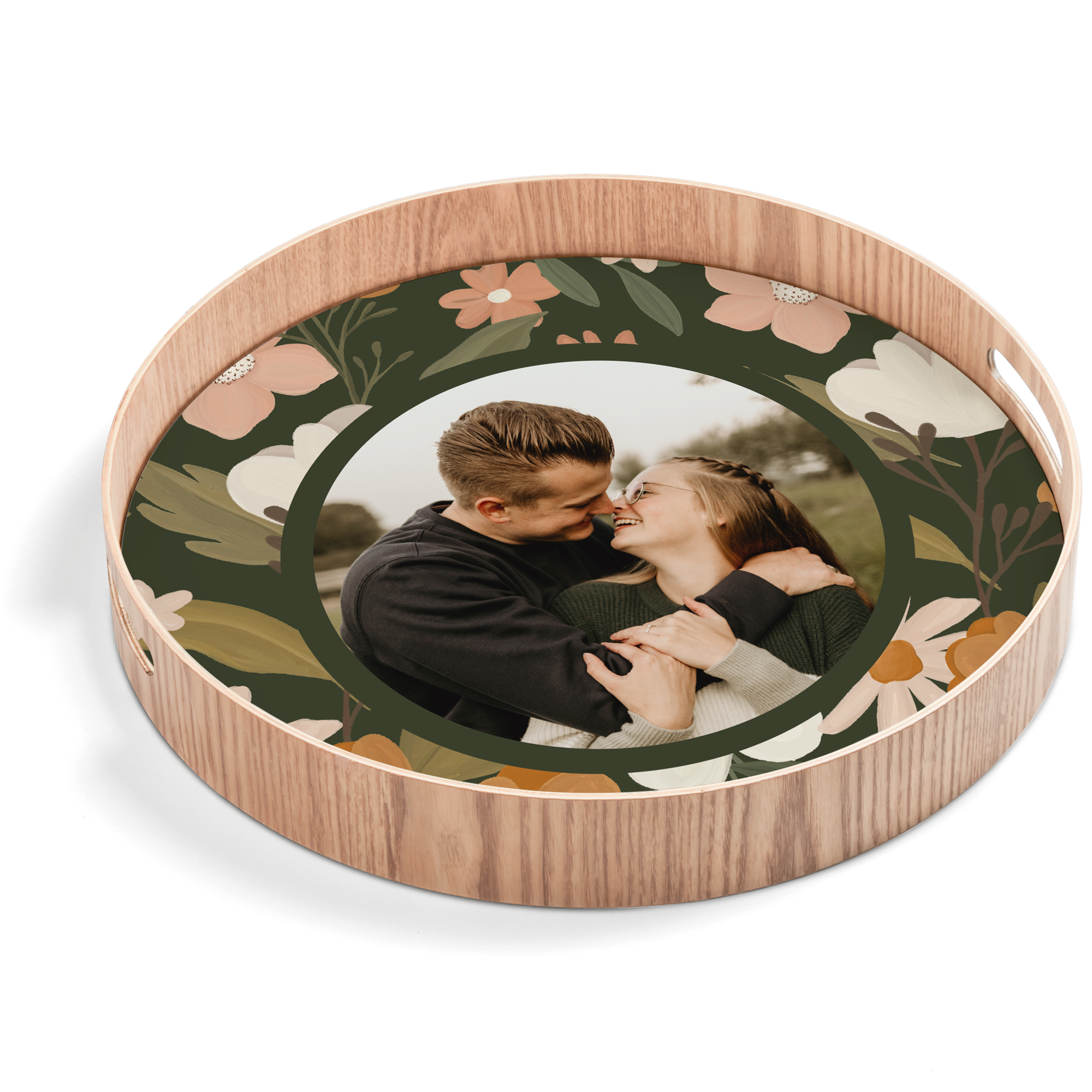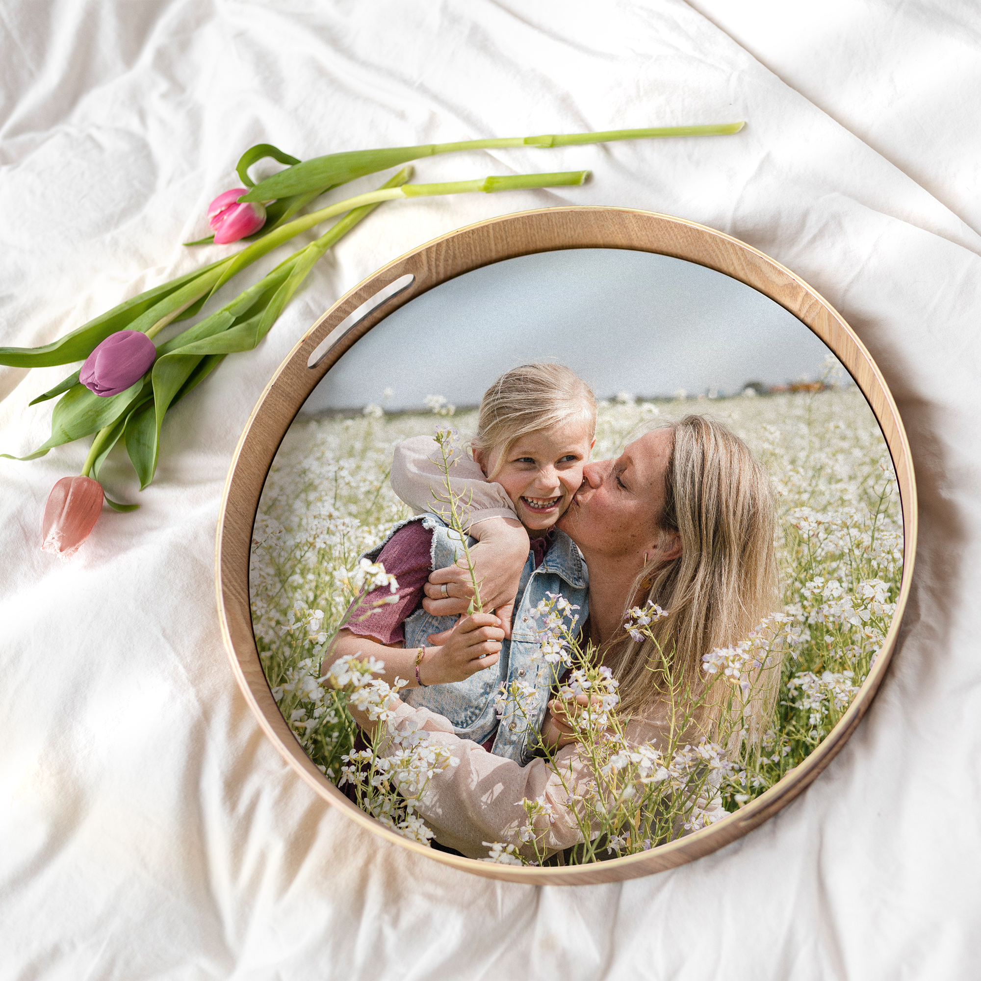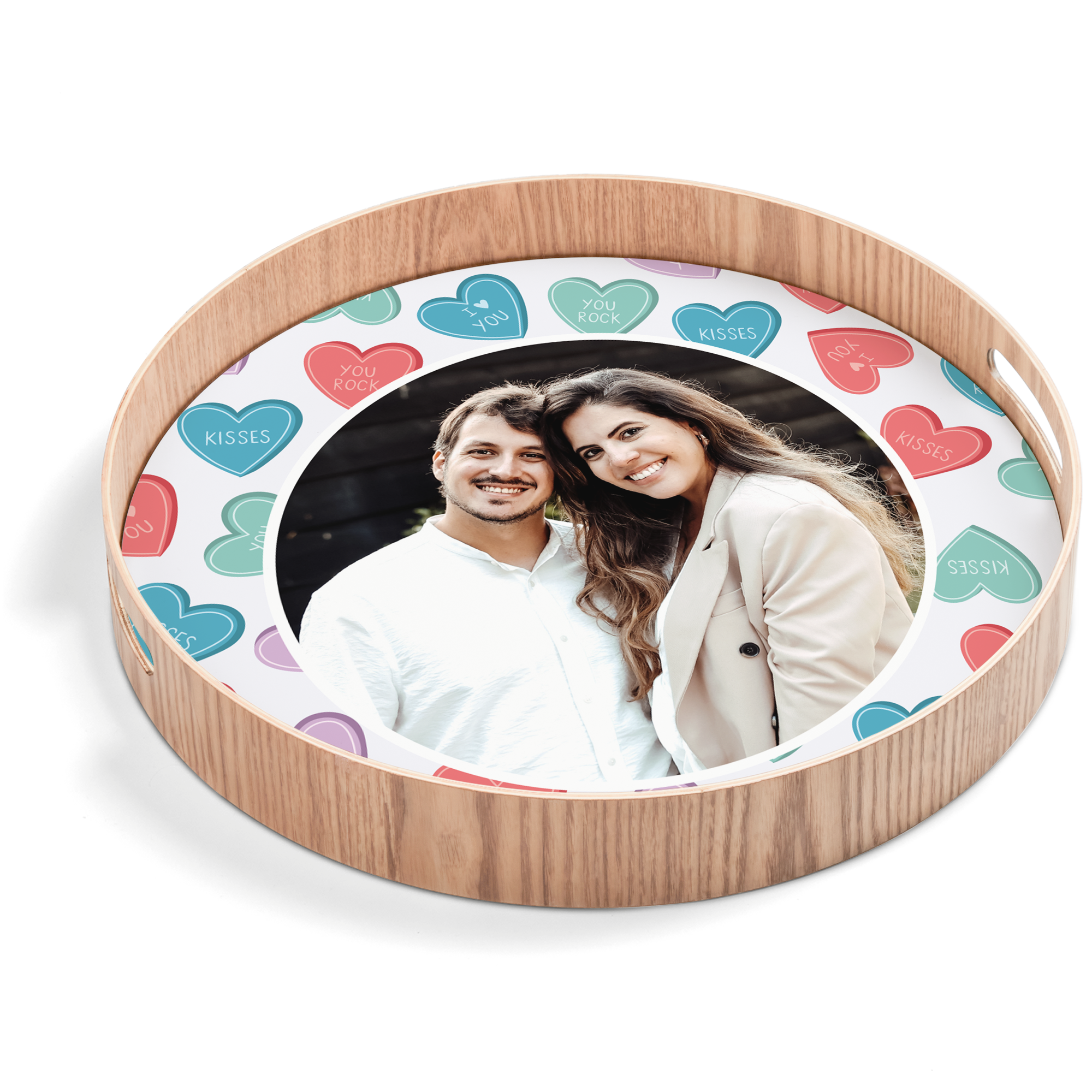 Więcej informacji na temat personalizowanej tacy do serwowania:Kształt: okrągłyKolor: drewnoMateriał: luksusowa drewniana rama (drewno sosnowe) z podstawą z wysokiej jakości płyty pilśniowejWykończenie: błyszcząceWymiary: 40 x 40 x 6 cmPersonalizacja: zdjęciem, imieniem, logo lub kolażemNadruk: idealny, w pełnym kolorze