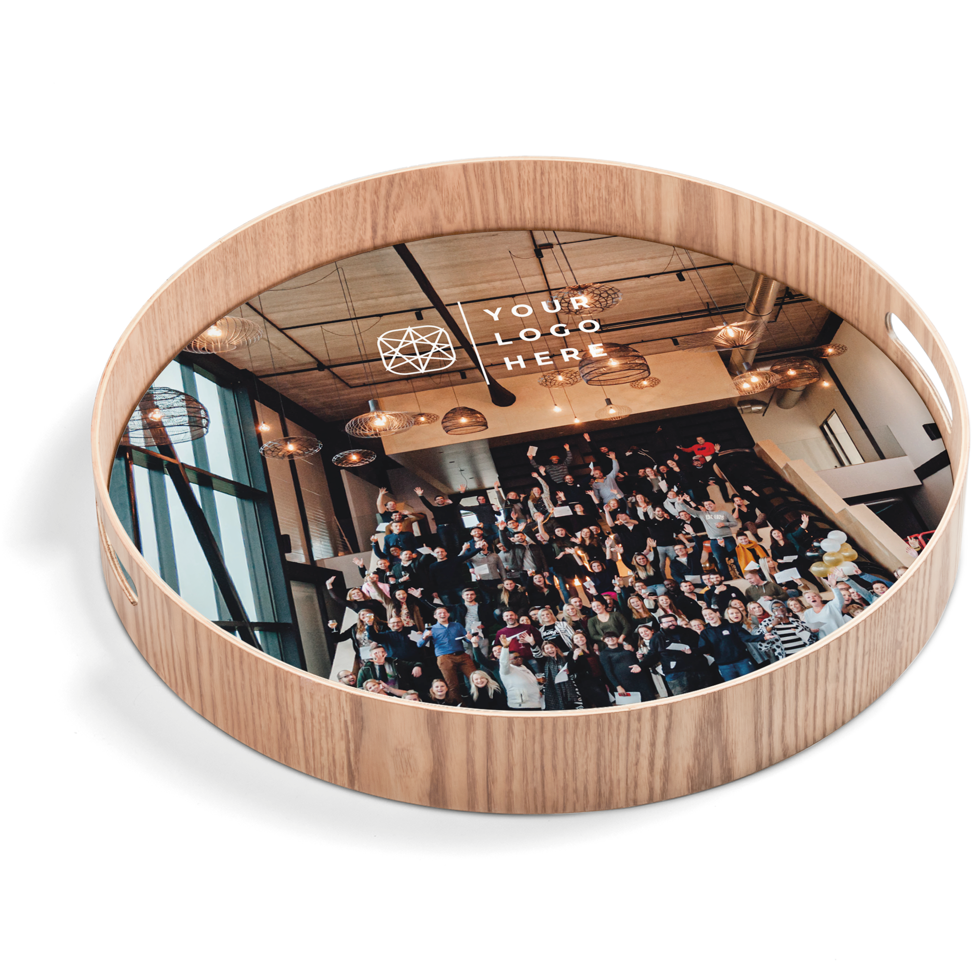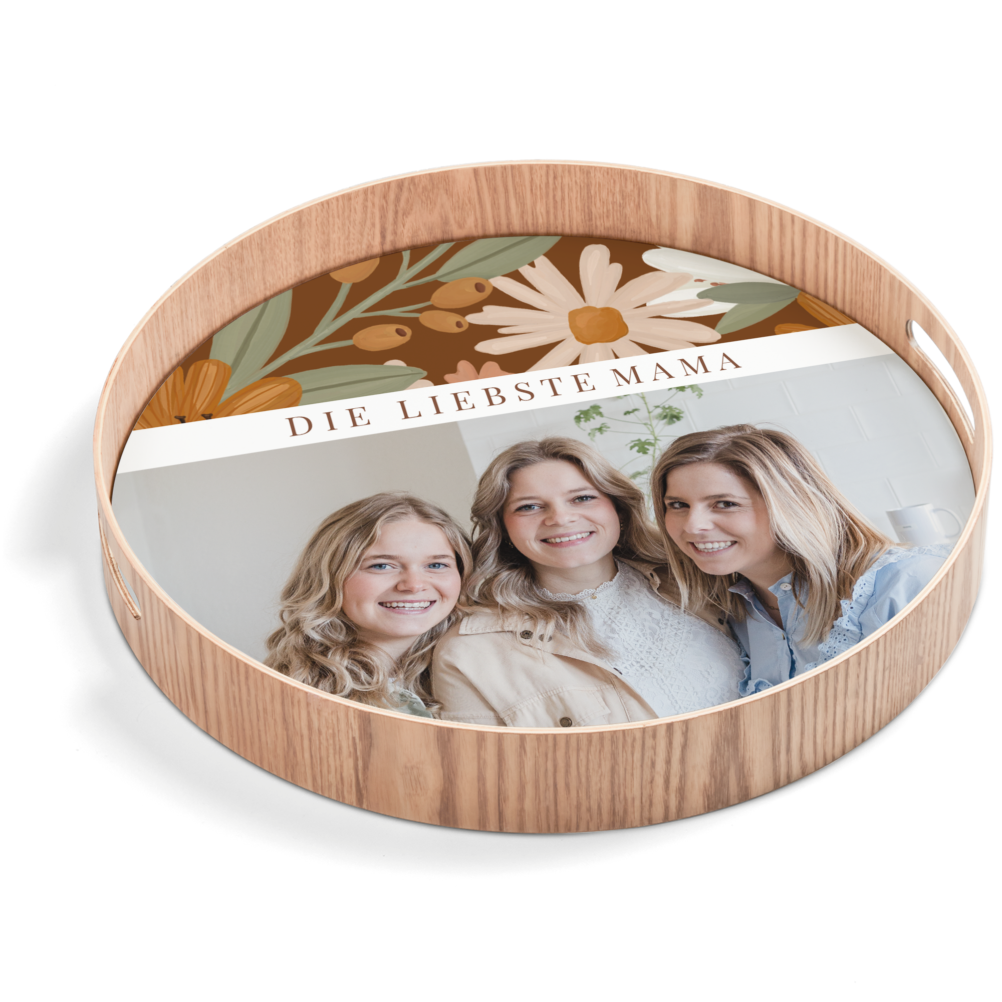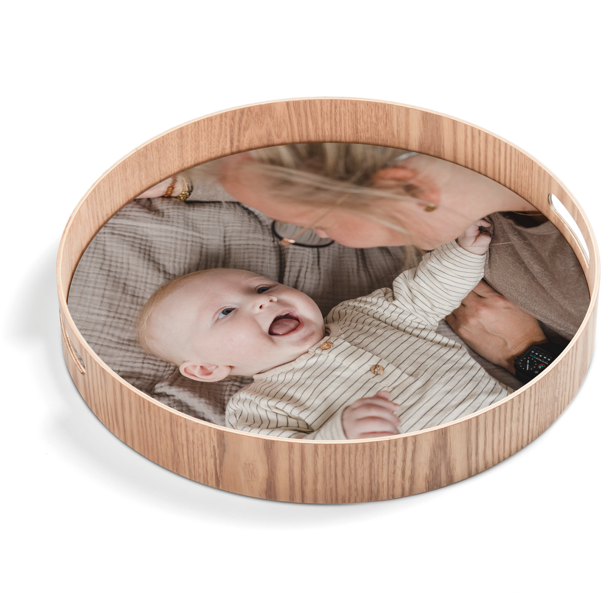 Więcej informacji na temat personalizowanej tacy do serwowania:Kształt: okrągłyKolor: drewnoMateriał: luksusowa drewniana rama (drewno sosnowe) z podstawą z wysokiej jakości płyty pilśniowejWykończenie: błyszcząceWymiary: 40 x 40 x 6 cmPersonalizacja: zdjęciem, imieniem, logo lub kolażemNadruk: idealny, w pełnym kolorze