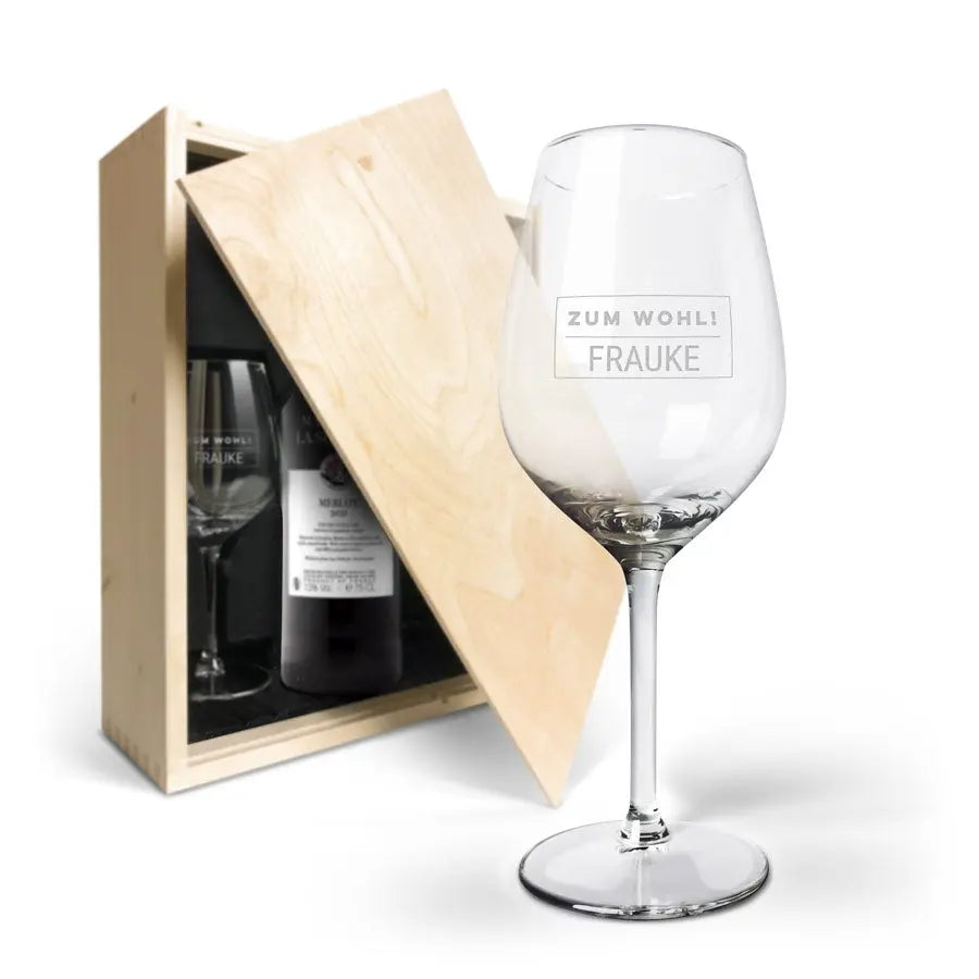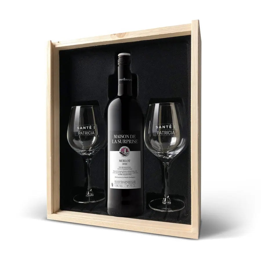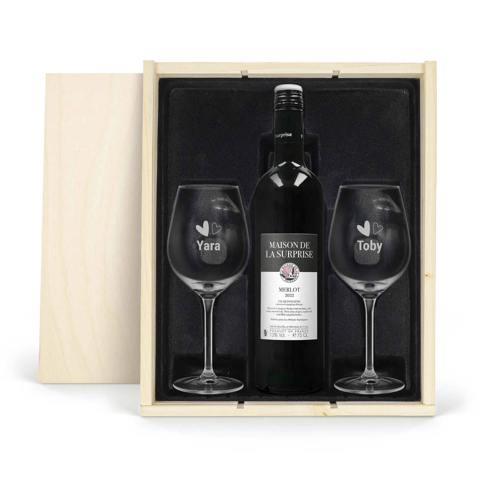 Luc Pirlet Merlot z grawerowanymi kieliszkami