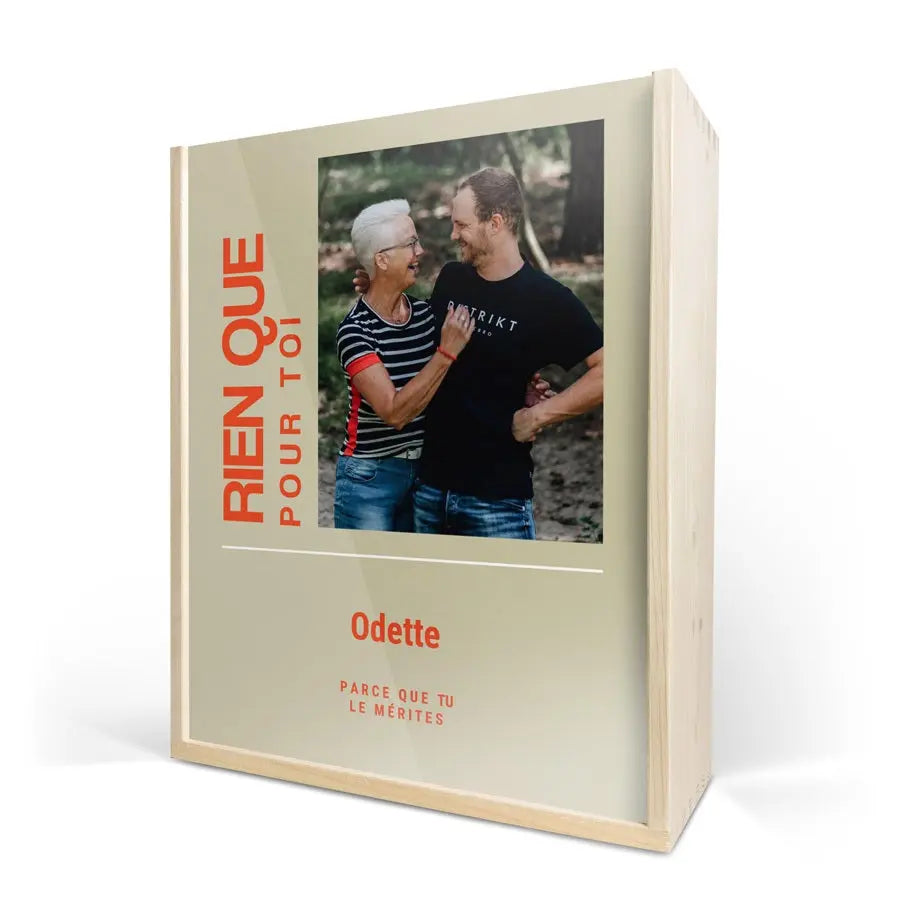 Pyszna butelka wina w luksusowym, spersonalizowanym etui. Ze zdjęciem, logo, kolażem, imieniem i/lub tekstem według Twojego wyboru!Więcej informacji o kieliszkach do szampana:Ilość: 2 kieliszkiMarka: Royal LeerdamTyp: L' EspritWysokość: 21,5 cmPojemność: 21 clWięcej informacji o luksusowym drewnianym etui:Personalizacja: zdjęciem, kolażem, logo, imieniem i/lub tekstemUmieszczenie personalizacji: na pokrywieNadruk: idealny obraz i w pełnym kolorzeWymiary etui: 36,5 x 12 x 11 cmWymiary pokrywy: 35,6 x 10,2 x 0,3 cmDrewniane etui wykonane jest z drewna z certyfikatem FSC.Więcej informacji o winie:Marka: Riondo Prosecco SpumanteTyp: prosecco, extra dryPojemność: 750 mlKraj pochodzenia: WłochyWinogrono: chardonnay, gleraCharakter: Riondo Prosecco Spumante ma aromaty gruszki, Jabłko, słodycze i białe kwiaty. Dobrze komponuje się z krewetkami i pikantnymi tapas.