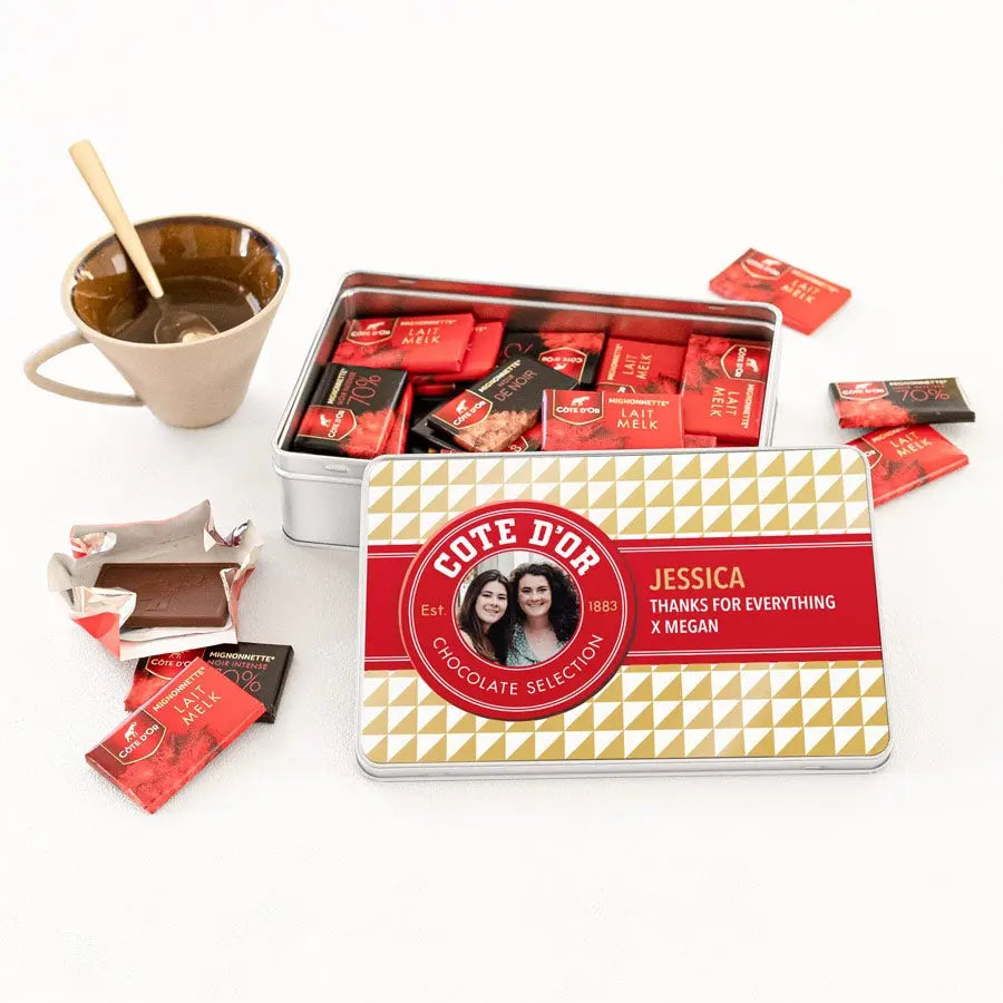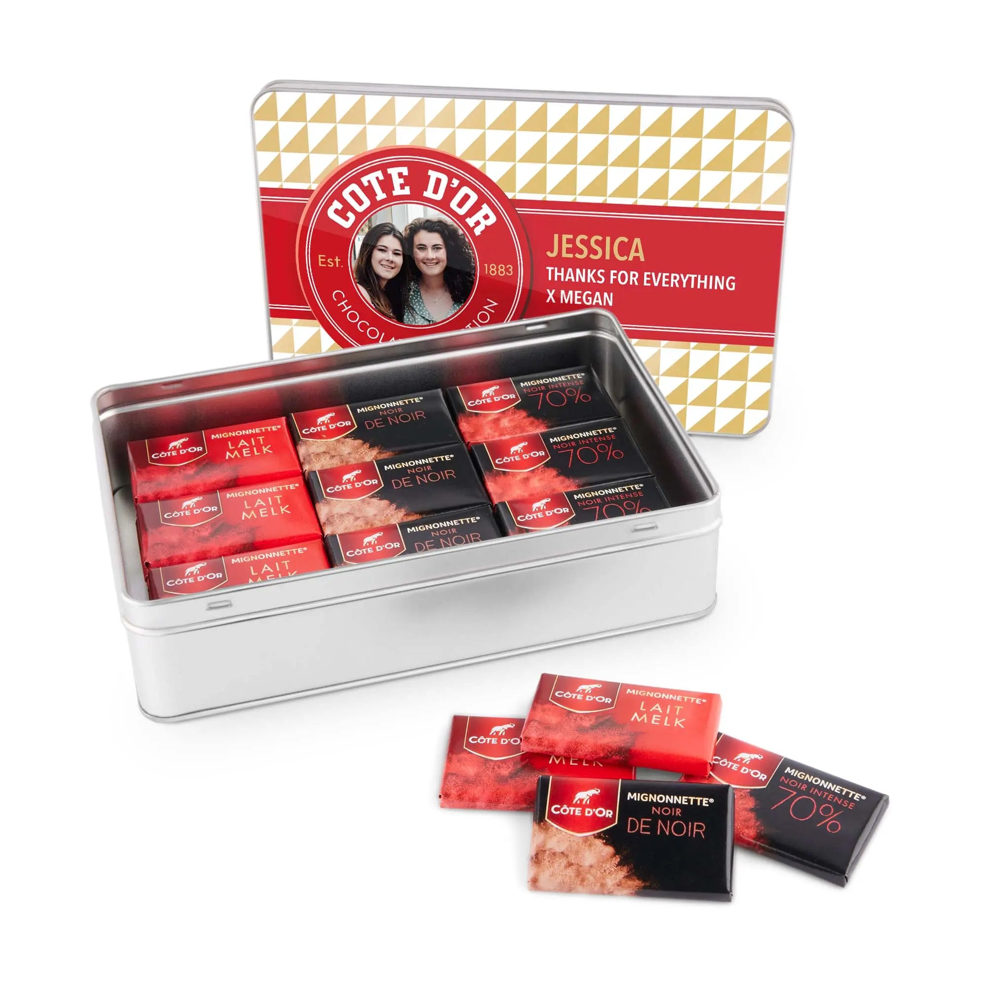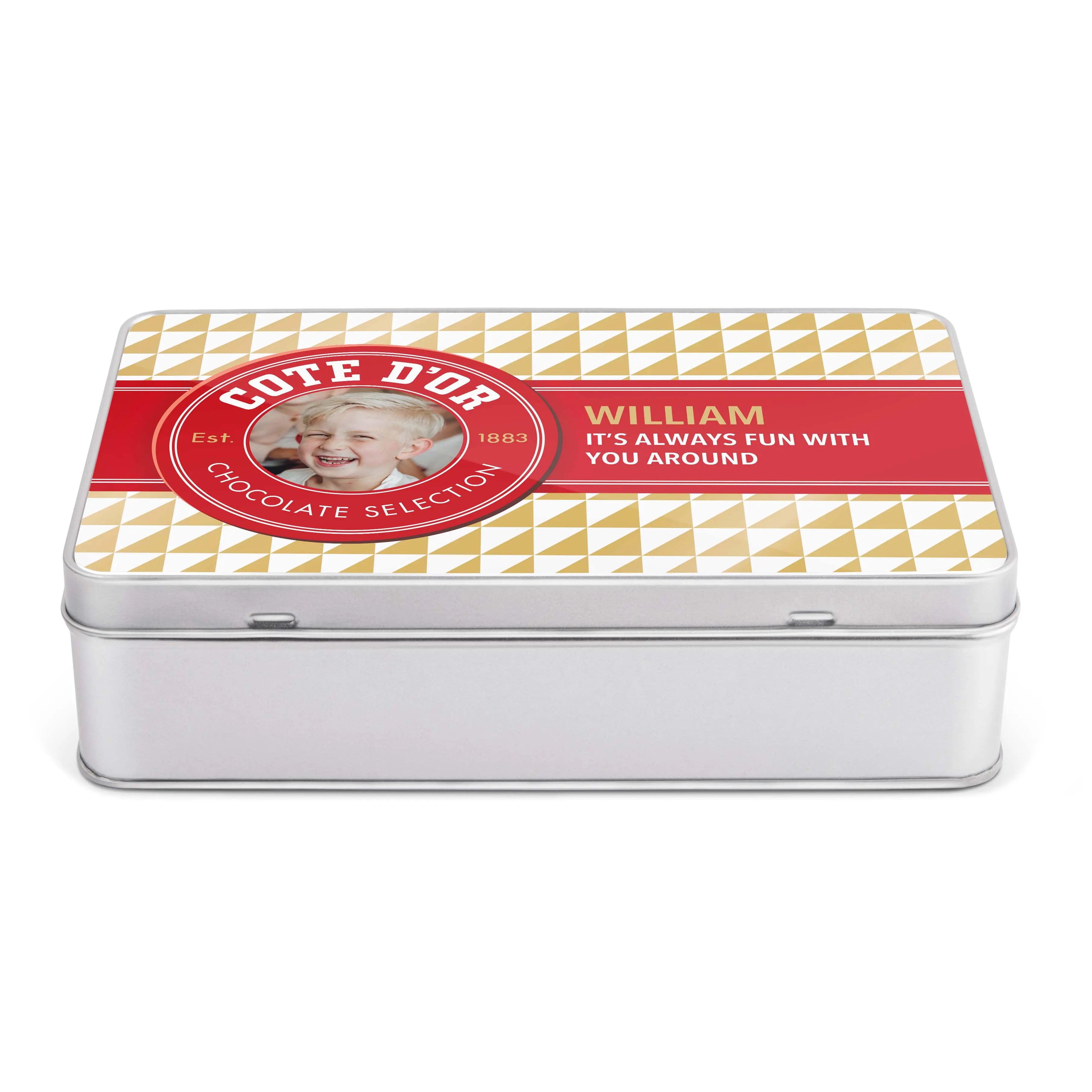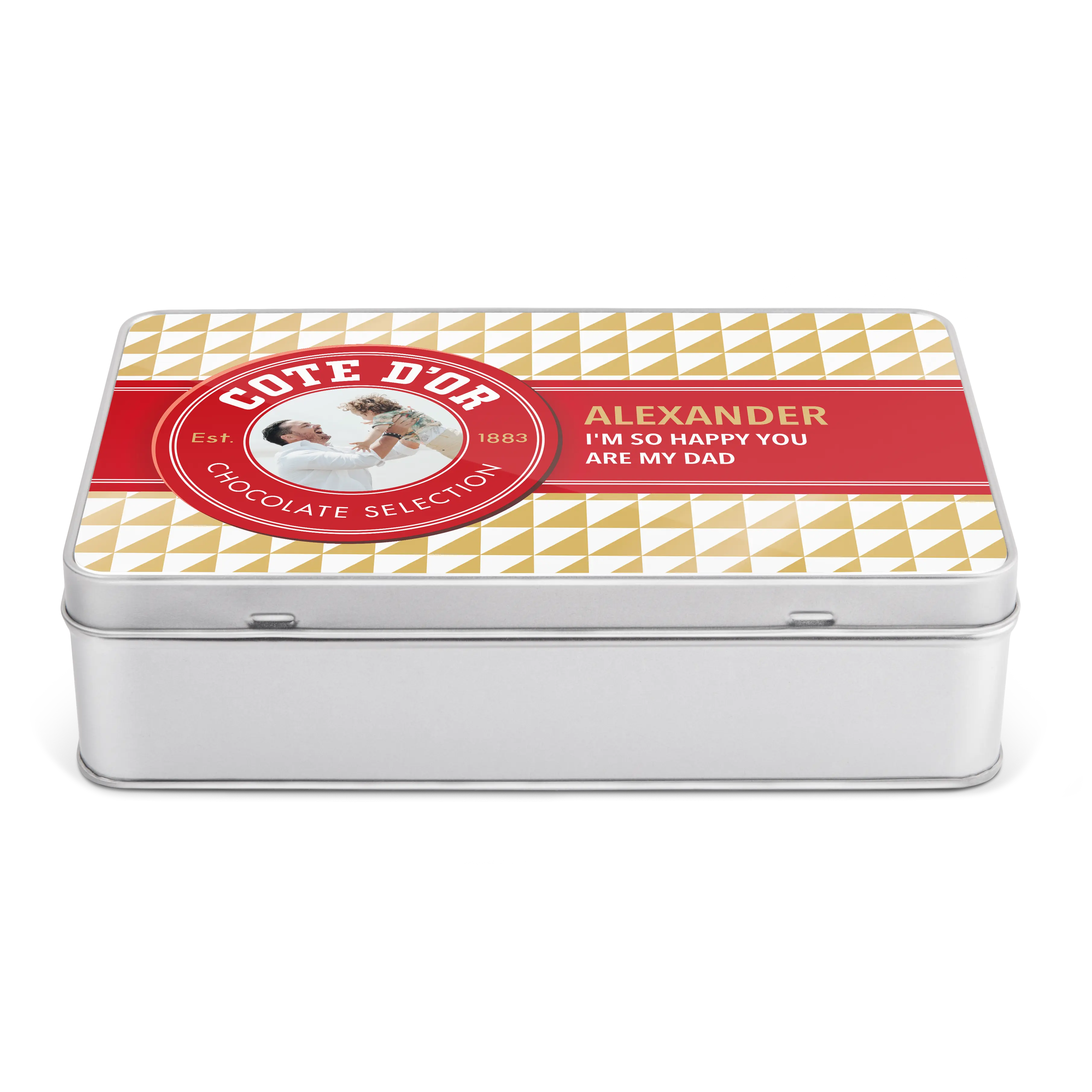 Personalizowana puszka prezentowa wypełniona czekoladkami Côte d’Or ze zdjęciem i/lub imieniem do wyboru!