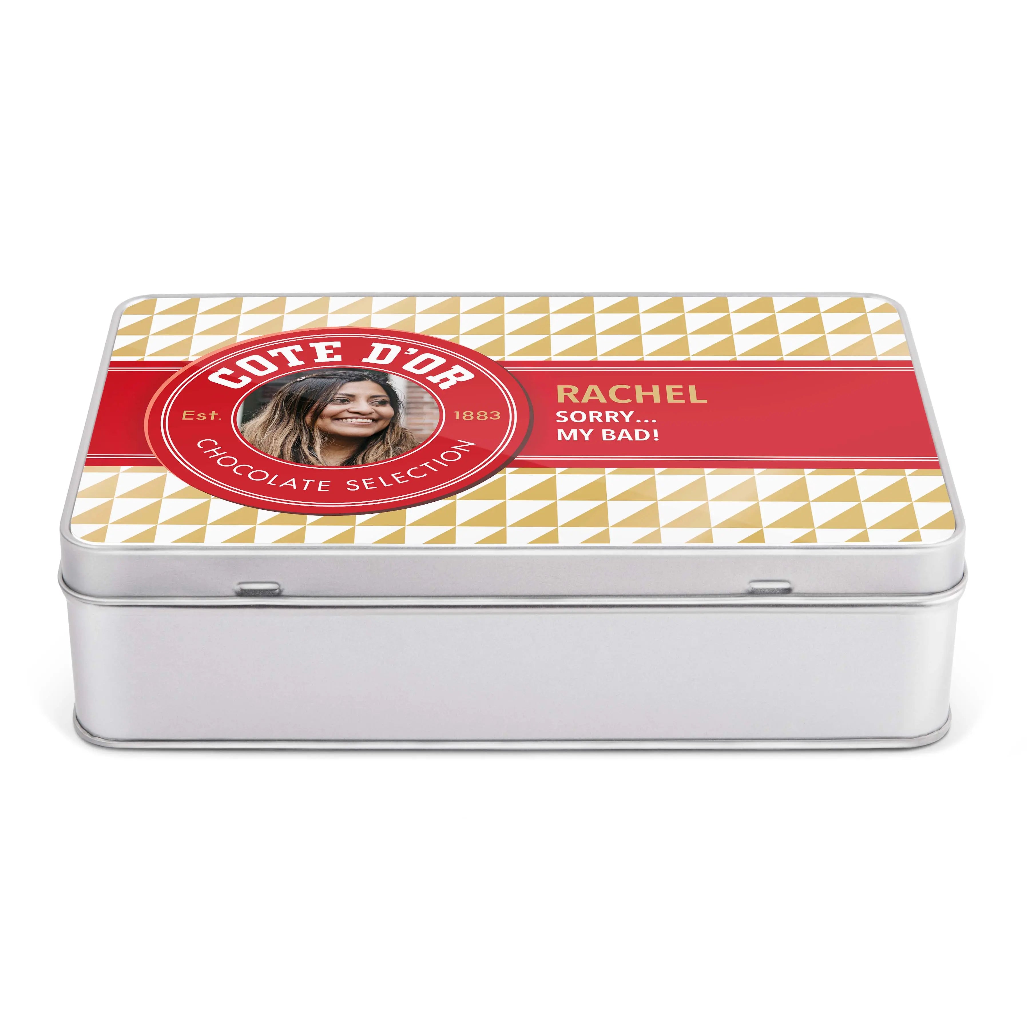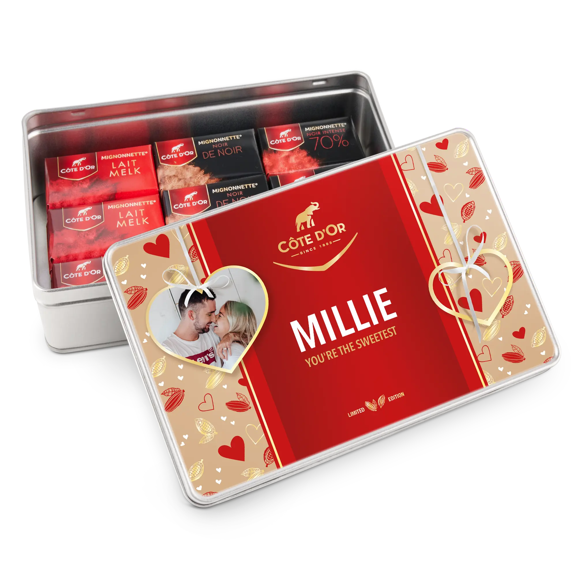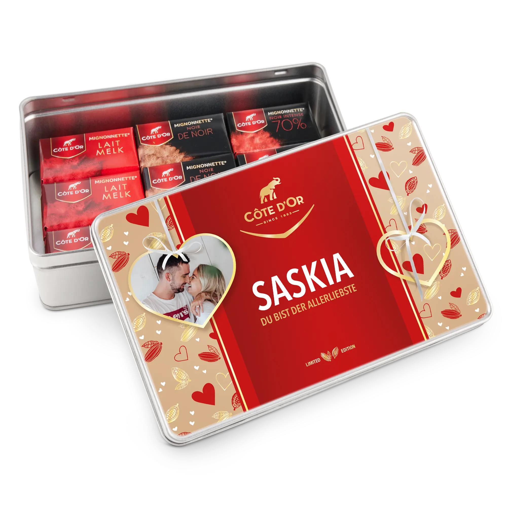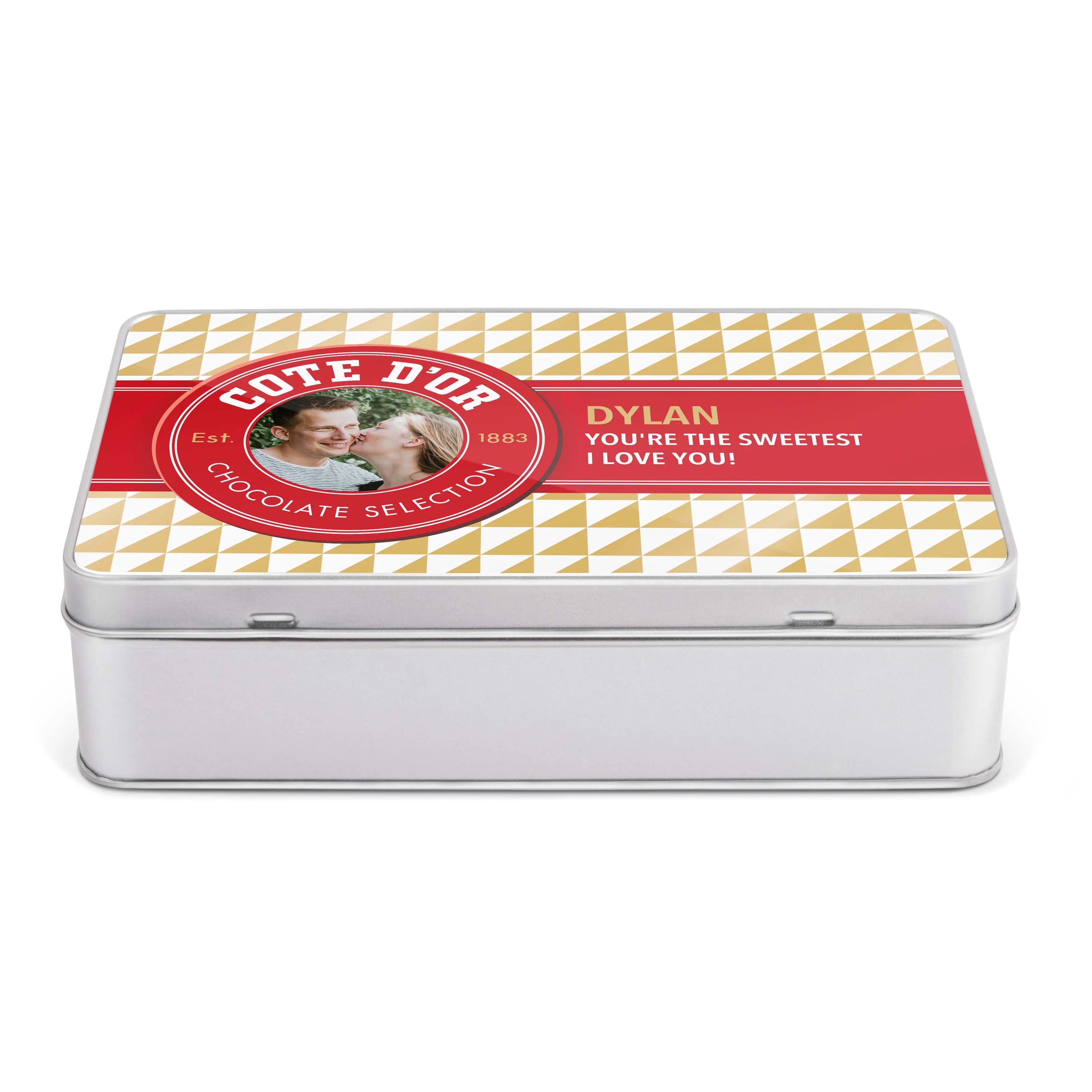 Personalizowana puszka prezentowa wypełniona czekoladkami Côte d’Or ze zdjęciem i/lub imieniem do wyboru!