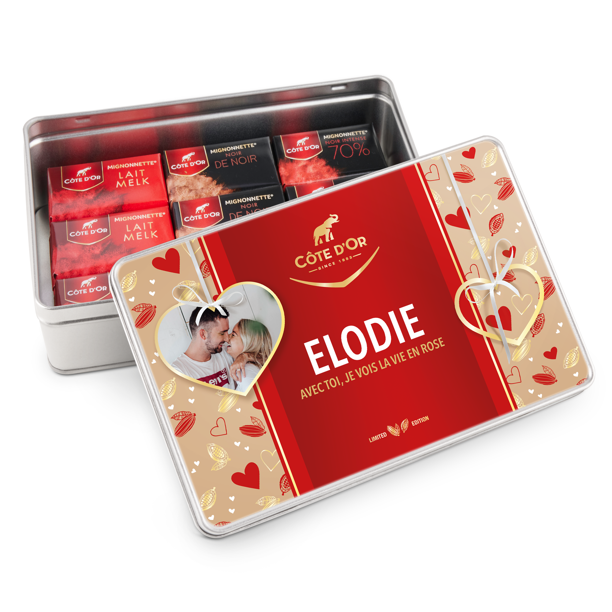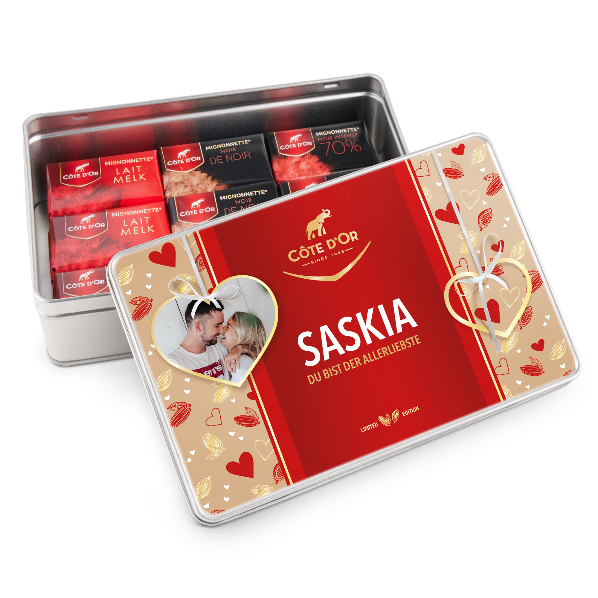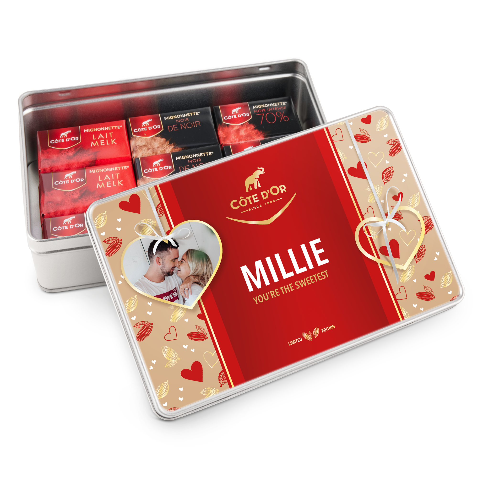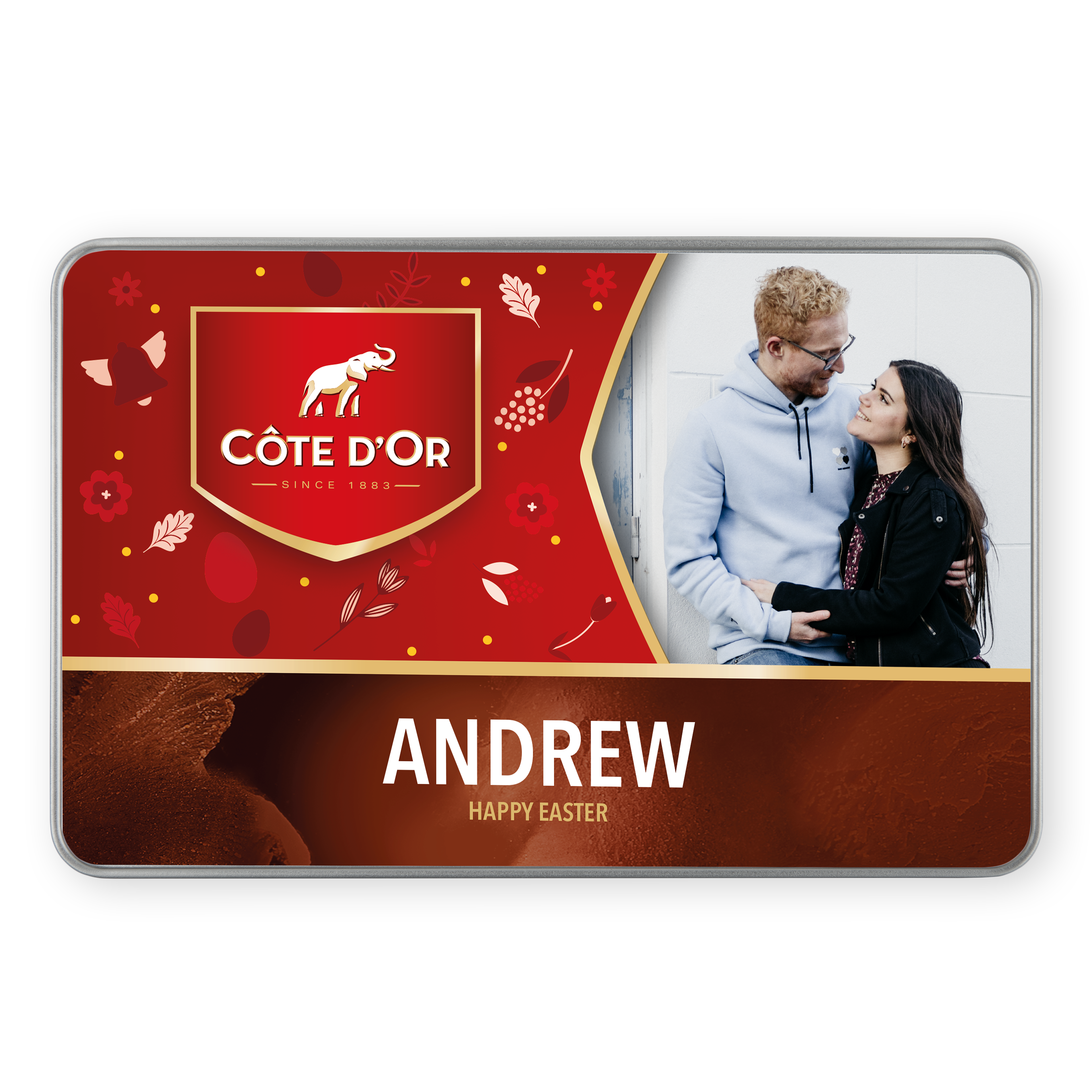 Personalizowana puszka dodaje sentymentalnego charakteru, idealna jako pamiątka. Wykwintna czekolada Côte d'Or zapewnia niezapomniane doznania smakowe.