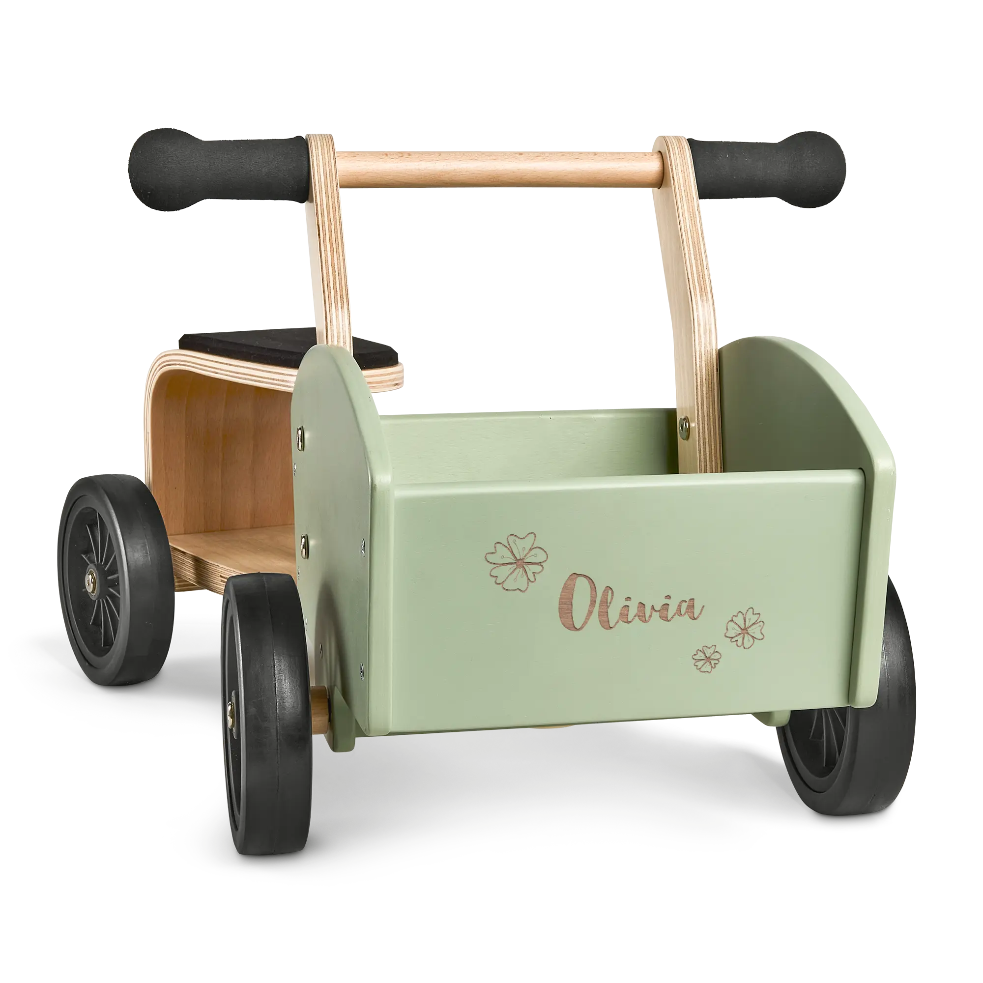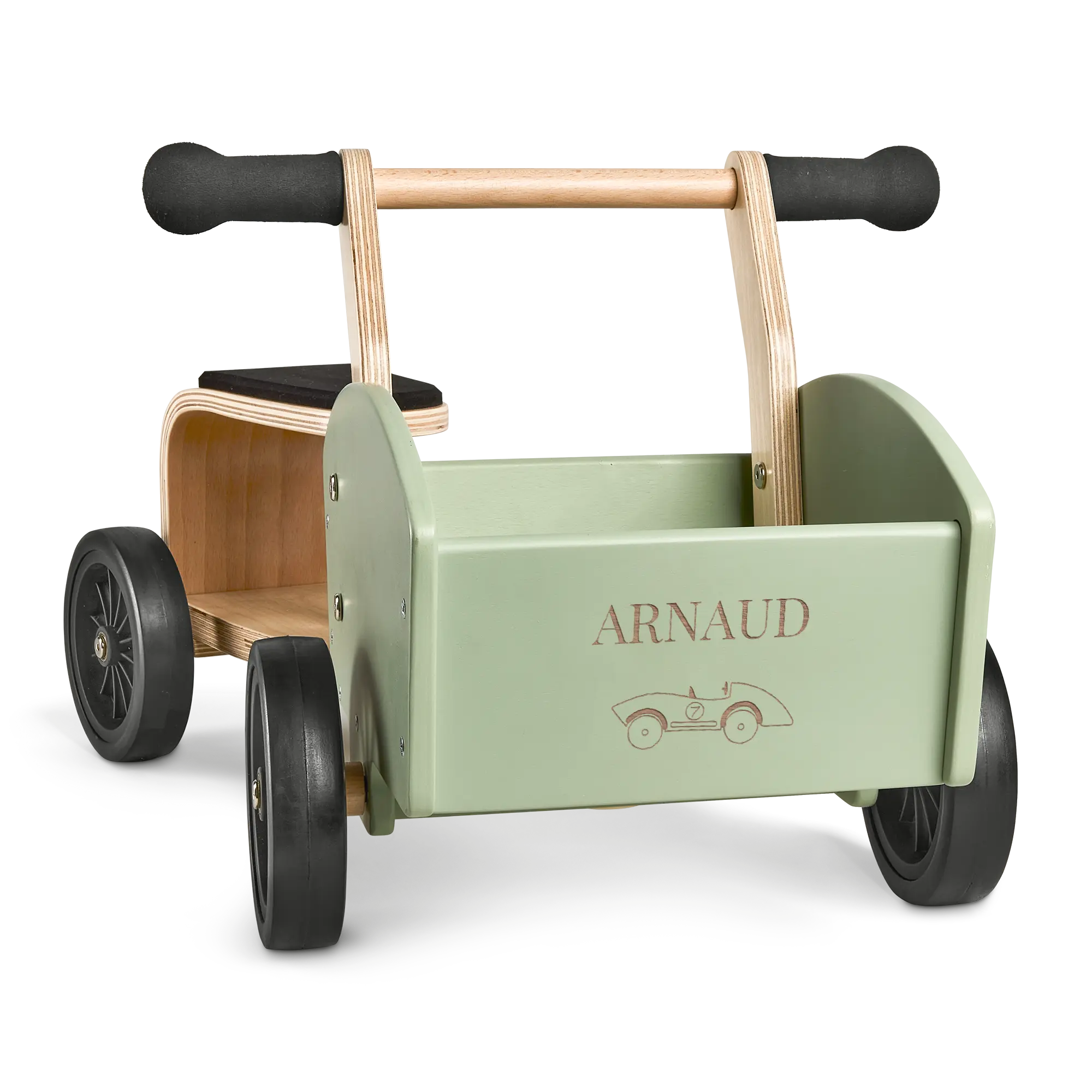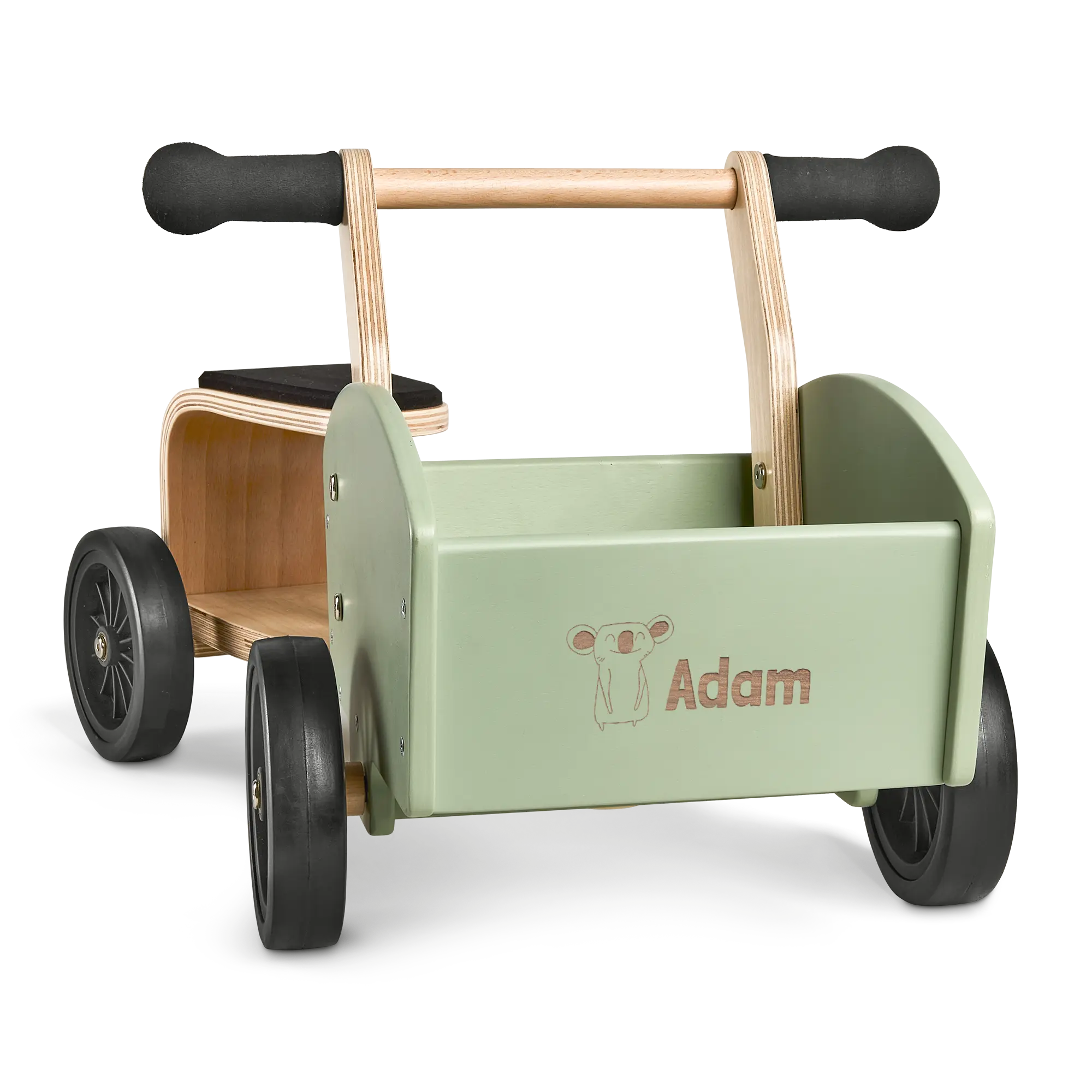 Wyjątkowy drewniany rower cargo z imieniem. Wysokiej jakości drewno brzozowe, personalizowany grawerunkiem. Zarówno dla chłopców, jak i dziewczynek!Więcej informacji o grawerowanym drewnianym rowerze cargo:Wymiary: 66 x 35,6 x 38 cmWysokość siedziska: 25 cmWiek: od 1 rokuWaga: ± 4 kgMaksymalne obciążenie: 25 kgRodzaj drewna: superwytrzymała sklejka brzozowa bez drzazgDetale: wysokiej jakości drewno bukowe, koła wykonane z wytrzymałego tworzywa sztucznegoPersonalizacja: grawerunkiem tekstuUmieść personalizację: z przoduUwaga: drewno to produkt naturalny, dlatego Twój prezent może nieznacznie różnić się od zdjęcia przykładowego.Niestety, ze względów technicznych nie jest możliwe przetwarzanie cyrylicy, znaków tureckich ani znaków specjalnych.