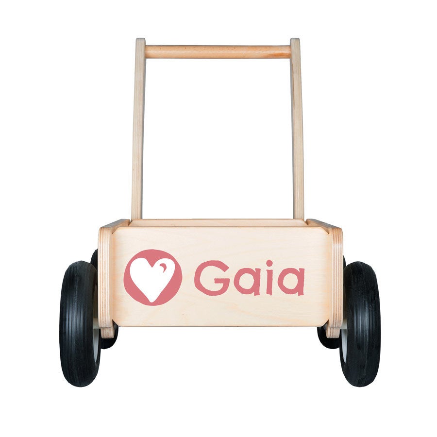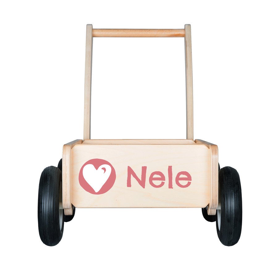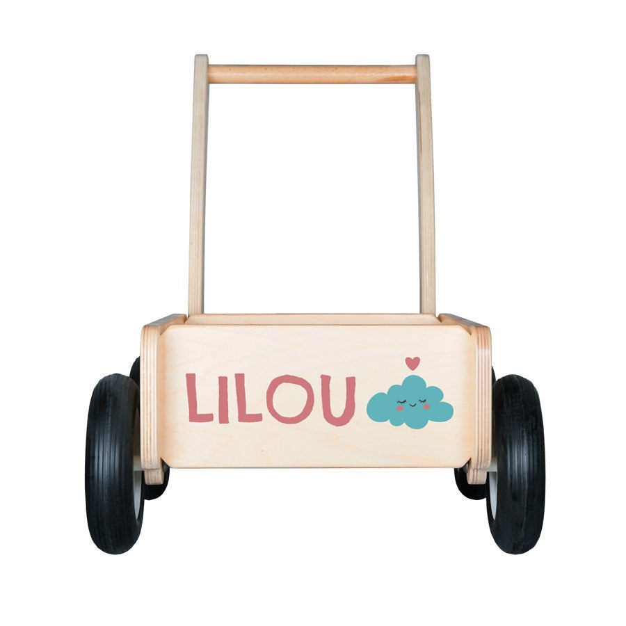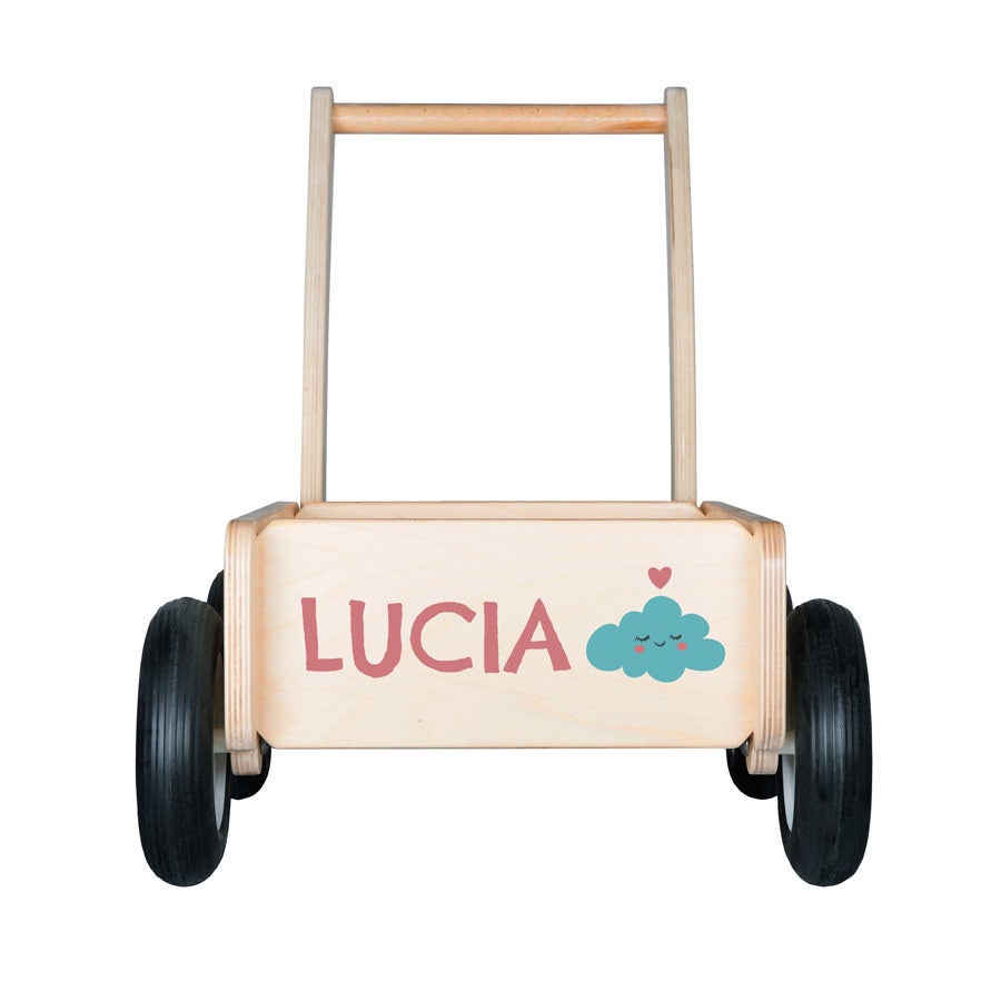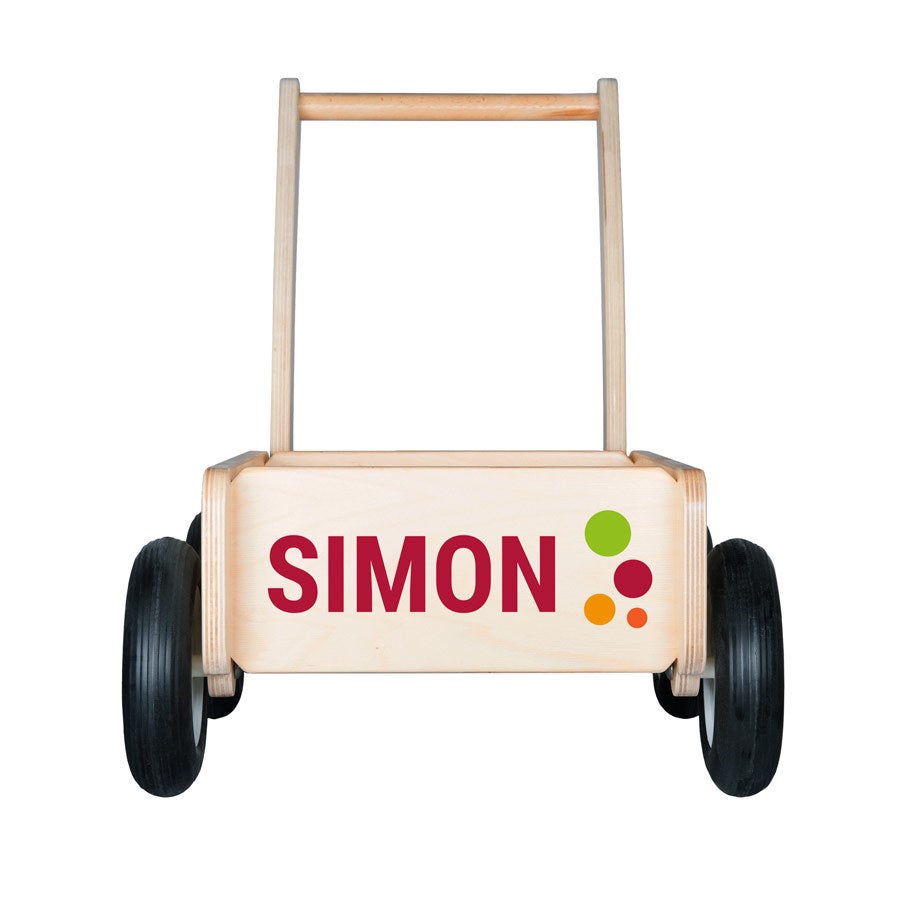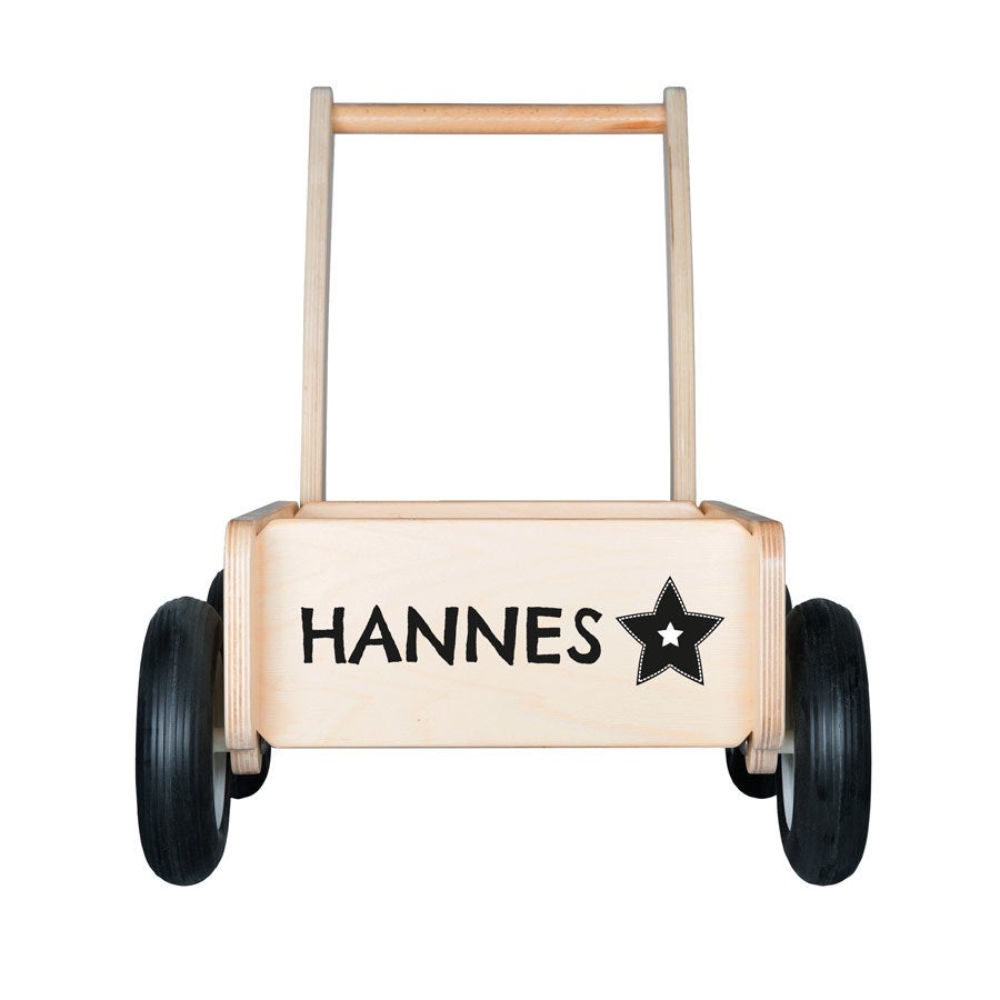Więcej informacji o drewnianym wózku:Rodzaj drewna: Bardzo wytrzymała i odporna na drzazgi sklejka brzozowa z detalami brzozowymi Wymiary kompletnego wózka: 54 x 40 x 29 cm Wymiary pojemnika wewnątrz: 34,5 x 27 x 9,5 cm Waga: ± 2200 gramów Personalizacja: imię/tekst na wysokiej jakości laminowanej folii winylowej Wiek: od 1 roku życia Dodatkowo: z łatwo regulowaną rączką. Zamów również zestaw zabawnie wyglądających kolorowych kołpaków pasujących do wózka.