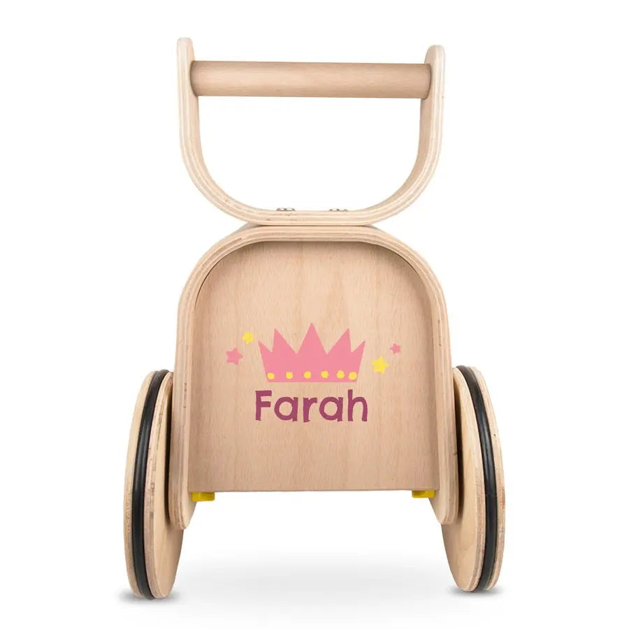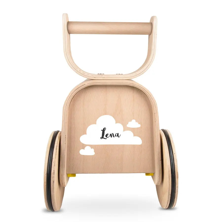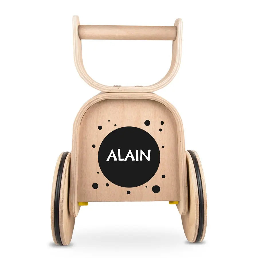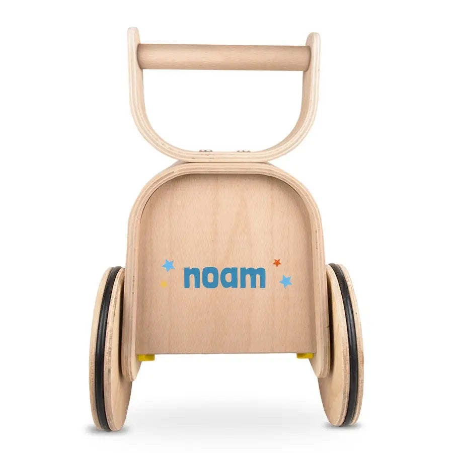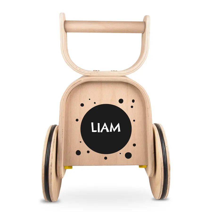 Nauka chodzenia będzie jeszcze przyjemniejsza z tym drewnianym samochodzikiem do pchania. Może służyć jako zabawka do pchania, samochód wyścigowy i schowek na zabawki!Więcej informacji o drewnianym samochodziku do pchania z nadrukiem: Wymiary: 49 x 21 cm Wysokość siedziska: 21 cm Waga: ± 4 kg Rodzaj drewna: superwytrzymały, bezdrewniany multipleks brzozowy Szczegóły: wysokiej jakości drewno brzozowe Wiek: 10 miesięcy + Rodzaj personalizacji: imieniem Miejsce personalizacji: z przodu Sposób personalizacji: wysokiej jakości laminowana folia winylowa Dodatkowo: 3 zabawki w 1; jedź, pchaj i przechowuj! Warto wiedzieć: Koła posiadają gumową wkładkę, dzięki czemu Twój maluch może ścigać się w domu bez nadmiernego hałasu. Możesz również regulować maksymalną prędkość za pomocą dołączonych klipsów.