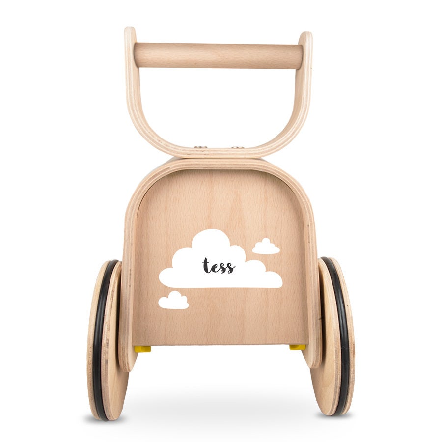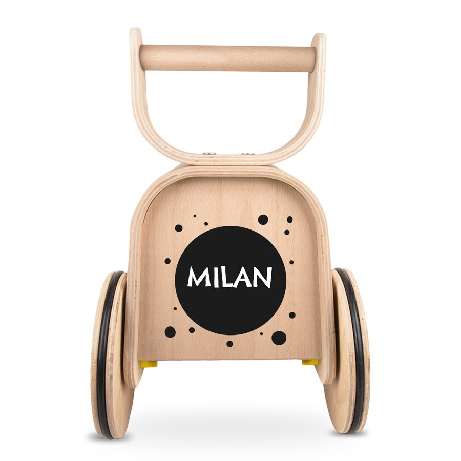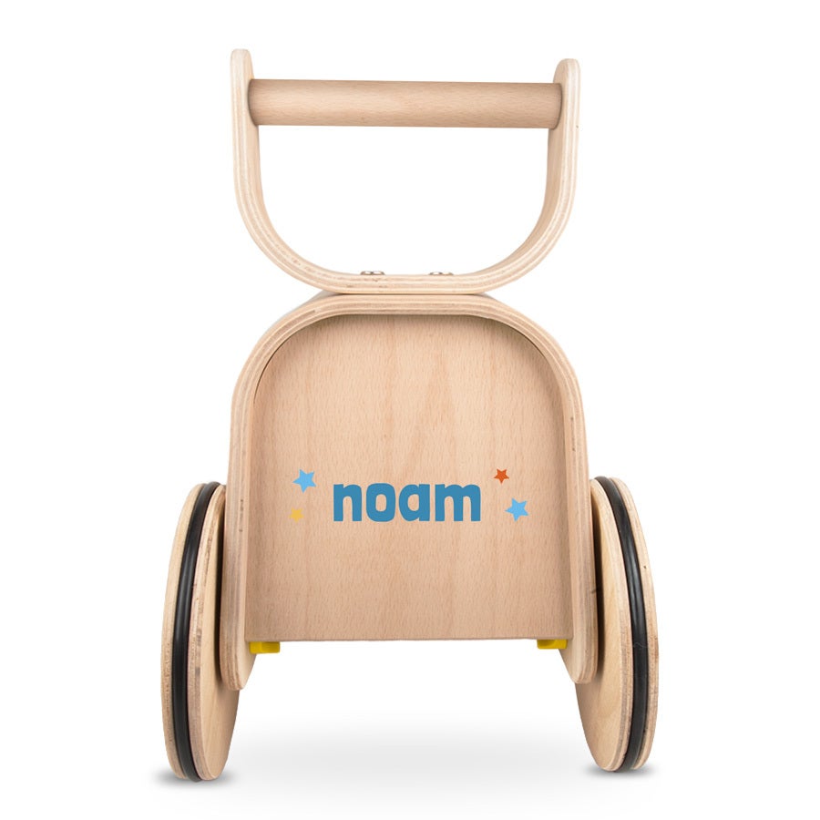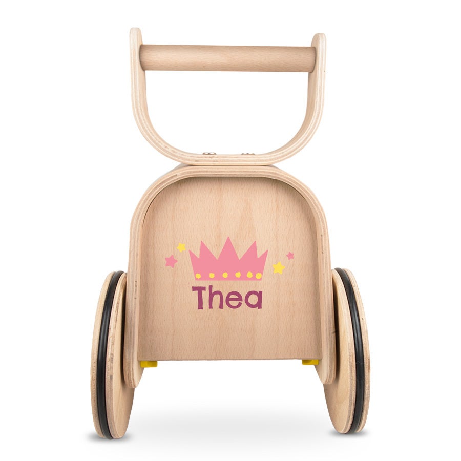 Więcej informacji o drewnianym samochodziku do pchania z nadrukiem: Wymiary: 49 x 21 cm Wysokość siedziska: 21 cm Waga: ± 4 kg Rodzaj drewna: superwytrzymały, bezdrewniany multipleks brzozowy Szczegóły: wysokiej jakości drewno brzozowe Wiek: 10 miesięcy + Rodzaj personalizacji: imieniem Miejsce personalizacji: z przodu Sposób personalizacji: wysokiej jakości laminowana folia winylowa Dodatkowo: 3 zabawki w 1; jedź, pchaj i przechowuj! Warto wiedzieć: Koła posiadają gumową wkładkę, dzięki czemu Twój maluch może ścigać się w domu bez nadmiernego hałasu. Możesz również regulować maksymalną prędkość za pomocą dołączonych klipsów.