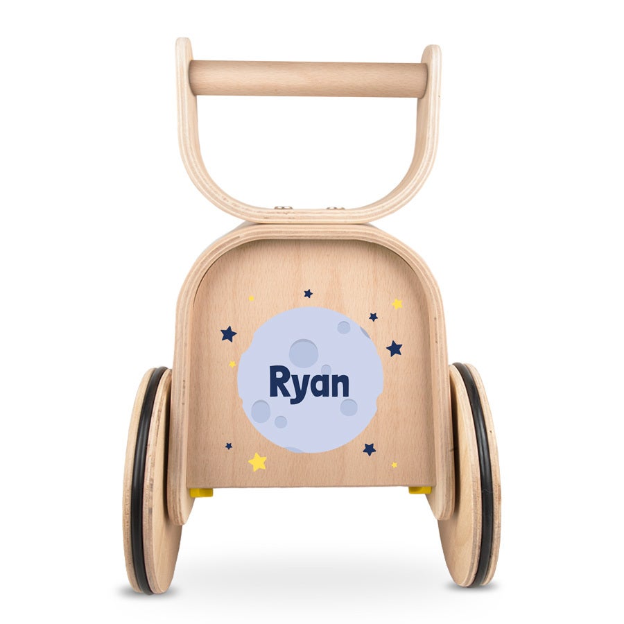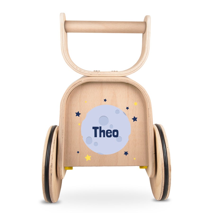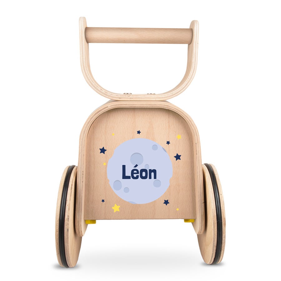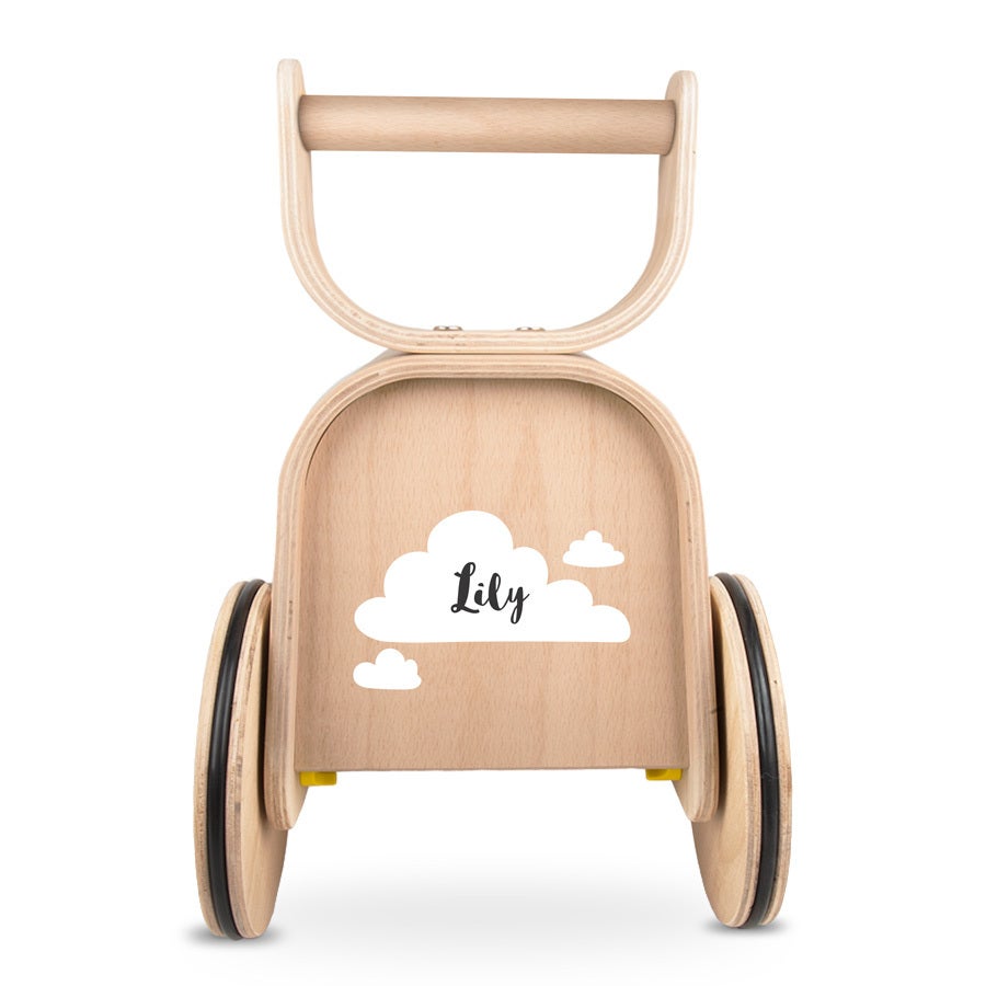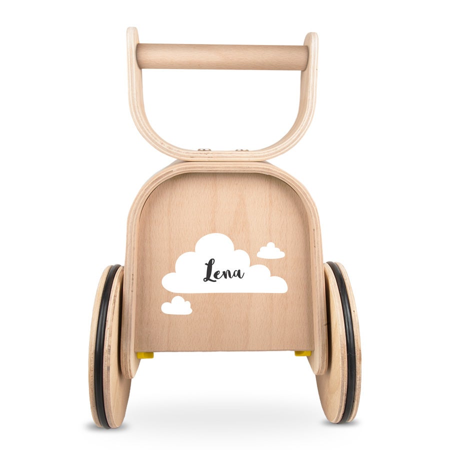 Więcej informacji o drewnianym samochodziku do pchania z nadrukiem: Wymiary: 49 x 21 cm Wysokość siedziska: 21 cm Waga: ± 4 kg Rodzaj drewna: superwytrzymały, bezdrewniany multipleks brzozowy Szczegóły: wysokiej jakości drewno brzozowe Wiek: 10 miesięcy + Rodzaj personalizacji: imieniem Miejsce personalizacji: z przodu Sposób personalizacji: wysokiej jakości laminowana folia winylowa Dodatkowo: 3 zabawki w 1; jedź, pchaj i przechowuj! Warto wiedzieć: Koła posiadają gumową wkładkę, dzięki czemu Twój maluch może ścigać się w domu bez nadmiernego hałasu. Możesz również regulować maksymalną prędkość za pomocą dołączonych klipsów.