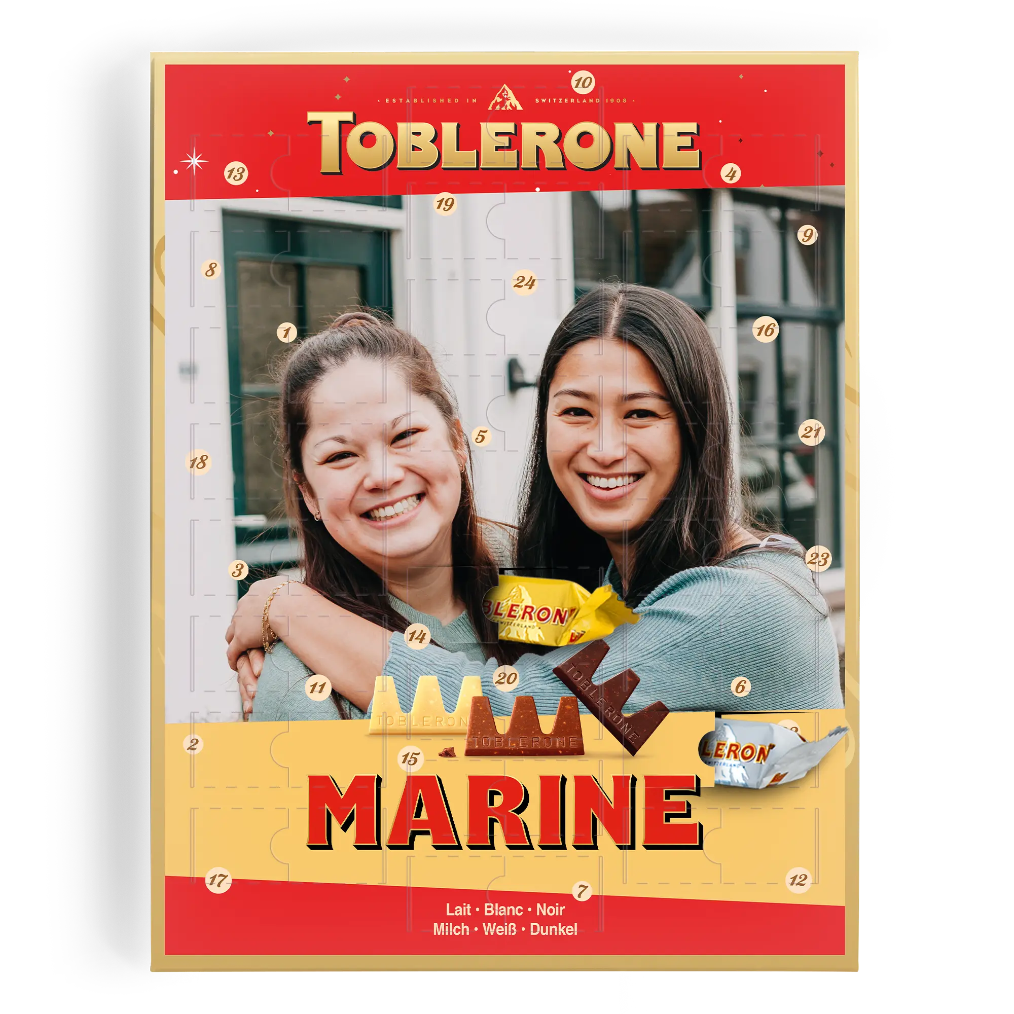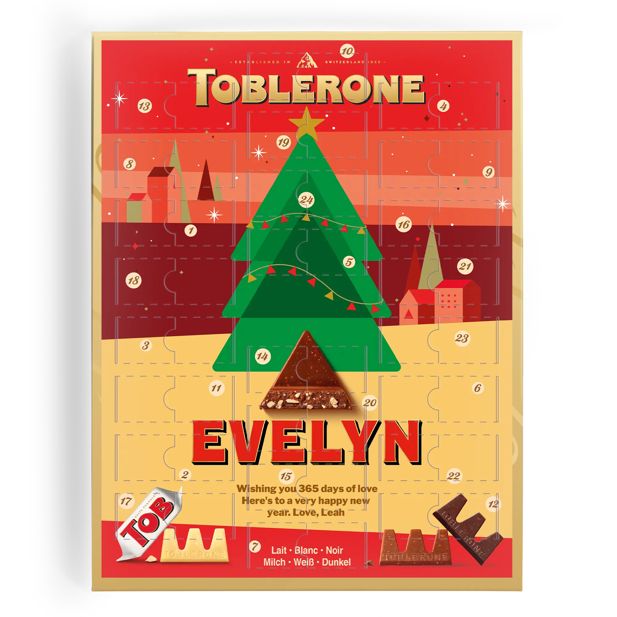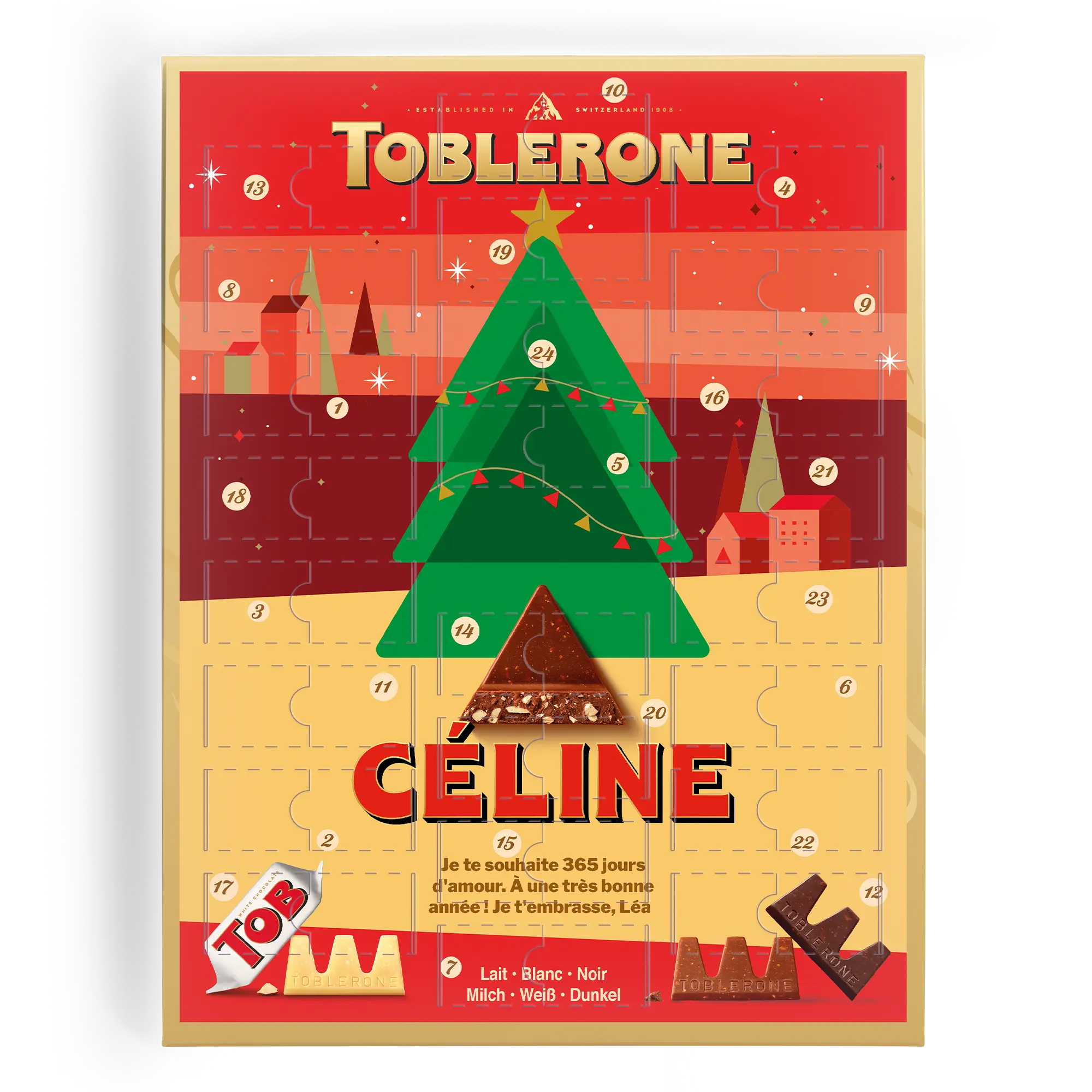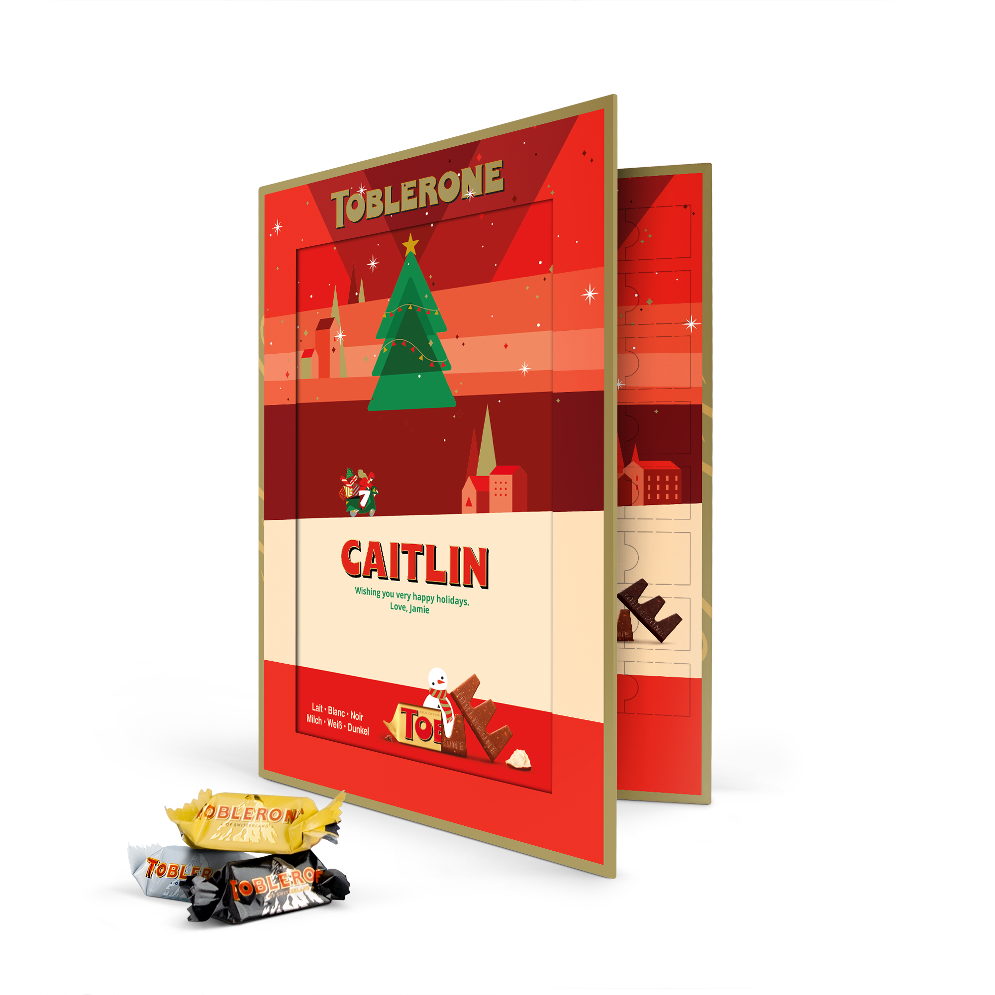 Dla tych, którzy cenią sobie osobisty charakter, Kalendarz Adwentowy Toblerone pozwala odliczać dni do Bożego Narodzenia z 24 pysznymi czekoladkami. Dodaj imię, zdjęcie lub logo, aby stworzyć naprawdę wyjątkowy prezent.
