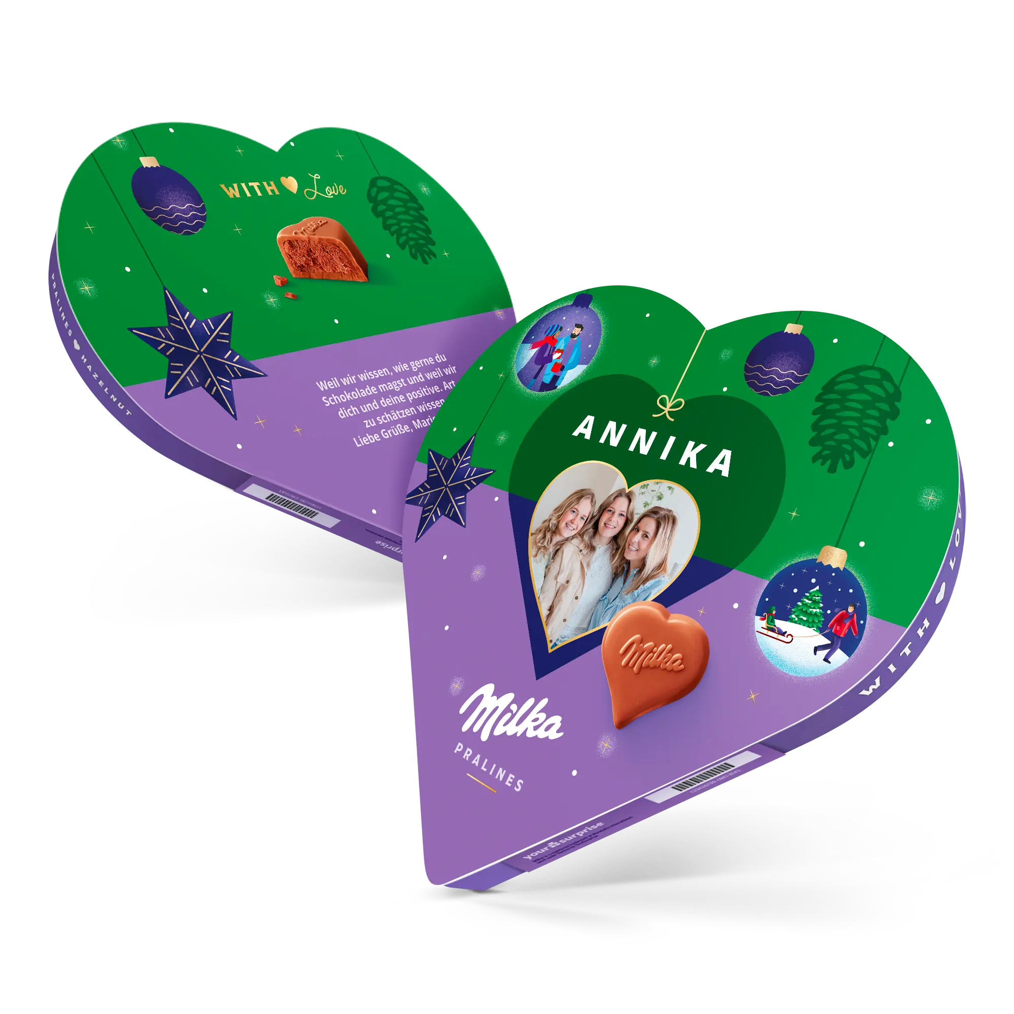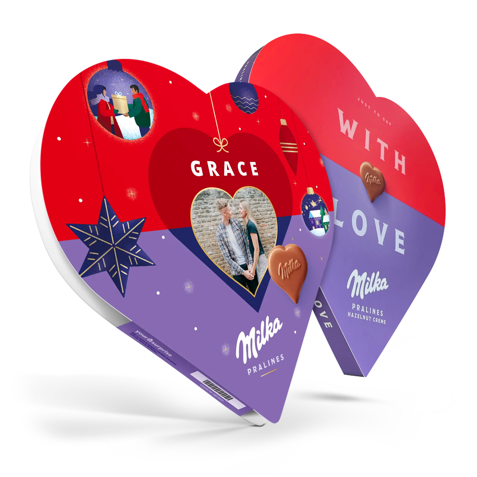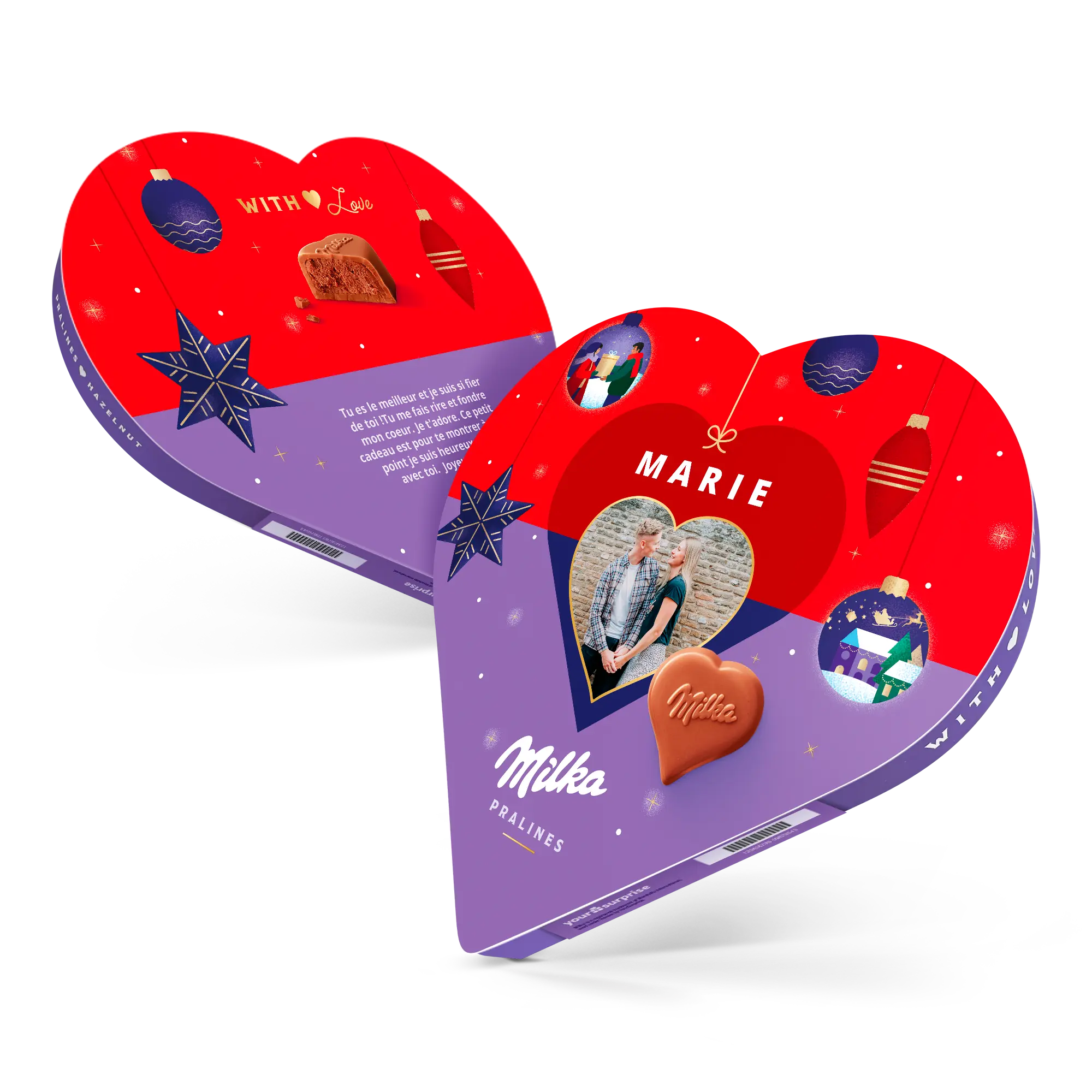 Najlepszy prezent świąteczny dla miłośników czekolady: serce Milka z imieniem i/lub zdjęciem z 30 czekoladkami.Więcej informacji na temat serca Milka:Czekolada: czekoladowe praliny w kształcie sercNadzienie: krem nugatowo-orzechowyWaga: 187 gramówWymiary: 24 x 25,5 cmPersonalizacja: zdjęciem, imieniem i wiadomościąDruk: idealny i w pełnym kolorzeZ przyczyn technicznych nie można używać znaków cyrylicy, azjatyckich, arabskich, tureckich, greckich ani znaków specjalnych.Składniki: Cukier, masło kakaowe, olej palmowy, miazga kakaowa, serwatka w proszku (mleko), odtłuszczone mleko w proszku, tłuszcz mleczny, 5% pasty z orzechów laskowych, emulgatory (lecytyna sojowa, E476), aromaty (zawierające mleko). Alergeny: Zawiera orzechy laskowe, mleko i soję. Może zawierać (śladowe ilości) innych orzechów.